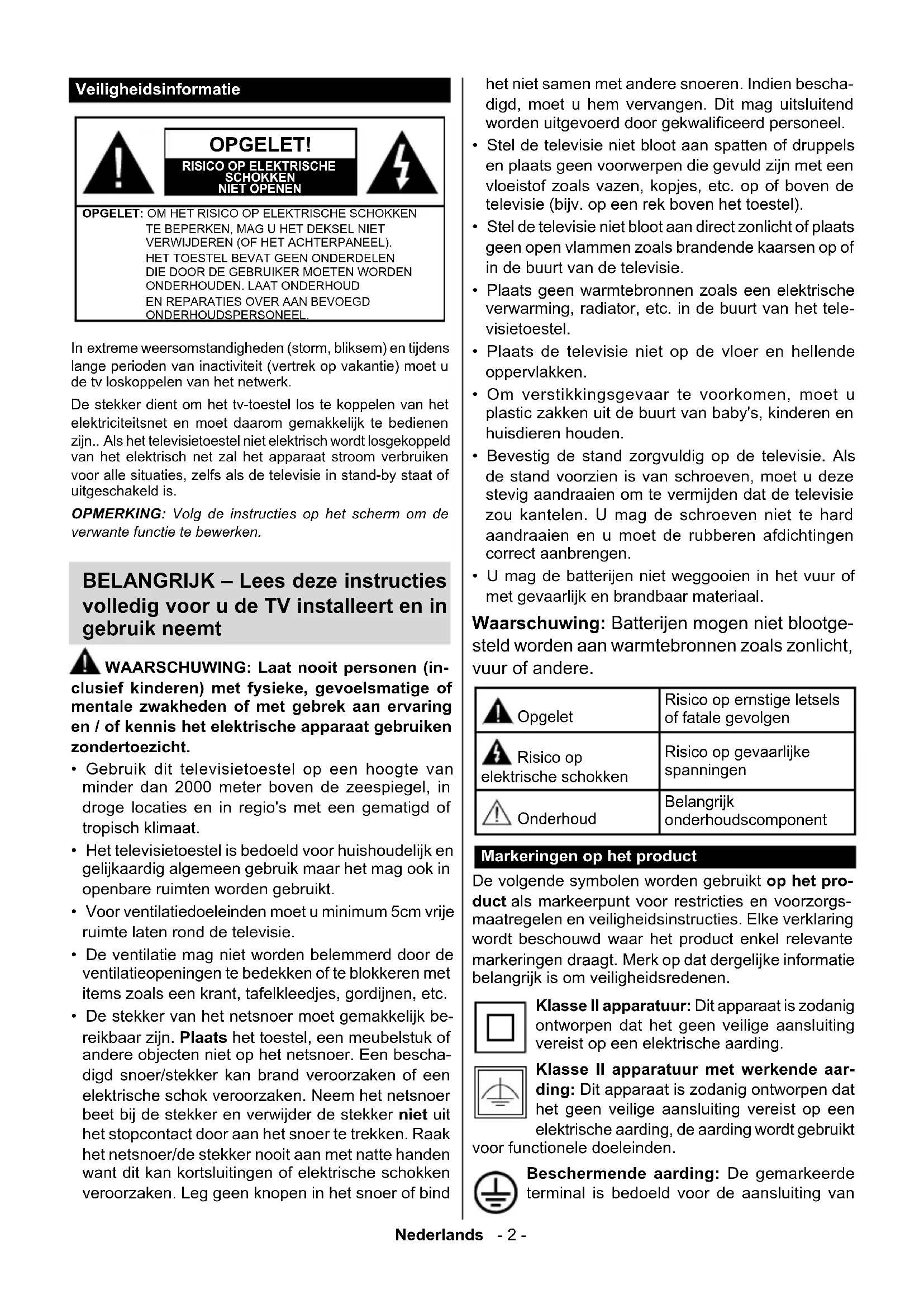 Smart Center ......................................................... 30Nederlands - 2 - Veiligheidsinformatie OPGELET! RISICO OP ELEKTRISCHE SCHOKKENNIET OPENENOPGELET: OM HET RISICO OP ELEKTRISCHE SCHOKKEN TE BEPERKEN, MAG U HET DEKSEL NIET VERWIJDEREN (OF HET ACHTERPANEEL). HET TOESTEL BEVAT GEEN ONDERDELEN DIE DOOR DE GEBRUIKER MOETEN WORDEN ONDERHOUDEN. LAAT ONDERHOUD EN REPARATIES OVER AAN BEVOEGD ONDERHOUDSPERSONEEL.OPMERKING: Volg de instructies op het scherm om de verwante functie te bewerken.In extreme weersomstandigheden (storm, bliksem) en tijdens lange perioden van inactiviteit (vertrek op vakantie) moet u de tv loskoppelen van het netwerk.De stekker dient om het tv-toestel los te koppelen van het elektriciteitsnet en moet daarom gemakkelijk te bedienen zijn.. Als het televisietoestel niet elektrisch wordt losgekoppeld van het elektrisch net zal het apparaat stroom verbruiken voor alle situaties, zelfs als de televisie in stand-by staat of uitgeschakeld is. BELANGRIJK – Lees deze instructies volledig voor u de TV installeert en in gebruik neemt WAARSCHUWING: Laat nooit personen (in- clusief kinderen) met fysieke, gevoelsmatige of mentale zwakheden of met gebrek aan ervaring en / of kennis het elektrische apparaat gebruiken zondertoezicht.