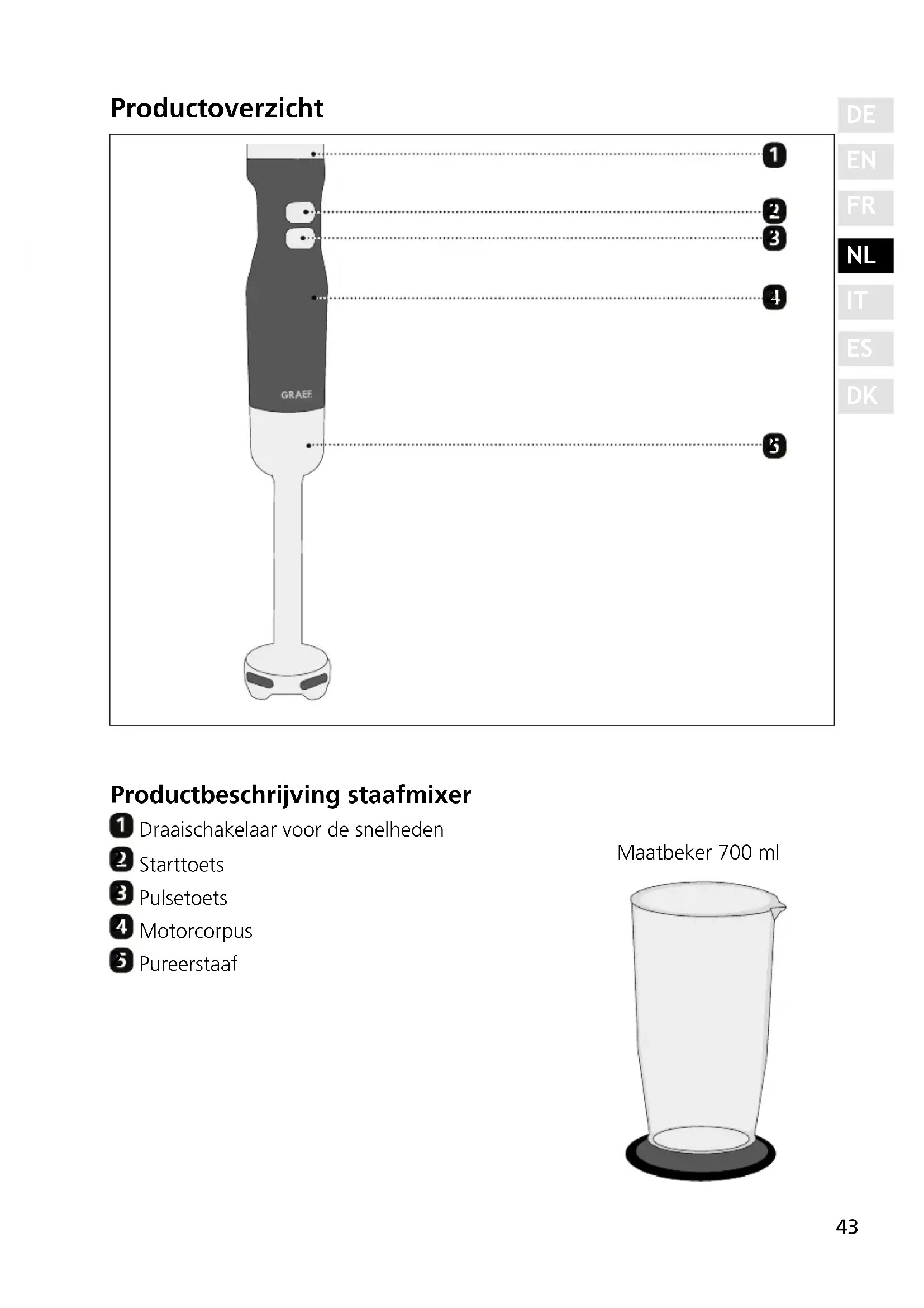 - Reiniging van het apparaat belast zn. Bewaar deze handleiding en geef ze met het apparaat aan de volgende eigenaar verder. Deze handleiding kan geen rekening houden met elk denkbaar gebruik. Voor verdere informatie of b problemen, welke in deze handleiding niet of onvol- doende gedetailleerd worden behandeld, kunt u contact opnemen met de Graef klantendienst of uw vakhandel. Gebruik volgens de voorschriften Dit apparaat is niet voor industrieel gebruik bestemd. Gebruik de staafmixer alleen in gesloten ruimtes. Gebruik het apparaat alleen voor het ver- werken van voedsel. Elk ander of aanvullend gebruik geldt als niet doelmatig. Dit apparaat is alleen bestemd voor het gebruik in huishoudens. Een oneigenlk en/of ander soort gebruik van het apparaat is gevaarlk.