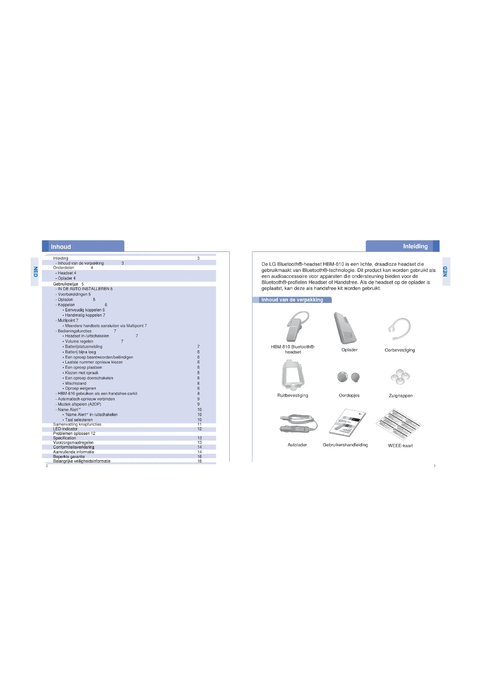 - Taal selecteren 10 Samenvatting knopfuncties 11 LED-indicator 12 Problemen oplossen 12 Specification 13 Voorzorgsmaatregelen 13 Conformiteitsverklaring 14 Aanvullende informatie 14 Beperkte garantie 16 Belangrijke veiligheidsinformatie 16 HBM-810 Bluetooth®- headset Oorbevestiging Oplader Ruitbevestiging WEEE-kaart Autolader Oordopjes Zuignappen Gebruikershandleiding NED NEDOplader
