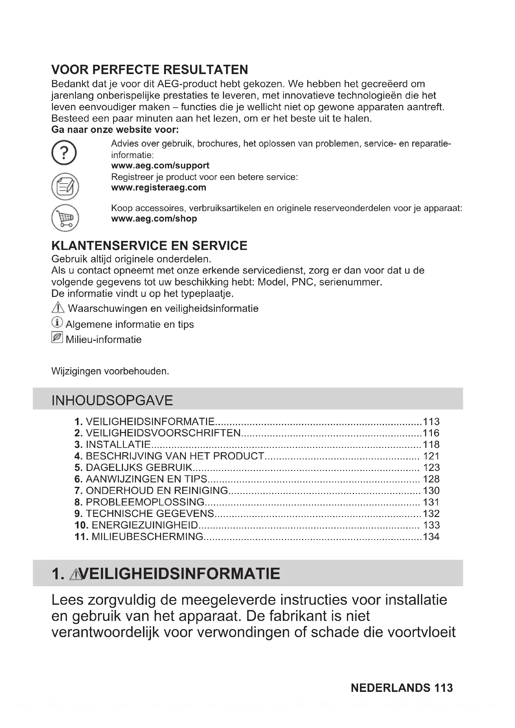 Bedankt dat je voor dit AEG-product hebt gekozen. We hebben het gecreëerd omjarenlang onberispelijke prestaties te leveren, met innovatieve technologieën die hetleven eenvoudiger maken – functies die je wellicht niet op gewone apparaten aantreft.Besteed een paar minuten aan het lezen, om er het beste uit te halen.Ga naar onze website voor:Advies over gebruik, brochures, het oplossen van problemen, service- en reparatie-informatie:www.aeg.com/supportRegistreer je product voor een betere service:www.registeraeg.comKoop accessoires, verbruiksartikelen en originele reserveonderdelen voor je apparaat:www.aeg.com/shop