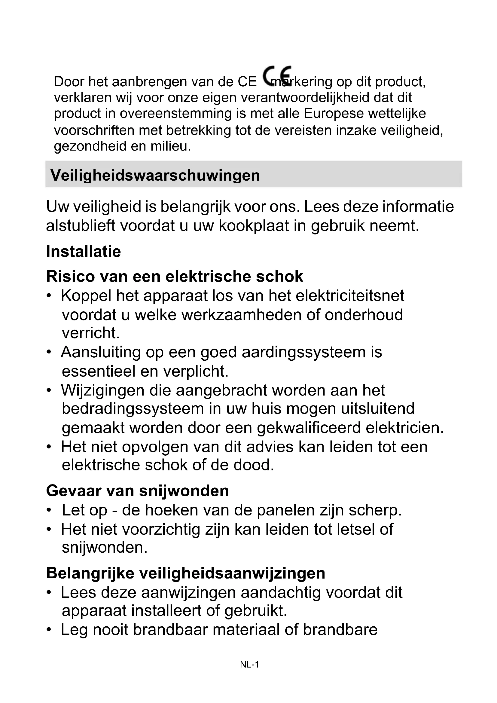 απορρίμματα. Η συλλογή αυτών των προϊόντων γίνεται ξεχωριστά λόγω του ότι απαιτείται ειδική επεξεργασία. GR-37NL-1 Door het aanbrengen van de CE -markering op dit product, verklaren wij voor onze eigen verantwoordelijkheid dat dit product in overeenstemming is met alle Europese wettelijke voorschriften met betrekking tot de vereisten inzake veiligheid, gezondheid en milieu. Veiligheidswaarschuwingen Uw veiligheid is belangrijk voor ons. Lees deze informatie alstublieft voordat u uw kookplaat in gebruik neemt. Installatie Risico van een elektrische schok