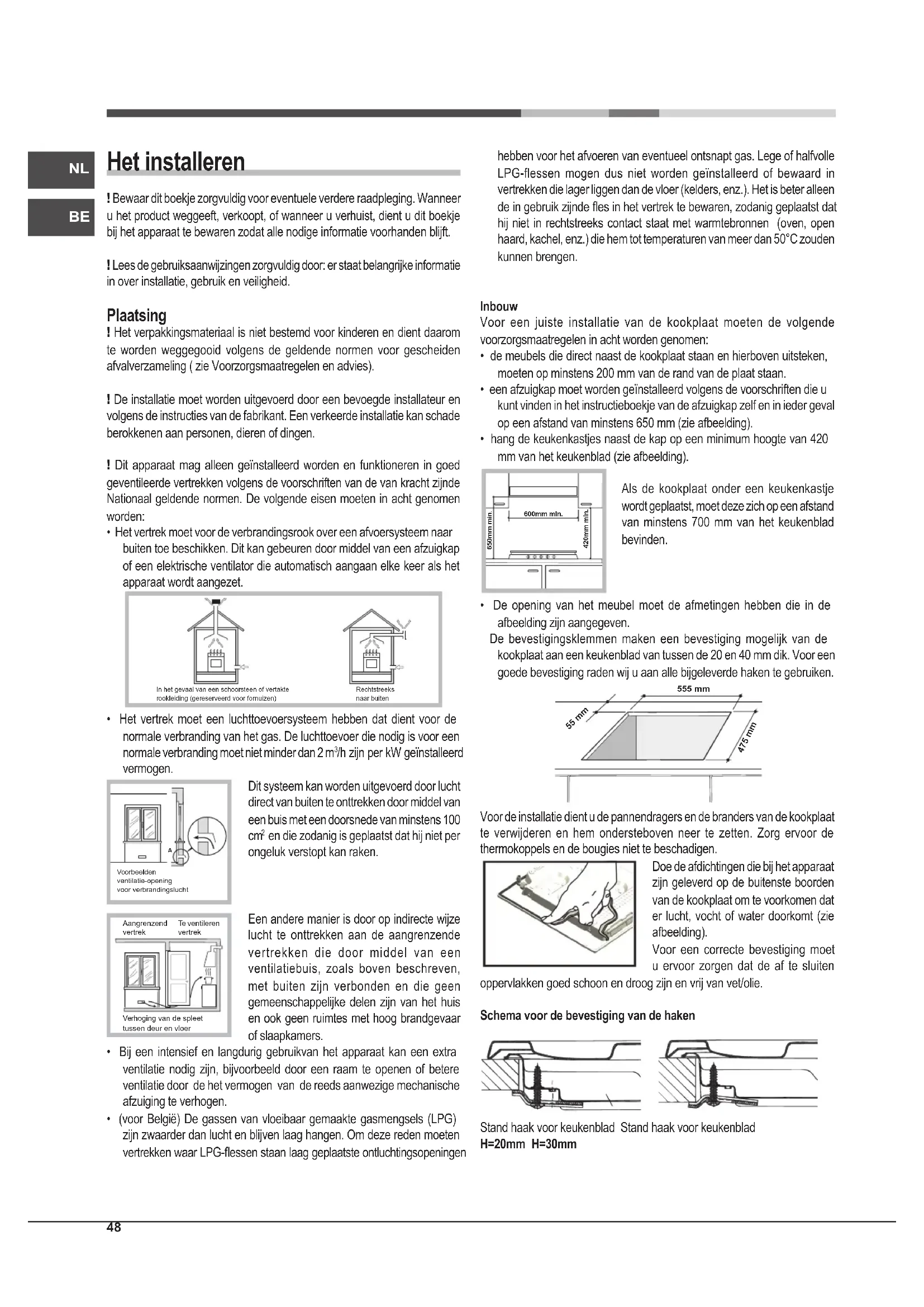 - Gasfornuizen hebben voor een goede werking behoefte aan een regelmatige luchtverversing. Controleer dat bij het installeren aan de vereisten wordt voldaan beschreven in de paragraaf “Plaatsing”.