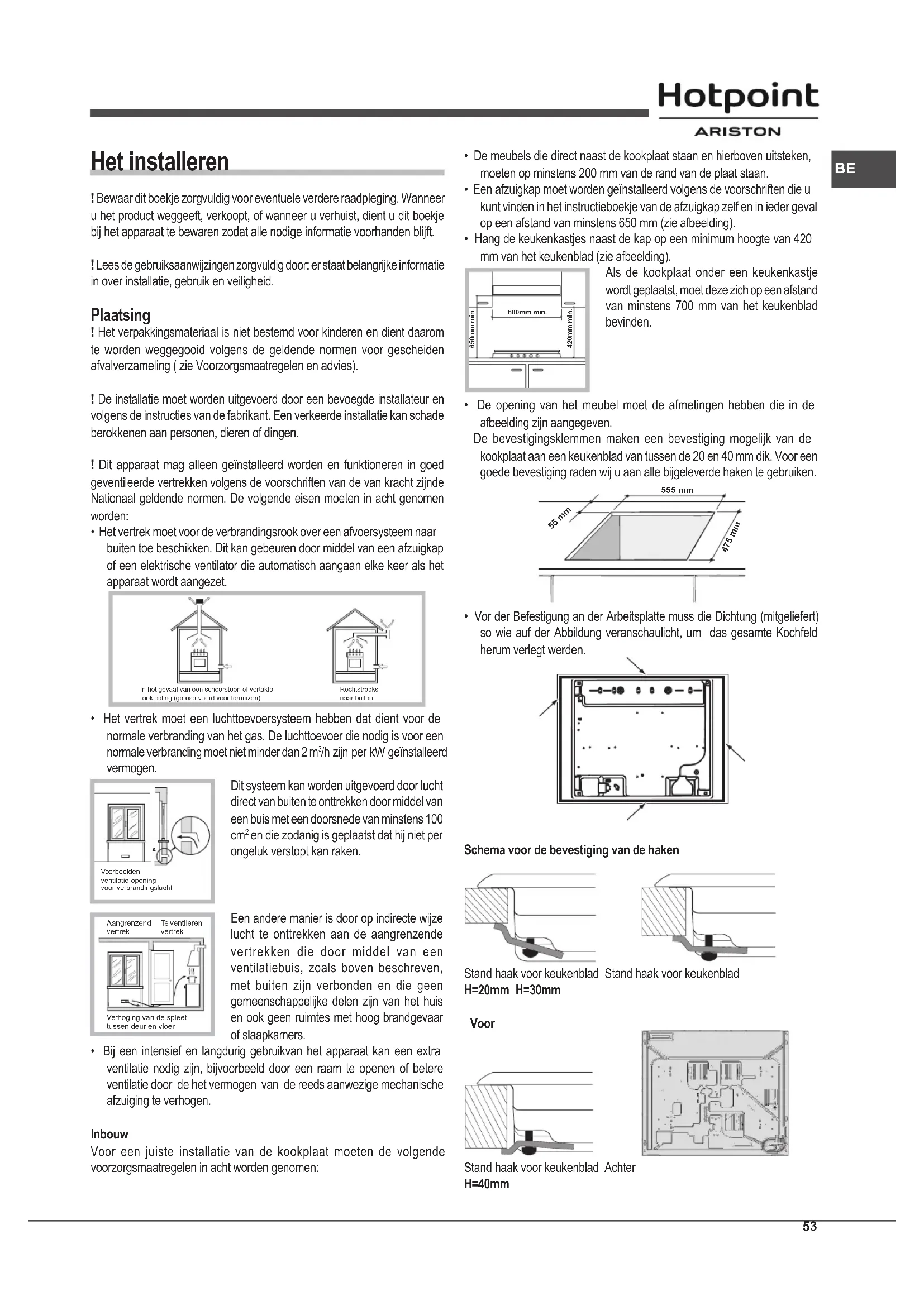- Bij een intensief en langdurig gebruikvan het apparaat kan een extra ventilatie nodig zijn, bijvoorbeeld door een raam te openen of betere ventilatie door de het vermogen van de reeds aanwezige mechanische afzuiging te verhogen. Inbouw Voor een juiste installatie van de kookplaat moeten de volgende voorzorgsmaatregelen in acht worden genomen: