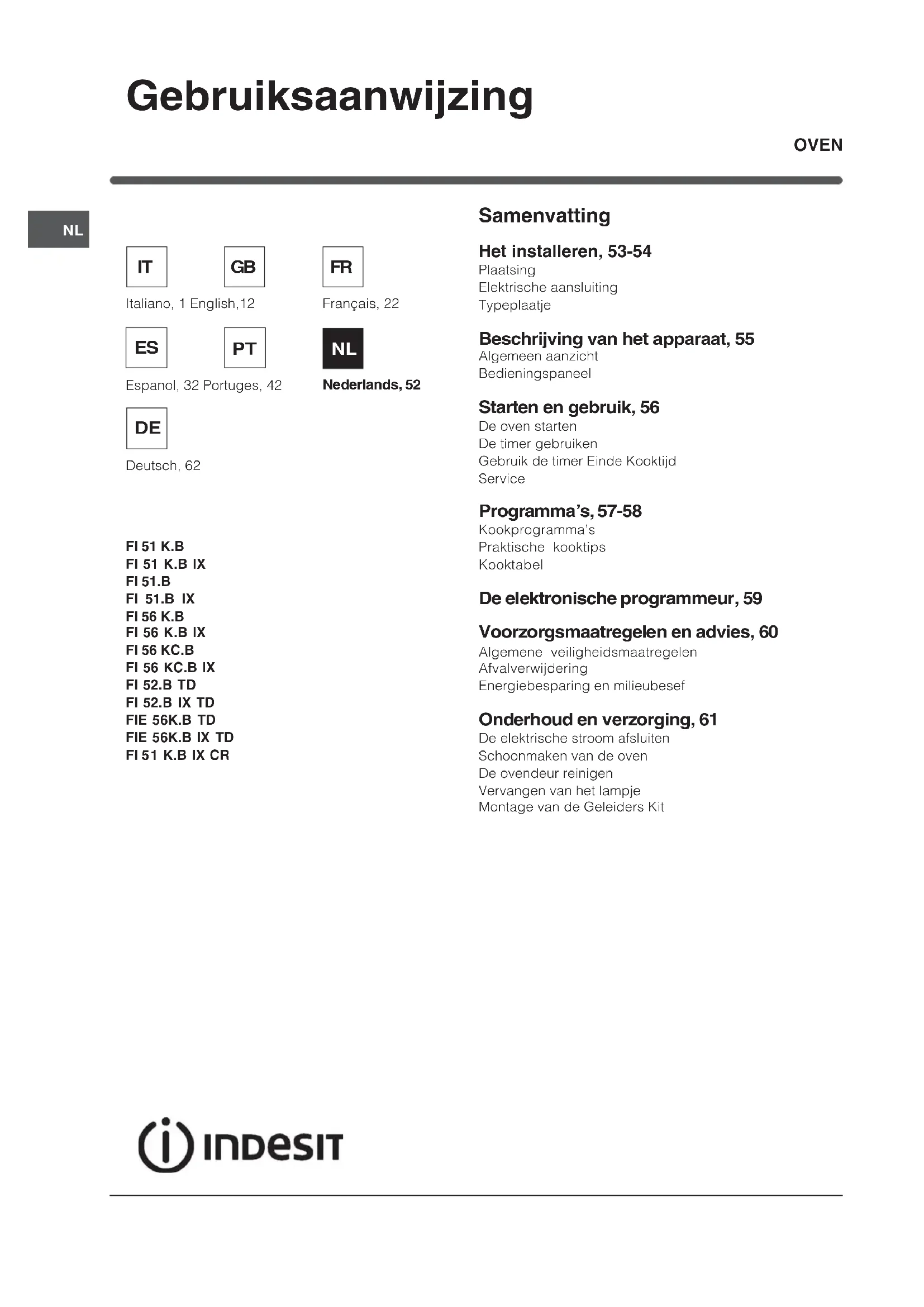 FI 5 1 K.B IX CR Samenvatting Het installeren, 53-54 Plaatsing Elektrische aansluiting Typeplaatje Beschrijving van het apparaat, 55 Algemeen aanzicht Bedieningspaneel Starten en gebruik, 56 De oven starten De timer gebruiken Gebruik de timer Einde Kooktijd Service Programmas, 57-58 Kookprogrammas Praktische kooktips Kooktabel De elektronische programmeur, 59 Voorzorgsmaatregelen en advies, 60 Algemene veiligheidsmaatregelen Afvalverwijdering Energiebesparing en milieubesef Onderhoud en verzorging, 61 De elektrische stroom afsluiten Schoonmaken van de oven De ovendeur reinigen Vervangen van het lampje Montage van de Geleiders Kit Gebruiksaanwijzing OVEN