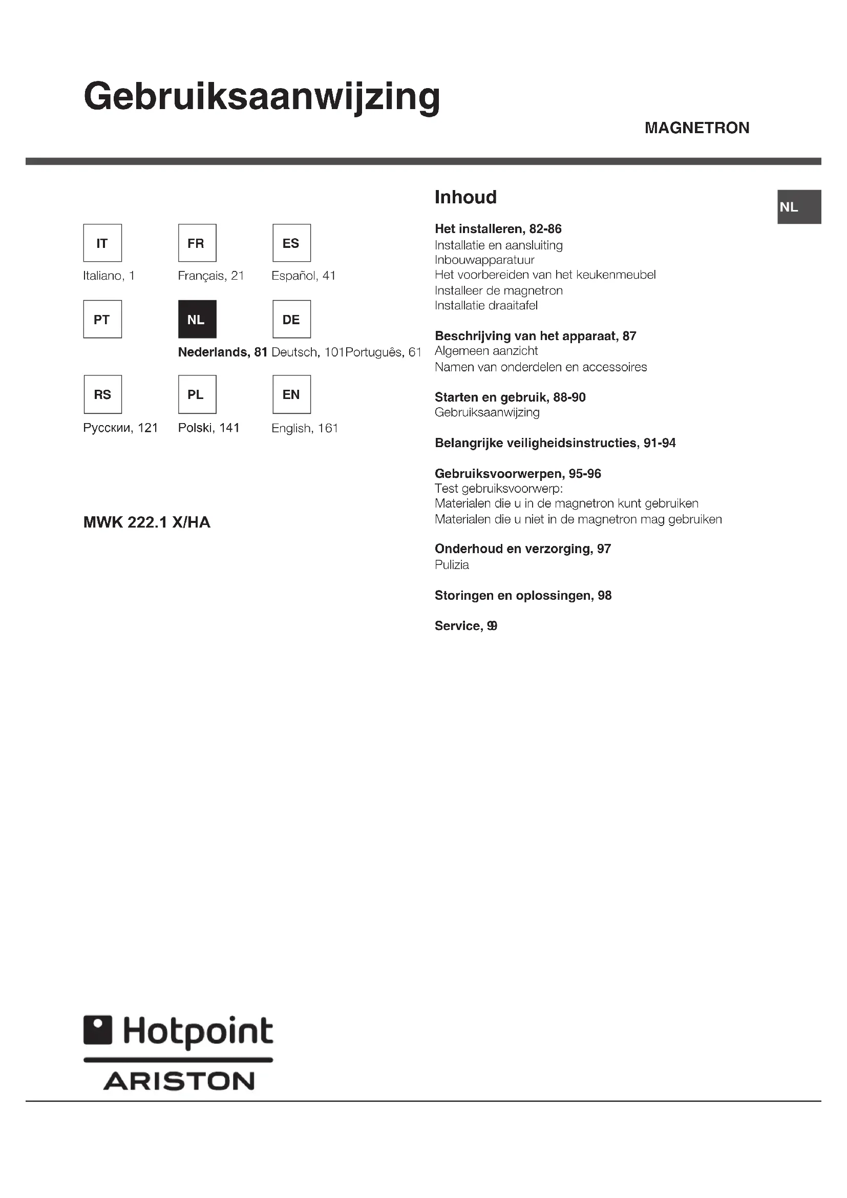 Vind de handleiding van het apparaat gratis MWK 222.1 XHA HOTPOINT-ARISTON in PDF-formaat.