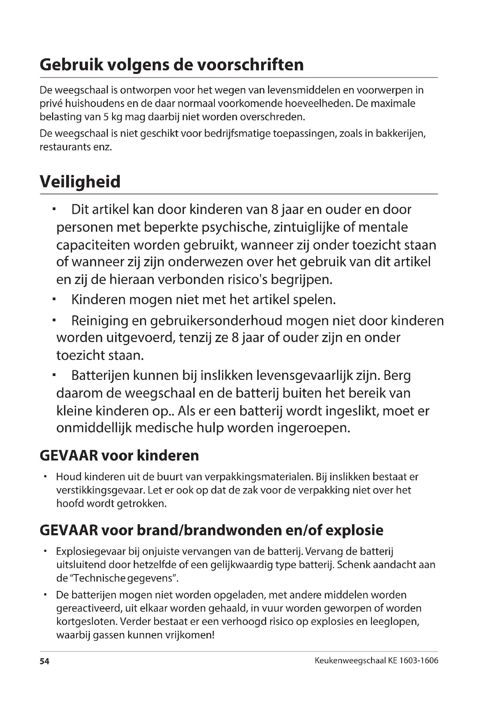 Keukenweegschaal KE 1603-1606 Gebruik volgens de voorschriften De weegschaal is ontworpen voor het wegen van levensmiddelen en voorwerpen in privé huishoudens en de daar normaal voorkomende hoeveelheden. De maximale belasting van 5 kg mag daarbij niet worden overschreden. De weegschaal is niet geschikt voor bedrijfsmatige toepassingen, zoals in bakkerijen, restaurants enz. Veiligheid Dit artikel kan door kinderen van 8 jaar en ouder en door personen met beperkte psychische, zintuiglijke of mentale capaciteiten worden gebruikt, wanneer zij onder toezicht staan of wanneer zij zijn onderwezen over het gebruik van dit artikel en zij de hieraan verbonden risico's begrijpen. Kinderen mogen niet met het artikel spelen. Reiniging en gebruikersonderhoud mogen niet door kinderen worden uitgevoerd, tenzij ze 8 jaar of ouder zijn en onder toezicht staan. Batterijen kunnen bij inslikken levensgevaarlijk zijn. Berg daarom de weegschaal en de batterij buiten het bereik van kleine kinderen op.. Als er een batterij wordt ingeslikt, moet er onmiddellijk medische hulp worden ingeroepen. GEVAAR voor kinderen Houd kinderen uit de buurt van verpakkingsmaterialen. Bij inslikken bestaat er verstikkingsgevaar. Let er ook op dat de zak voor de verpakking niet over het hoofd wordt getrokken. GEVAAR voor brand/brandwonden en/of explosie Explosiegevaar bij onjuiste vervangen van de batterij. Vervang de batterij uitsluitend door hetzelfde of een gelijkwaardig type batterij. Schenk aandacht aan de “Technische gegevens”. De batterijen mogen niet worden opgeladen, met andere middelen worden gereactiveerd, uit elkaar worden gehaald, in vuur worden geworpen of worden kortgesloten. Verder bestaat er een verhoogd risico op explosies en leeglopen, waarbij gassen kunnen vrijkomen! Druckbuch Kuechenwaagen DIV.indb 54 13.04.2016 13:19:41Veiligheid