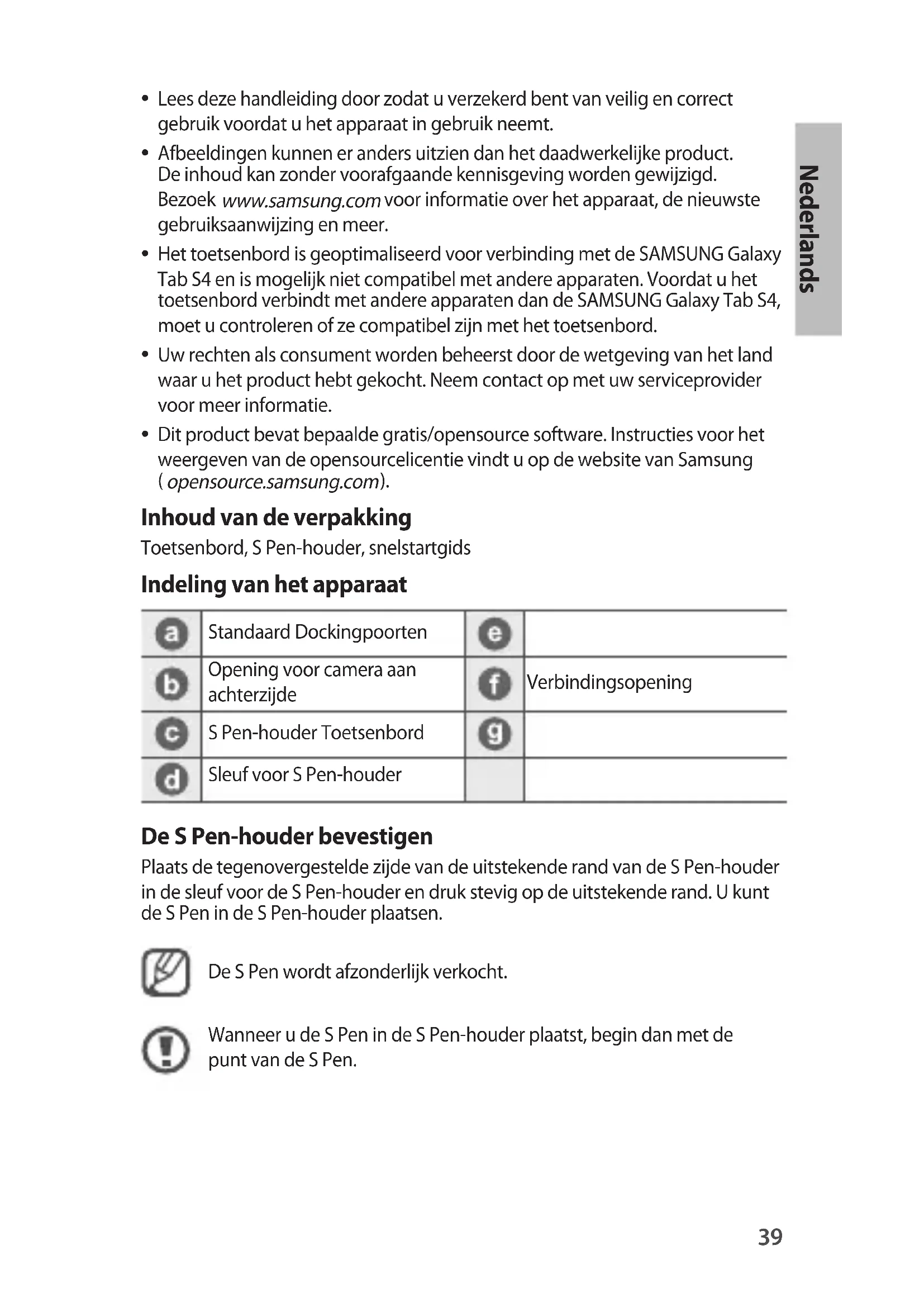 Inhoud van de verpakking Toetsenbord, S Pen-houder, snelstartgids Indeling van het apparaat Standaard Dockingpoorten Opening voor camera aan achterzijde Verbindingsopening S Pen-houder Toetsenbord Sleuf voor S Pen-houder De S Pen-houder bevestigen Plaats de tegenovergestelde zijde van de uitstekende rand van de S Pen-houder in de sleuf voor de S Pen-houder en druk stevig op de uitstekende rand. U kunt de S Pen in de S Pen-houder plaatsen. De S Pen wordt afzonderlijk verkocht. Wanneer u de S Pen in de S Pen-houder plaatst, begin dan met de punt van de S Pen.40 Het toetsenbord verbinden Wanneer u het toetsenbord verbindt met een tablet, kunt u tekens ingeven zonder op het scherm van de tablet te drukken. Als u de standaard van het toetsenbord gebruikt, kunt u het toetsenbord ook gebruiken als houder voor de tablet.