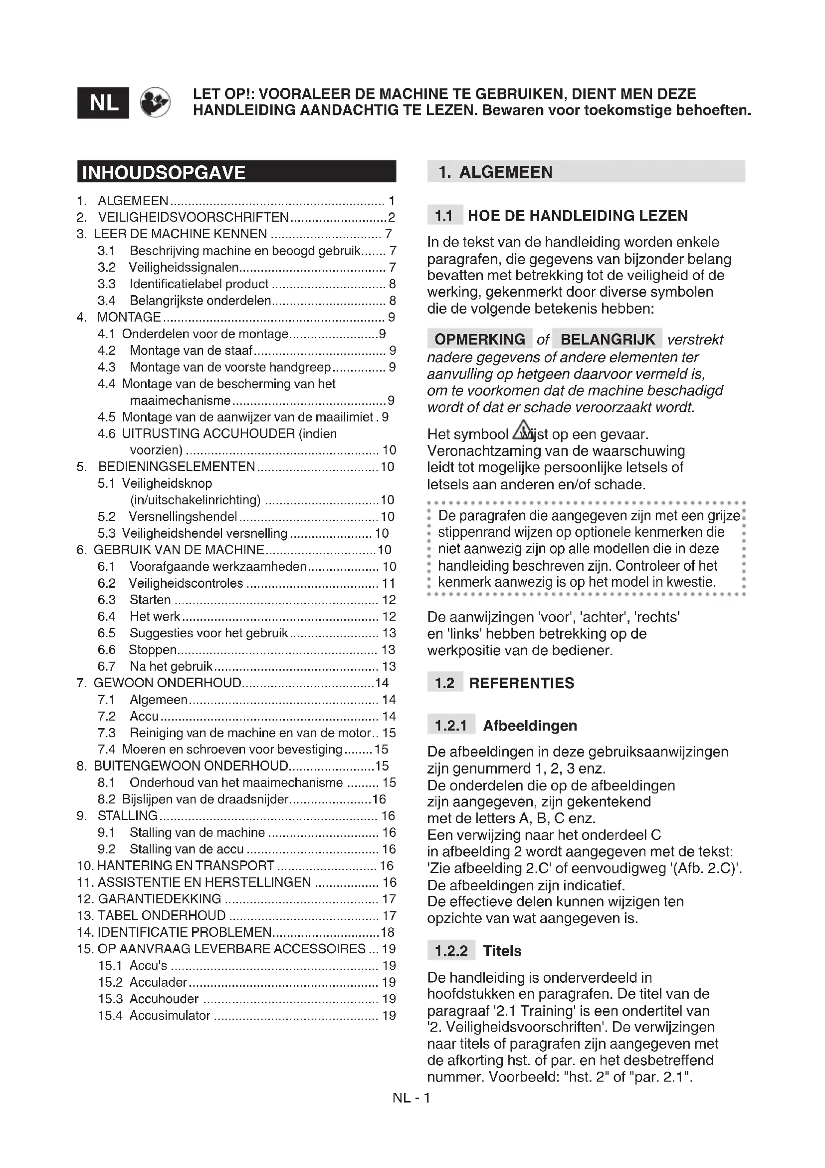 - Let erop niet hard met het maaimechanisme tegen vreemde voorwerpen/hindernissen te stoten. Indien de snij-inrichting een hindernis/voorwerp tegenkomt, kanNL - 4 er zich een terugslag (kickback) voordoen. Dit kan een zeer snelle sprong in de tegenovergestelde richting veroorzaken, en het maaimechanisme naar boven en naar de bediener toe duwen. Door de terugslag kan men de controle over de machine verliezen, met mogelijk ernstige gevolgen. Om terugslag te voorkomen, dienen de volgende voorzorgsmaatregelen genomen te worden: – Houd de machine stevig vast, met twee handen, en houd uw lichaam en armen in een positie die u toestaat te weerstaan aan de kracht van de tegenslag. – Steek de armen niet te hoog uit en maai niet boven het niveau van de riem. – Gebruik enkel de door de fabrikant aangegeven snij-inrichtingen. – Volg de aanwijzingen van de fabrikant met betrekking op het onderhoud van het maaimechanisme.