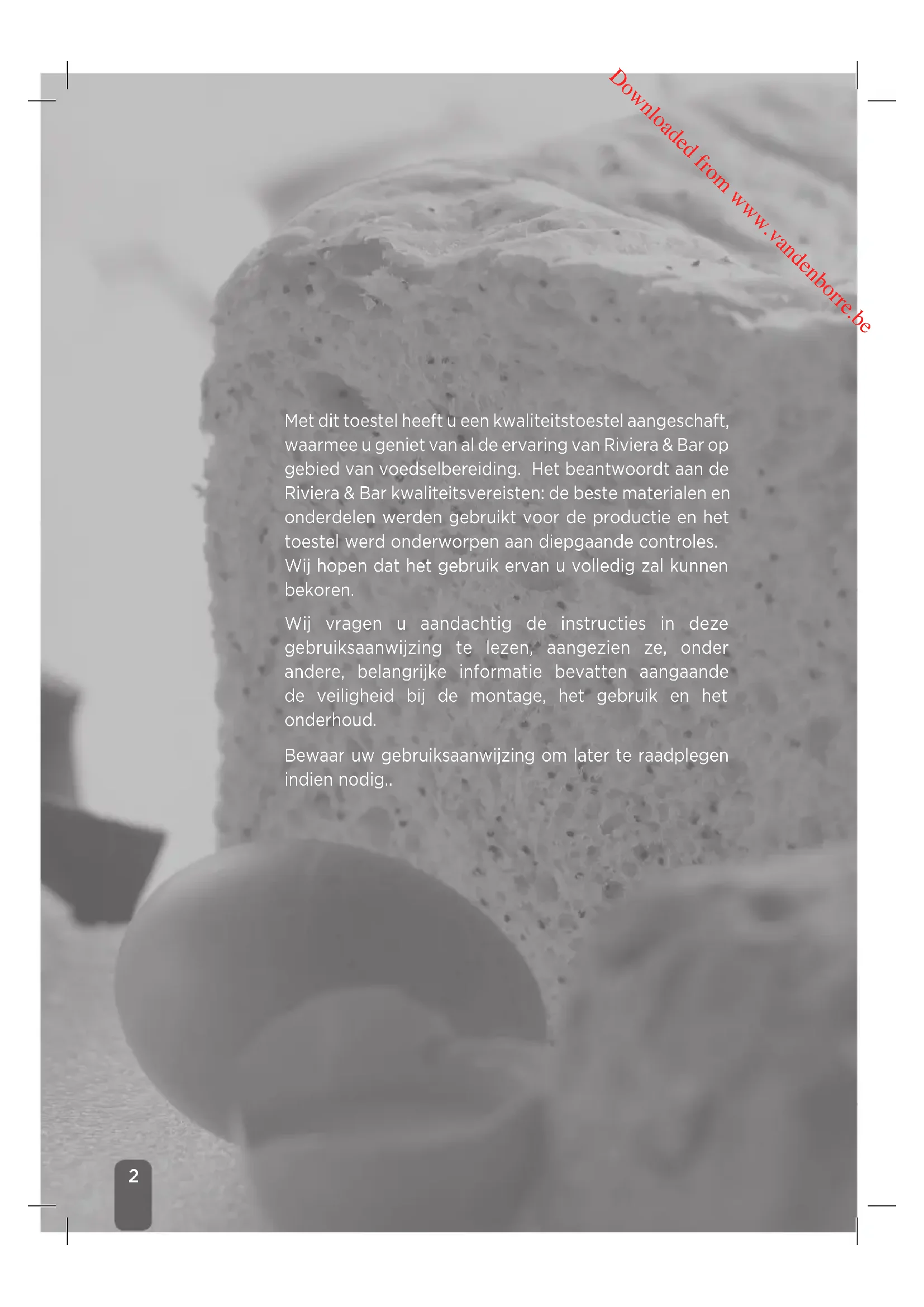 Gebruiksaanwijzing Société ARB Parc d’Activités “Les Découvertes” 8 rue Thomas Edison CS 51079 - 67452 Mundolsheim Cedex Tél. : 03 88 18 66 18 www.riviera-et-bar.fr - info@arb-sas.fr Document et visuels non contractuels - Caractéristiques susceptibles d’être modifiées sans préavis. Juin 2019 - V2 Downloaded from www.vandenborre.beGebruiksaanwijzing Société ARB Parc d’Activités “Les Découvertes” 8 rue Thomas Edison CS 51079 - 67452 Mundolsheim Cedex Tél. : 03 88 18 66 18 www.riviera-et-bar.fr - info@arb-sas.fr Document et visuels non contractuels - Caractéristiques susceptibles d’être modifiées sans préavis. Juin 2019 - V2 Broodbakmachine Glutenvrij & co Ivoorwit MP 579 A Downloaded from www.vandenborre.be2 Met dit toestel heeft u een kwaliteitstoestel aangeschaft, waarmee u geniet van al de ervaring van Riviera & Bar op gebied van voedselbereiding. Het beantwoordt aan de Riviera & Bar kwaliteitsvereisten: de beste materialen en onderdelen werden gebruikt voor de productie en het toestel werd onderworpen aan diepgaande controles. Wij hopen dat het gebruik ervan u volledig zal kunnen bekoren. Wij vragen u aandachtig de instructies in deze gebruiksaanwijzing te lezen, aangezien ze, onder andere, belangrijke informatie bevatten aangaande de veiligheid bij de montage, het gebruik en het onderhoud. Bewaar uw gebruiksaanwijzing om later te raadplegen indien nodig.. Downloaded from www.vandenborre.beInhoudstabel