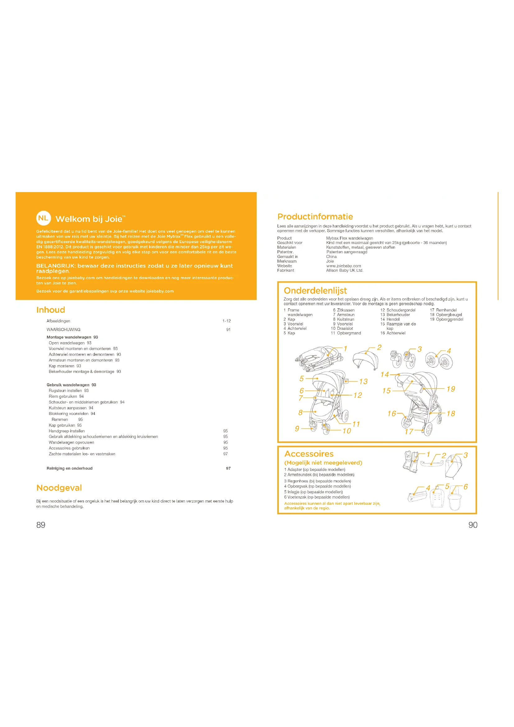 Gefeliciteerd dat u nu lid bent van de Joie-familie! Het doet ons veel genoegen om deel te kunnen uitmaken van uw reis met uw kleintje. Bij het reizen met de Joie Mytrax Flex gebruikt u een volle-dig gecertificeerde kwaliteits-wandelwagen, goedgekeurd volgens de Europese veiligheidsnorm EN 1888:2012. Dit product is geschikt voor gebruik met kinderen die minder dan 25kg per zit we-gen. Lees deze handleiding zorgvuldig en volg elke stap om voor een comfortabele rit en de beste bescherming van uw kind te zorgen. BELANGRIJK: bewaar deze instructies zodat u ze later opnieuw kunt raadplegen. Bezoek ons op joiebaby.com om handleidingen te downloaden en nog meer interessante produc-ten van Joie te zien.Bezoek voor de garantiebepalingen svp onze website joiebaby.com Inhoud Afbeeldingen 1-12WAARSCHUWING 91Montage wandelwagen 93 Open wandelwagen 93 Voorwiel monteren en demonteren 93 Achterwiel monteren en demonteren 93 Armsteun monteren en demonteren 93 Kap monteren 93 Bekerhouder montage & demontage 93 Gebruik wandelwagen 93 Rugsteun instellen 93 Riem gebruiken 94 Schouder- en middelriemen gebruiken 94 Kuitsteun aanpassen 94 Blokkering voorwielen 94 Remmen 95 Kap gebruiken 95 Handgreep instellen 95 Gebruik afdekking schouderriemen en afdekking kruisriemen 95 Wandelwagen opvouwen 95 Accessoires gebruiken 95 Zachte materialen los- en vastmaken 97 Reiniging en onderhoud 97 Noodgeval Bij een noodsituatie of een ongeluk is het heel belangrijk om uw kind direct te laten verzorgen met eerste hulp en medische behandeling.