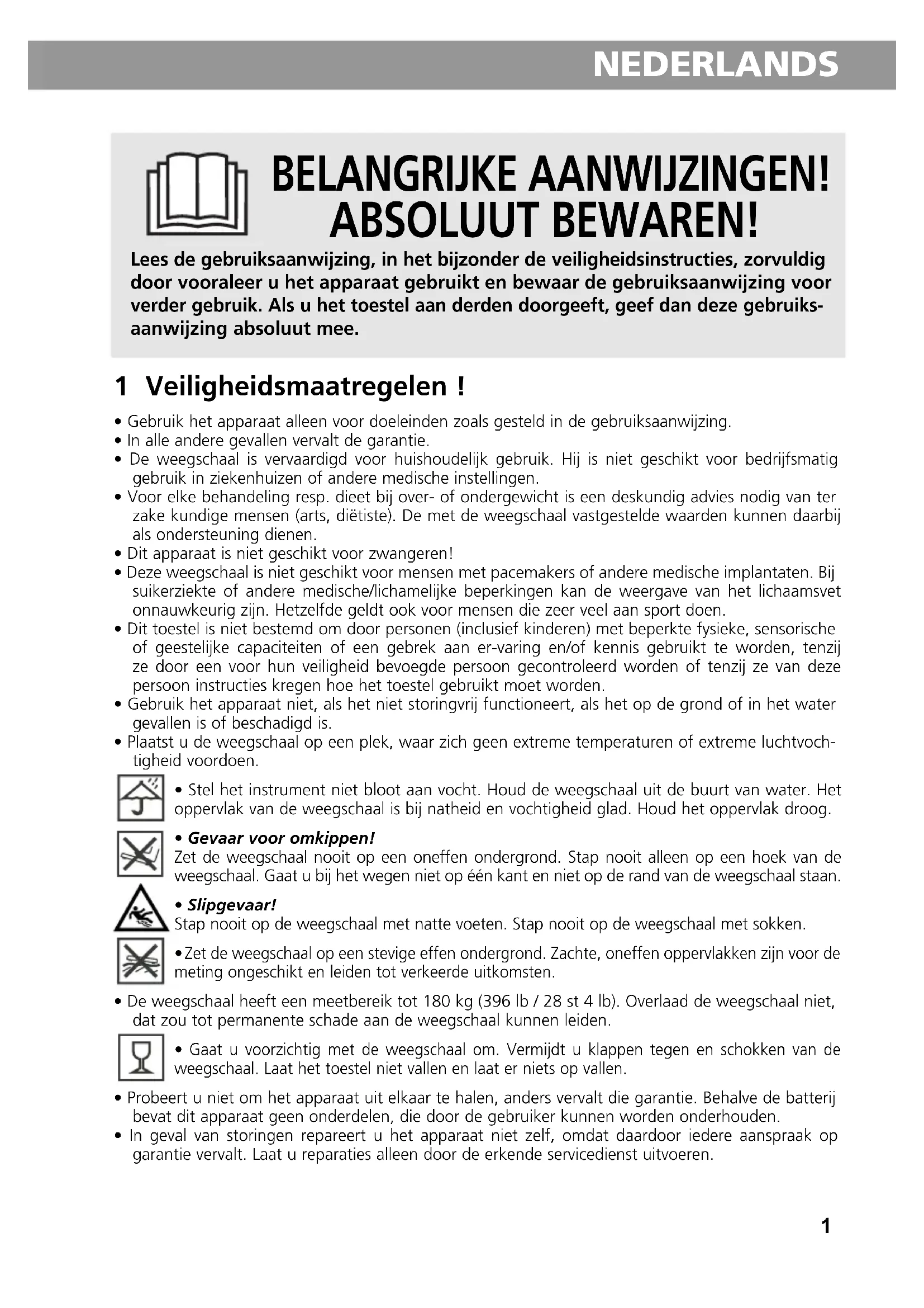 - Gebruik het apparaat alleen voor doeleinden zoals gesteld in de gebruiksaanwijzing.• In alle andere gevallen vervalt de garantie.• De weegschaal is vervaardigd voor huishoudelijk gebruik. Hij is niet geschikt voor bedrijfsmatiggebruik in ziekenhuizen of andere medische instellingen.• Voor elke behandeling resp. dieet bij over- of ondergewicht is een deskundig advies nodig van terzake kundige mensen (arts, diëtiste). De met de weegschaal vastgestelde waarden kunnen daarbijals ondersteuning dienen.• Dit apparaat is niet geschikt voor zwangeren!• Deze weegschaal is niet geschikt voor mensen met pacemakers of andere medische implantaten. Bijsuikerziekte of andere medische/lichamelijke beperkingen kan de weergave van het lichaamsvetonnauwkeurig zijn. Hetzelfde geldt ook voor mensen die zeer veel aan sport doen.• Dit toestel is niet bestemd om door personen (inclusief kinderen) met beperkte fysieke, sensorischeof geestelijke capaciteiten of een gebrek aan er-varing en/of kennis gebruikt te worden, tenzijze door een voor hun veiligheid bevoegde persoon gecontroleerd worden of tenzij ze van dezepersoon instructies kregen hoe het toestel gebruikt moet worden.• Gebruik het apparaat niet, als het niet storingvrij functioneert, als het op de grond of in het watergevallen is of beschadigd is.• Plaatst u de weegschaal op een plek, waar zich geen extreme temperaturen of extreme luchtvoch-tigheid voordoen.• Stel het instrument niet bloot aan vocht. Houd de weegschaal uit de buurt van water. Hetoppervlak van de weegschaal is bij natheid en vochtigheid glad. Houd het oppervlak droog.• Gevaar voor omkippen!Zet de weegschaal nooit op een oneffen ondergrond. Stap nooit alleen op een hoek van deweegschaal. Gaat u bij het wegen niet op één kant en niet op de rand van de weegschaal staan.• Slipgevaar!Stap nooit op de weegschaal met natte voeten. Stap nooit op de weegschaal met sokken. Zet de weegschaal op een stevige effen ondergrond. Zachte, oneffen oppervlakken zijn voor demeting ongeschikt en leiden tot verkeerde uitkomsten.• De weegschaal heeft een meetbereik tot 180 kg (396 lb / 28 st 4 lb). Overlaad de weegschaal niet,dat zou tot permanente schade aan de weegschaal kunnen leiden. Gaat u voorzichtig met de weegschaal om. Vermijdt u klappen tegen en schokken van deweegschaal. Laat het toestel niet vallen en laat er niets op vallen.• Probeert u niet om het apparaat uit elkaar te halen, anders vervalt die garantie. Behalve de batterijbevat dit apparaat geen onderdelen, die door de gebruiker kunnen worden onderhouden.• In geval van storingen repareert u het apparaat niet zelf, omdat daardoor iedere aanspraak opgarantie vervalt. Laat u reparaties alleen door de erkende servicedienst uitvoeren. BELANGRIJKE AANWIJZINGEN! ABSOLUUT BEWAREN! Lees de gebruiksaanwijzing, in het bijzonder de veiligheidsinstructies, zorvuldig door vooraleer u het apparaat gebruikt en bewaar de gebruiksaanwijzing voor verder gebruik. Als u het toestel aan derden doorgeeft, geef dan deze gebruiks- aanwijzing absoluut mee.2 NEDERLANDS Bedankt voor uw vertrouwen en van harte gelukgewenst! Met de Personenweegschaal met lichaamsanalysefunctie BS 477 hebt u een kwaliteitsproduct van MEDISANA gekocht. Dit toestel werd voor het wegen en voor het berekenen van het lichaamsvet- aandeel, watermassa en spiermassa van personen vervaardigd. Voor een succesvol en duurzaam gebruik van de MEDISANA Personenweegschaal met lichaamsanalysefunctie BS 477 raden we u aan om de onderstaande gebruiks- en onderhoudsaanwijzingen zorgvuldig door te lezen. 2 Levering en verpakking Gelieve eerst te controleren of het instrument volledig is en volledig vrij van beschadigingen is. In geval van twijfel neemt u het toestel niet in bedrijf en neemt u contact op met uw handelaar of uw service- punt. Bij de levering horen: