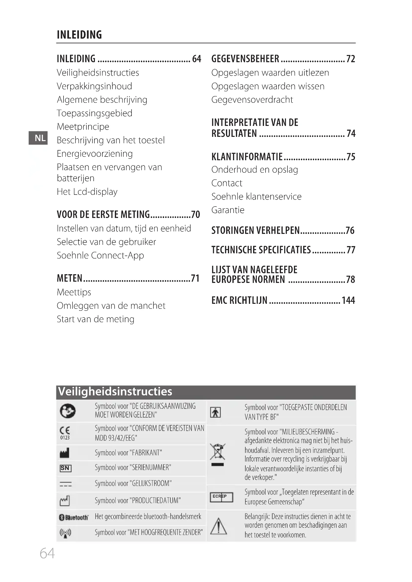 EUROPESE NORMEN ........................ 78 EMC RICHTLIJN .............................. 144 Symbool voor "DE GEBRUIKSAANWIJZING MOET WORDEN GELEZEN"0123Symbool voor "CONFORM DE VEREISTEN VAN MDD 93/42/EEG"Symbool voor "FABRIKANT" Symbool voor "SERIENUMMER"Symbool voor "GELIJKSTROOM"Symbool voor "PRODUCTIEDATUM"Het gecombineerde bluetooth-handelsmerkSymbool voor "MET HOOGFREQUENTE ZENDER"Symbool voor "TOEGEPASTE ONDERDELEN VAN TYPE BF"Symbool voor "MILIEUBESCHERMING - afgedankte elektronica mag niet bij het huis-houdafval. Inleveren bij een inzamelpunt. Informatie over recycling is verkrijgbaar bij lokale verantwoordelijke instanties of bij de verkoper."EC REPSymbool voor „Toegelaten representant in de Europese Gemeenschap“Belangrijk: Deze instructies dienen in acht te worden genomen om beschadigingen aan het toestel te voorkomen. VeiligheidsinstructiesNL