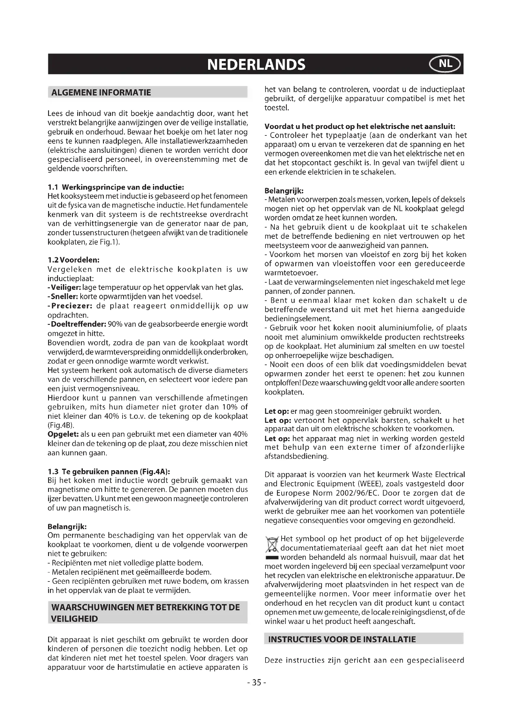manual conguration with service menu. E/H Fixed sensor value. - System must cool down. - 34 -NEDERLANDS ALGEMENE INFORMATIE Lees de inhoud van dit boekje aandachtig door, want het verstrekt belangrijke aanwijzingen over de veilige installatie, gebruik en onderhoud. Bewaar het boekje om het later nog eens te kunnen raadplegen. Alle installatiewerkzaamheden (elektrische aansluitingen) dienen te worden verricht door gespecialiseerd personeel, in overeenstemming met de geldende voorschriften. 1.1Werkingsprincipevandeinductie: Het kooksysteem met inductie is gebaseerd op het fenomeen uit de fysica van de magnetische inductie. Het fundamentele kenmerk van dit systeem is de rechtstreekse overdracht van de verhittingsenergie van de generator naar de pan, zonder tussenstructuren (hetgeen afwijkt van de traditionele kookplaten, zie Fig.1).