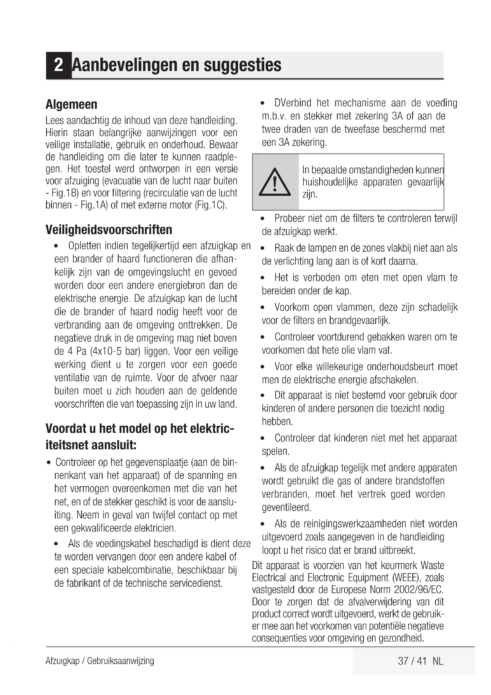 - Waarschuwing voor gevaarlijke situaties met betrekking tot leven en eigendom.33 / 41 NL Afzuıgkap / Gebruiksaanwijzing INHOUDSOPGAVE 1 Kenmerken 34-36 2 Aanbevelingen en suggesties 37-38 Algemeen p. 37