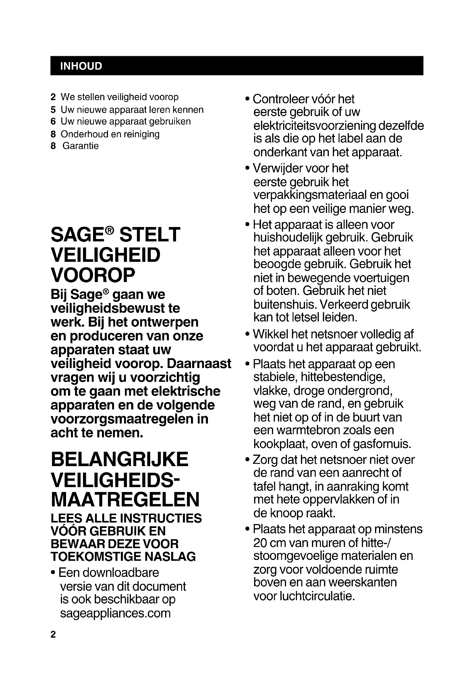 - Een downloadbare versie van dit document is ook beschikbaar op sageappliances.com 2 We stellen veiligheid voorop5 Uw nieuwe apparaat leren kennen6 Uw nieuwe apparaat gebruiken8 Onderhoud en reiniging8 Garantie3