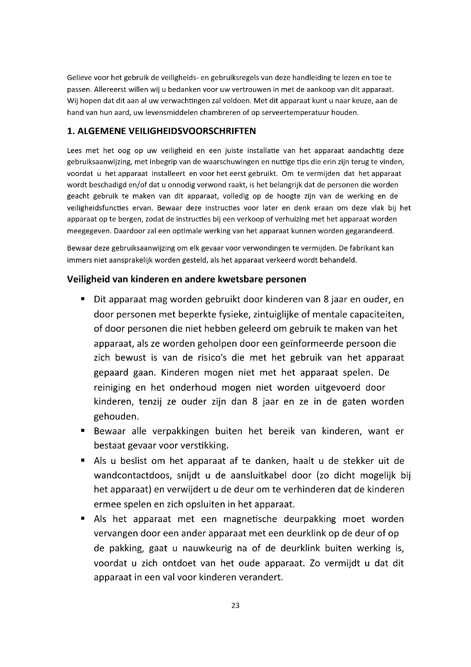 Lees met het oog op uw veiligheid en een juiste installatie van het apparaat aandachtig deze gebruiksaanwijzing, met inbegrip van de waarschuwingen en nuttige tips die erin zijn terug te vinden, voordat u het apparaat installeert en voor het eerst gebruikt. Om te vermijden dat het apparaat wordt beschadigd en/of dat u onnodig verwond raakt, is het belangrijk dat de personen die worden geacht gebruik te maken van dit apparaat, volledig op de hoogte zijn van de werking en de veiligheidsfuncties ervan. Bewaar deze instructies voor later en denk eraan om deze vlak bij het apparaat op te bergen, zodat de instructies bij een verkoop of verhuizing met het apparaat worden meegegeven. Daardoor zal een optimale werking van het apparaat kunnen worden gegarandeerd. Bewaar deze gebruiksaanwijzing om elk gevaar voor verwondingen te vermijden. De fabrikant kan immers niet aansprakelijk worden gesteld, als het apparaat verkeerd wordt behandeld. Veiligheid van kinderen en andere kwetsbare personen Dit apparaat mag worden gebruikt door kinderen van 8 jaar en ouder, en door personen met beperkte fysieke, zintuiglijke of mentale capaciteiten, of door personen die niet hebben geleerd om gebruik te maken van het apparaat, als ze worden geholpen door een geïnformeerde persoon die zich bewust is van de risico's die met het gebruik van het apparaat gepaard gaan. Kinderen mogen niet met het apparaat spelen. De reiniging en het onderhoud mogen niet worden uitgevoerd door kinderen, tenzij ze ouder zijn dan 8 jaar en ze in de gaten worden gehouden. Bewaar alle verpakkingen buiten het bereik van kinderen, want er bestaat gevaar voor verstikking. Als u beslist om het apparaat af te danken, haalt u de stekker uit de wandcontactdoos, snijdt u de aansluitkabel door (zo dicht mogelijk bij het apparaat) en verwijdert u de deur om te verhinderen dat de kinderen ermee spelen en zich opsluiten in het apparaat. Als het apparaat met een magnetische deurpakking moet worden vervangen door een ander apparaat met een deurklink op de deur of op de pakking, gaat u nauwkeurig na of de deurklink buiten werking is, voordat u zich ontdoet van het oude apparaat. Zo vermijdt u dat dit apparaat in een val voor kinderen verandert.24 Houd het apparaat en het snoer van het apparaat buiten het bereik van kinderen jonger dan 8 jaar. Kinderen moeten onder toezicht staan om ervoor te zorgen dat ze niet met het apparaat spelen. Kinderen van 3 tot 8 jaar mogen het apparaat laden en ontladen Algemene veiligheid OPGELET — Dit apparaat is ontworpen om in een huiselijke omgeving te werken. OPGELET — Berg in dit apparaat nooit brandbare stoffen zoals spuitbussen op, want deze zouden er kunnen uitlopen. OPGELET — Als het voedingssnoer is beschadigd, moet u het onmiddellijk bij uw fabrikant of een gekwalificeerde handelaar vervangen, om elk gevaar voor elektrocutie te vermijden. OPGELET — Dit apparaat is alleen bedoeld om in een staande positie te worden geïnstalleerd, in geen geval moet het op een ingebouwde of integreerbare manier worden geïnstalleerd. OPGELET — Beschadig het koelcircuit niet. OPGELET — Gebruik geen elektrische apparaten aan de binnenzijde van het compartiment, tenzij die laatste door de fabrikant worden toegestaan. Opgelet: brandgevaar Als het koelcircuit werd beschadigd: Vermijd open vlammen en elke ontstekingsbron. Ventileer zorgvuldig de ruimte waarin het apparaat staat. Het is gevaarlijk om de samenstelling van dit apparaat te wijzigen, op welke manier ook. Elke beschadiging van het snoer kan een kortsluiting en/of een elektrocutie veroorzaken. Elektrische veiligheid Wij kunnen niet aansprakelijk worden gesteld voor incidenten die worden veroorzaakt door een onjuiste elektrische installatie. Het voedingssnoer mag niet worden verlengd. Gebruik geen verlengsnoeren, adapters of meervoudige contactdozen. Ga zorgvuldig na of de wandcontactdoos niet is beschadigd. Een wandcontactdoos in slechte staat kan een oververhitting van het apparaat en de ontploffing ervan veroorzaken. Ga zorgvuldig na of u de wandcontactdoos van het apparaat kunt bereiken. Trek nooit aan de hoofdkabel. Neem de aarding nooit weg. Sluit het snoer niet aan als de wandcontactdoos loshangt. Er bestaat gevaar voor elektrocutie of brand. U mag het apparaat nooit gebruiken als de bescherming van de binnenverlichting niet is geïnstalleerd. Koppel uw apparaat los, voordat u de lamp vervangt.25 Dit apparaat werkt op een eenfasige stroom van 220~240 V/ 50 Hz. Het apparaat moet gebruikmaken van een wandcontactdoos die is geaard volgens de van kracht zijnde aanbevelingen. Vervang de voedingskabel niet als deze is beschadigd, maar neem contact op met uw klantenservice. De contactdoos moet vlot bereikbaar zijn, maar moet zich buiten het bereik van kinderen bevinden. Neem bij twijfel contact op met uw installateur. Dagelijks gebruik Sla nooit brandbare stoffen of vloeistoffen in het apparaat op; dat zou ontploffingsgevaar met zich mee kunnen brengen. Laat nooit andere elektrische apparaten in dit apparaat werken (mixers, elektrische ijsturbines, enz.). Wanneer u het apparaat loskoppelt, moet u de stekker altijd in uw handen houden en mag u niet aan het snoer trekken. Stel het apparaat niet rechtstreeks bloot aan de zon. Het apparaat moet uit de buurt van kaarsen, lantaarns en andere open vlammen worden gehouden, om brandgevaar te vermijden. Dit apparaat is uitsluitend bestemd om dranken op te slaan. Het apparaat is zwaar. Wees voorzichtig wanneer u het verplaatst. Is uw apparaat uitgerust met wieltjes, houd er dan rekening mee dat deze uitsluitend dienen om korte verplaatsingen te vergemakkelijken. Verplaats het apparaat niet over langere afstanden. Gebruik het apparaat of de elementen ervan nooit om op te leunen. Om vallende voorwerpen te vermijden en te verhinderen dat het apparaat defect raakt, mag u de compartimenten van het apparaat niet overladen. Opgelet! Reiniging en onderhoud Koppel het apparaat los en schakel de stroom uit, voordat u onderhoudswerkzaamhed