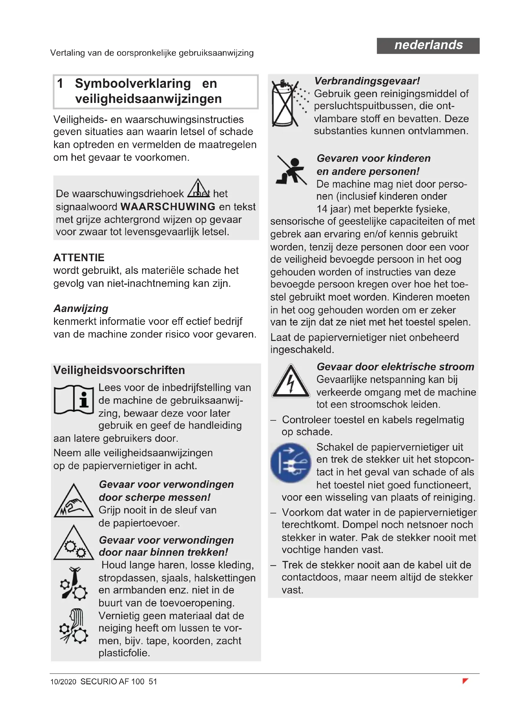Peso 7,6 kg Largura de inserção 225 mm Velocidade de corte 45 mm/s Conexão 220-240 V / 50/60 Hz 110-130 V / 50/60 Hz Potência com a quantidade máx. de folhas 185 W (EU) / 160 W (US) Consumo de energia no modo de prontidão < 2 Wh Tempo de funcionamento com o n.º máx. de folhas até 15 min Tempo de funcionamento com folhas soltas até 20 min Condições ambientais durante o funcionamento: Temperatura Humidade relativa do ar Altura acima do nível do mar -10 °C até +25 °C máx. 90%, sem condensação máx. 2000 m Dimensões L x P x A (mm) 375 x 260 x 620 Capacidade do recipiente do material cortado 25 l Nível de pressão acústica emitido (Marcha em vazio/carga) 55-60 dB / 65 -70 dB Nível de potência sonora ponderado A (LWAd em marcha vazia) 71 dB10/2020 SECURIO AF 100 51 nederlands Vertaling van de oorspronkelijke gebruiksaanwijzing 1 Symboolverklaring en veiligheidsaanwijzingen Veiligheids- en waarschuwingsinstructies geven situaties aan waarin letsel of schade kan optreden en vermelden de maatregelen om het gevaar te voorkomen. Aanwijzing kenmerkt informatie voor eff ectief bedrijf van de machine zonder risico voor gevaren. De waarschuwingsdriehoek met het signaalwoord WAARSCHUWING en tekst met grijze achtergrond wijzen op gevaar voor zwaar tot levensgevaarlijk letsel. ATTENTIE wordt gebruikt, als materiële schade het gevolg van niet-inachtneming kan zijn. Veiligheidsvoorschriften Lees voor de inbedrijfstelling van de machine de gebruiksaanwij- zing, bewaar deze voor later gebruik en geef de handleiding aan latere gebruikers door. Neem alle veiligheidsaanwijzingen op de papiervernietiger in acht. Gevaar voor verwondingen door scherpe messen! Grijp nooit in de sleuf van de papiertoevoer. Gevaar voor verwondingen door naar binnen trekken! Houd lange haren, losse kleding, stropdassen, sjaals, halskettingen en armbanden enz. niet in de buurt van de toevoeropening. Vernietig geen materiaal dat de neiging heeft om lussen te vor- men, bijv. tape, koorden, zacht plasticfolie. Verbrandingsgevaar! Gebruik geen reinigingsmiddel of persluchtspuitbussen, die ont- vlambare stoff en bevatten. Deze substanties kunnen ontvlammen. Gevaren voor kinderen en andere personen! De machine mag niet door perso- nen (inclusief kinderen onder 14 jaar) met beperkte fysieke, sensorische of geestelijke capaciteiten of met gebrek aan ervaring en/of kennis gebruikt worden, tenzij deze personen door een voor de veiligheid bevoegde persoon in het oog gehouden worden of instructies van deze bevoegde persoon kregen over hoe het toe- stel gebruikt moet worden. Kinderen moeten in het oog gehouden worden om er zeker van te zijn dat ze niet met het toestel spelen. Laat de papiervernietiger niet onbeheerd ingeschakeld. Gevaar door elektrische stroom Gevaarlijke netspanning kan bij verkeerde omgang met de machine tot een stroomschok leiden. – Controleer toestel en kabels regelmatig op schade. Schakel de papiervernietiger uit en trek de stekker uit het stopcon- tact in het geval van schade of als het toestel niet goed functioneert, voor een wisseling van plaats of reiniging. – Voorkom dat water in de papiervernietiger terechtkomt. Dompel noch netsnoer noch stekker in water. Pak de stekker nooit met vochtige handen vast. – Trek de stekker nooit aan de kabel uit de contactdoos, maar neem altijd de stekker vast.52 SECURIO AF 100 10/2020 nederlands 3 Overzicht
