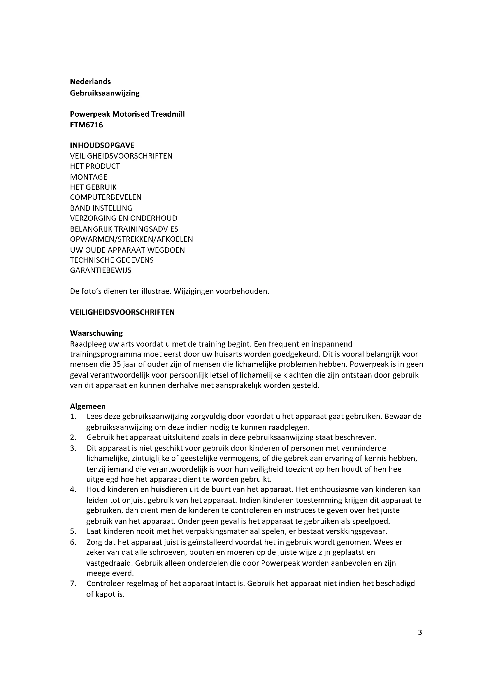 TECHNISCHE GEGEVENS GARANTIEBEWIJS De foto’s dienen ter illustratie. Wijzigingen voorbehouden. VEILIGHEIDSVOORSCHRIFTEN Waarschuwing Raadpleeg uw arts voordat u met de training begint. Een frequent en inspannend trainingsprogramma moet eerst door uw huisarts worden goedgekeurd. Dit is vooral belangrijk voor mensen die 35 jaar of ouder zijn of mensen die lichamelijke problemen hebben. Powerpeak is in geen geval verantwoordelijk voor persoonlijk letsel of lichamelijke klachten die zijn ontstaan door gebruik van dit apparaat en kunnen derhalve niet aansprakelijk worden gesteld. Algemeen