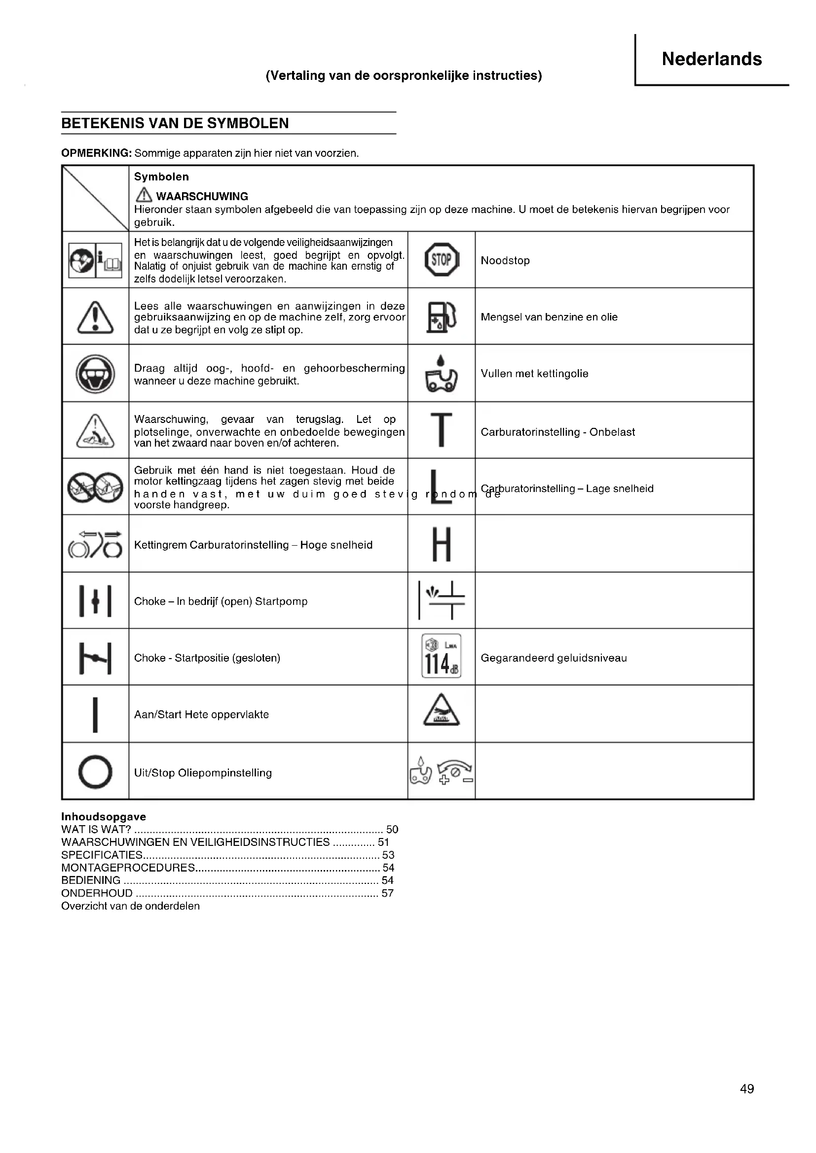 MODELLO E&S PO14-50SR PO16-50SR 14″ 16″ ROCCHETTO DENTATO ROCCHETTO DENTATO 91PX – 52 91PX – 57 000BookTCS33EDPWE.indb48000BookTCS33EDPWE.indb48 2019/01/2415:24:272019/01/2415:24:27BETEKENIS VAN DE SYMBOLEN OPMERKING: Sommige apparaten zijn hier niet van voorzien. Symbolen WAARSCHUWING Hieronder staan symbolen afgebeeld die van toepassing zijn op deze machine. U moet de betekenis hiervan begrijpen voor gebruik. Het is belangrijk dat u de volgende veiligheidsaanwijzingen en waarschuwingen leest, goed begrijpt en opvolgt. Nalatig of onjuist gebruik van de machine kan ernstig of zelfs dodelijk letsel veroorzaken. Noodstop Lees alle waarschuwingen en aanwijzingen in deze gebruiksaanwijzing en op de machine zelf, zorg ervoor dat u ze begrijpt en volg ze stipt op. Mengsel van benzine en olie Draag altijd oog-, hoofd- en gehoorbescherming wanneer u deze machine gebruikt. Vullen met kettingolie Waarschuwing, gevaar van terugslag. Let op plotselinge, onverwachte en onbedoelde bewegingen van het zwaard naar boven en/of achteren. Carburatorinstelling - Onbelast Gebruik met één hand is niet toegestaan. Houd de motor kettingzaag tijdens het zagen stevig met beide handen vast, met uw duim goed stevig rondom de voorste handgreep. Carburatorinstelling – Lage snelheid Kettingrem Carburatorinstelling – Hoge snelheid Choke – In bedrijf (open) Startpomp Choke - Startpositie (gesloten)