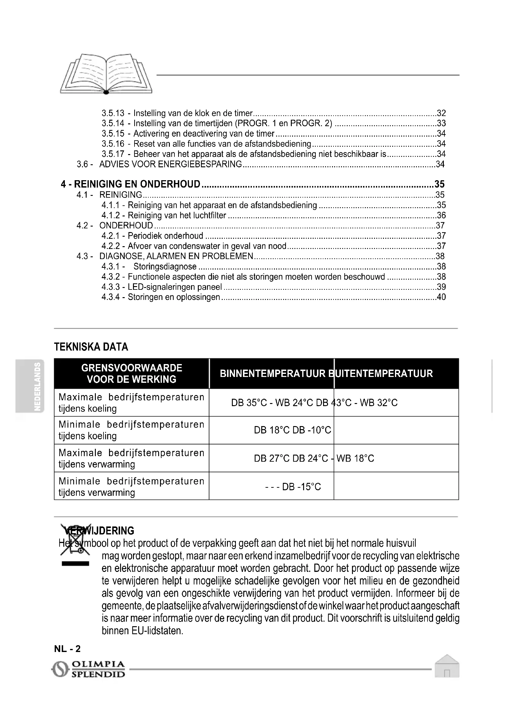 - INHOUDSOPGAVENL - 2 NEDERLANDS VERWIJDERING Het symbool op het product of de verpakking geeft aan dat het niet bij het normale huisvuil mag worden gestopt, maar naar een erkend inzamelbedrijf voor de recycling van elektrische en elektronische apparatuur moet worden gebracht. Door het product op passende wijze te verwijderen helpt u mogelijke schadelijke gevolgen voor het milieu en de gezondheid als gevolg van een ongeschikte verwijdering van het product vermijden. Informeer bij de gemeente, de plaatselijke afvalverwijderingsdienst of de winkel waar het product aangeschaft is naar meer informatie over de recycling van dit product. Dit voorschrift is uitsluitend geldig binnen EU-lidstaten. 3.5.13 - Instelling van de klok en de timer p. 32