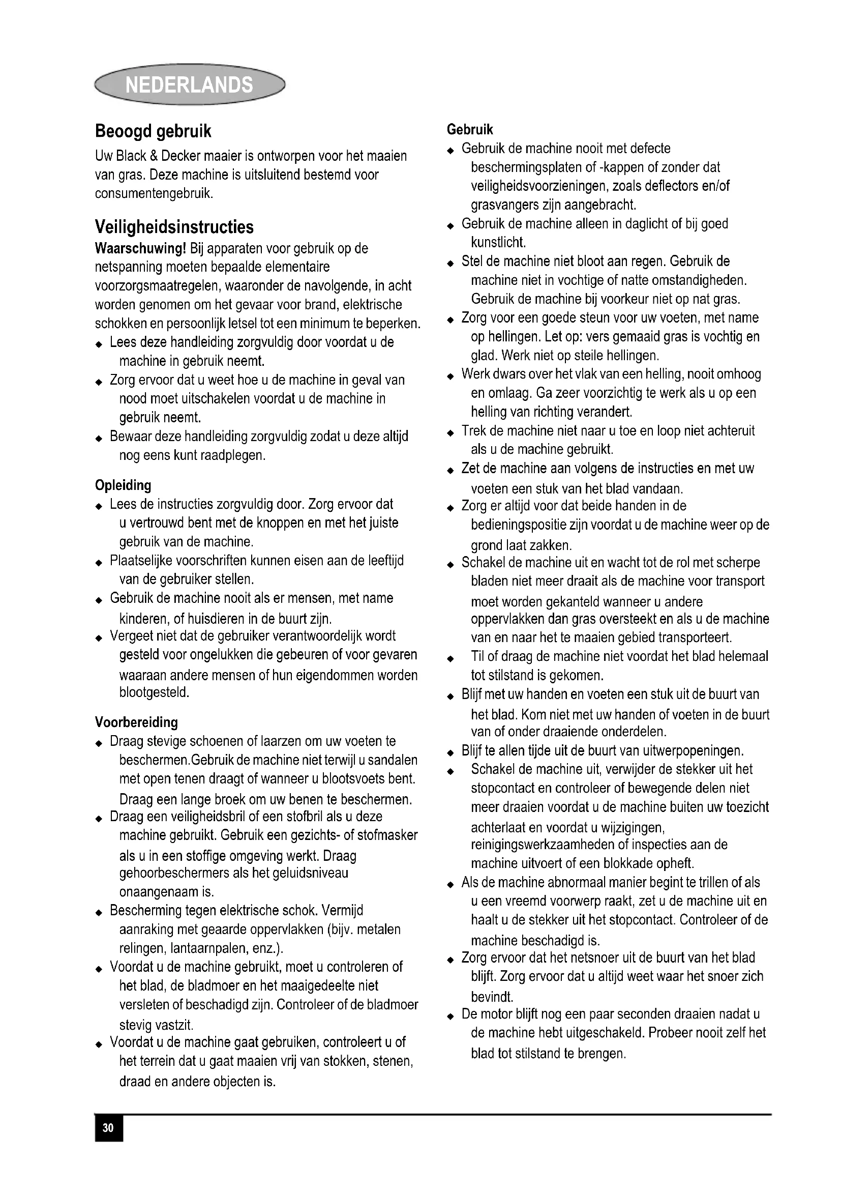 Il prodotto non sia stato usato in modo improprio o scorretto; Il prodotto non abbia subito danni causati da oggetti o sostanze estranee oppure incidenti; Il prodotto non abbia subito tentativi di riparazione non effettuati da tecnici autorizzati né dall’assistenza Black & Decker. Per attivare la garanzia è necessario esibire la prova comprovante l’acquisto al venditore o al tecnico autorizzato. Per individuare il tecnico autorizzato più vicino, rivolgersi alla sede Black & Decker locale, presso il recapito indicato nel presente manuale. Altrimenti un elenco completo di tutti i tecnici autorizzati Black & Decker e i dettagli completi sui contatti e i servizi post-vendita sono disponibili su Internet presso: www.2helpU.com I clienti che desiderano registrare il nuovo prodotto Black & Decker e ricevere gli aggiornamenti sui nuovi prodotti e le offerte speciali, sono invitati a visitare il sito Web (www. blackanddecker.it). Ulteriori informazioni sul marchio e la gamma di prodotti Black & Decker sono disponibili all’indirizzo www.blackanddecker.it.30 NEDERLANDS Nederlands Beoogd gebruik Uw Black & Decker maaier is ontworpen voor het maaien van gras. Deze machine is uitsluitend bestemd voor consumentengebruik. Veiligheidsinstructies Waarschuwing! Bij apparaten voor gebruik op de netspanning moeten bepaalde elementaire voorzorgsmaatregelen, waaronder de navolgende, in acht worden genomen om het gevaar voor brand, elektrische schokken en persoonlijk letsel tot een minimum te beperken. Lees deze handleiding zorgvuldig door voordat u de machine in gebruik neemt. Zorg ervoor dat u weet hoe u de machine in geval van nood moet uitschakelen voordat u de machine in gebruik neemt. Bewaar deze handleiding zorgvuldig zodat u deze altijd nog eens kunt raadplegen. Opleiding Lees de instructies zorgvuldig door. Zorg ervoor dat u vertrouwd bent met de knoppen en met het juiste gebruik van de machine. Plaatselijke voorschriften kunnen eisen aan de leeftijd van de gebruiker stellen. Gebruik de machine nooit als er mensen, met name kinderen, of huisdieren in de buurt zijn. Vergeet niet dat de gebruiker verantwoordelijk wordt gesteld voor ongelukken die gebeuren of voor gevaren waaraan andere mensen of hun eigendommen worden blootgesteld. Voorbereiding Draag stevige schoenen of laarzen om uw voeten te beschermen.Gebruik de machine niet terwijl u sandalen met open tenen draagt of wanneer u blootsvoets bent. Draag een lange broek om uw benen te beschermen. Draag een veiligheidsbril of een stofbril als u deze machine gebruikt. Gebruik een gezichts- of stofmasker als u in een stoffige omgeving werkt. Draag gehoorbeschermers als het geluidsniveau onaangenaam is. Bescherming tegen elektrische schok. Vermijd aanraking met geaarde oppervlakken (bijv. metalen relingen, lantaarnpalen, enz.). Voordat u de machine gebruikt, moet u controleren of het blad, de bladmoer en het maaigedeelte niet versleten of beschadigd zijn. Controleer of de bladmoer stevig vastzit. Voordat u de machine gaat gebruiken, controleert u of het terrein dat u gaat maaien vrij van stokken, stenen, draad en andere objecten is. Gebruik Gebruik de machine nooit met defecte beschermingsplaten of -kappen of zonder dat veiligheidsvoorzieningen, zoals deflectors en/of grasvangers zijn aangebracht. Gebruik de machine alleen in daglicht of bij goed kunstlicht. Stel de machine niet bloot aan regen. Gebruik de machine niet in vochtige of natte omstandigheden. Gebruik de machine bij voorkeur niet op nat gras. Zorg voor een goede steun voor uw voeten, met name op hellingen. Let op: vers gemaaid gras is vochtig en glad. Werk niet op steile hellingen. Werk dwars over het vlak van een helling, nooit omhoog en omlaag. Ga zeer voorzichtig te werk als u op een helling van richting verandert. Trek de machine niet naar u toe en loop niet achteruit als u de machine gebruikt. Zet de machine aan volgens de instructies en met uw voeten een stuk van het blad vandaan. Zorg er altijd voor dat beide handen in de bedieningspositie zijn voordat u de machine weer op de grond laat zakken. Schakel de machine uit en wacht tot de rol met scherpe bladen niet meer draait als de machine voor transport moet worden gekanteld wanneer u andere oppervlakken dan gras oversteekt en als u de machine van en naar het te maaien gebied transporteert. Til of draag de machine niet voordat het blad helemaal tot stilstand is gekomen. Blijf met uw handen en voeten een stuk uit de buurt van het blad. Kom niet met uw handen of voeten in de buurt van of onder draaiende onderdelen. Blijf te allen tijde uit de buurt van uitwerpopeningen. Schakel de machine uit, verwijder de stekker uit het stopcontact en controleer of bewegende delen niet meer draaien voordat u de machine buiten uw toezicht achterlaat en voordat u wijzigingen, reinigingswerkzaamheden of inspecties aan de machine uitvoert of een blokkade opheft. Als de machine abnormaal manier begint te trillen of als u een vreemd voorwerp raakt, zet u de machine uit en haalt u de stekker uit het stopcontact. Controleer of de machine beschadigd is. Zorg ervoor dat het netsnoer uit de buurt van het blad blijft. Zorg ervoor dat u altijd weet waar het snoer zich bevindt. De motor blijft nog een paar seconden draaien nadat u de machine hebt uitgeschakeld. Probeer nooit zelf het blad tot stilstand te brengen.31 NEDERLANDS Onderhoud en opslag Controleer of er geen onderdelen beschadigd of defect zijn voor u de machine in gebruik neemt. Ga na of er geen bewegende onderdelen verplaatst of vastgelopen zijn, of er geen onderdelen gebroken zijn, of de beschermingsplaten of schakelaars niet beschadigd zijn en of u niets anders opmerkt dat de werking van de machine kan beïnvloeden. Overtuig u ervan dat de machine correct functioneert en de beoogde taak aankan. Gebruik de machine nooit met defecte beschermingsplaten of -kappen of zonder dat deze zijn aangebracht. Gebruik de machine niet als een onderdeel beschadigd of defect is. Gebruik de machine niet als u deze n