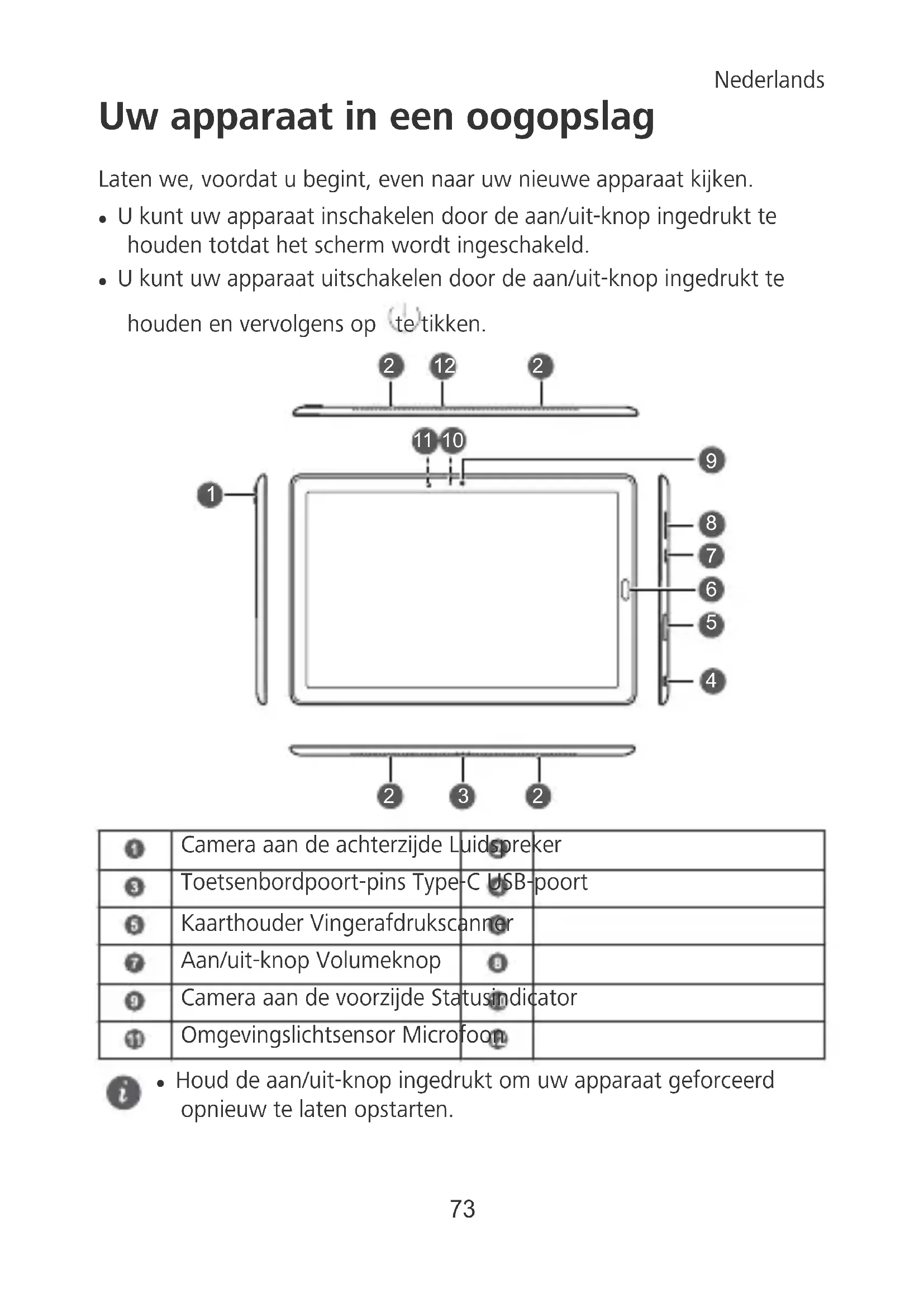 U kunt de servicehotlines, adressen van winkeliers, servicebeleid en meer informatie voor uw lokale regio vinden op HiCare. Ga naar Instellingen en tik op Systeem > Over tablet > Juridische informatie om juridische informatie over uw product te bekijken. Ga naar Instellingen en tik op Systeem > Over tablet > Juridische informatie > Veiligheidsinformatie om veiligheidsinformatie over uw product te bekijken. Ga naar Instellingen en tik op Systeem > Over tablet > Vericatie- info om wettelijk verplichte informatie over uw product te bekijken. Ga naar Instellingen en tik op Systeem > Certicatie logo's om informatie over certiceringslogo's voor uw product te bekijken. Alle afbeeldingen en illustraties in deze handleiding, inclusief (maar niet beperkt tot) de kleur, afmetingen en scherminhoud van het product, zijn alleen bedoeld ter referentie. Het daadwerkelijke product kan verschillen. Niets in deze handleiding vormt een garantie van welke aard dan ook, hetzij expliciet of impliciet. 77Veiligheidsinformatie Lees alle veiligheidsinformatie zorgvuldig door voordat u uw apparaat in gebruik neemt, om een veilige en correcte werking te waarborgen en meer te leren over hoe u uw apparaat op gepaste wijze kunt afvoeren. Bediening en veiligheid l Voorkom mogelijke gehoorschade door niet langdurig te luisteren op een hoog geluidsniveau. l Het gebruik van een niet-goedgekeurde of niet-compatibele voedingsadapter, oplader of batterij kan uw apparaat beschadigen, de levensduur van het apparaat verkorten of brand, explosies of andere gevaren veroorzaken. l De ideale bedrijfstemperatuur is 0 °C tot 35 °C. De ideale opslagtemperatuur is -20 °C tot +45 °C. l Fabrikanten van pacemakers bevelen aan dat een maximum afstand van 15 cm moet worden aangehouden tussen het apparaat en de pacemaker om mogelijke storingen in de pacemaker te voorkomen. Als u een pacemaker gebruikt, houdt u het apparaat aan tegenoverliggende kant van de pacemaker en draagt u het apparaat niet in uw borstzak. l Houd het apparaat en de batterij uit de buurt van overmatige hitte en direct zonlicht. Plaats ze niet op of in warmtebronnen, zoals een magnetron, kachels/fornuizen of radiatoren. l Leef de plaatselijke wetgeving en regelgeving na wanneer u het apparaat gebruikt. Om het risico op ongelukken te verminderen, mag u uw draadloze apparaat niet tijdens het rijden gebruiken. l Tijdens het reizen in een vliegtuig of onmiddellijk voorafgaand aan het landen mag u uw apparaat uitsluitend gebruiken volgens de gegeven instructies. Het gebruik van een draadloos apparaat in een vliegtuig kan draadloze netwerken ontwrichten, de correcte werking van het vliegtuig in gevaar brengen of illegaal zijn. 78l Om schade aan de onderdelen of het interne circuit van uw apparaat te voorkomen, gebruikt u het apparaat niet in een stofge, rokerige, vochtige of vuile omgeving of in de buurt van magnetische velden. l Zorg ervoor dat de voedingsadapter tijdens het opladen van het apparaat is aangesloten op een stopcontact in de buurt van het apparaat en goed bereikbaar is. l Neem de oplader uit het stopcontact en het apparaat als de oplader niet wordt gebruikt. l Gebruik of transporteer het apparaat niet, of sla het apparaat niet op, op plaatsen waar ontvlambare of explosieve stoffen zijn opgeslagen, bijvoorbeeld in een benzinestation, oliedepot of chemische fabriek. Het gebruik van uw apparaat in deze omgevingen verhoogt het risico op explosie of brand. l Voer het apparaat, de batterij en de accessoires af volgens de plaatselijke voorschriften. Deze mogen niet worden samen met het normale huishoudelijke afval weggegooid. Onjuist gebruik kan leiden tot brand, explosie of andere gevaren. l Raadpleeg uw arts en de fabrikant van het apparaat om te bepalen of het gebruik van uw toestel het gebruik van uw medische apparaat negatief kan beïnvloeden. l Volg de regels en voorschriften van ziekenhuizen en gezondheidsinrichtingen. Gebruik het apparaat niet waar dit niet is toegestaan. l Wanneer u een oproep moet plaatsen of beantwoorden, parkeert u uw voertuig eerst veilig langs de weg. l Houd het apparaat weg van hitte- en vuurbronnen, zoals een kachel, magnetron, kookplaat, waterkoker, radiator of kaars. Potentieel explosieve omgevingen Schakel uw telefoon uit in elk gebied met een potentieel explosieve atmosfeer en zorg ervoor dat u voldoet aan alle tekens en instructies. Gebieden die een potentieel explosieve atmosfeer hebben omvatten de gebieden waar u normaliter gevraagd zou worden uw auto uit te schakelen. Vonken in dergelijke gebieden kunnen een explosie of brand veroorzaken, wat resulteert in lichamelijk letsel of zelfs de dood. Schakel het apparaat niet aan bij tankstations. Houd u aan alle beperkingen voor het gebruik van radio-apparatuur bij benzinestations, opslag en 79distributiegebieden en chemische fabrieken. Houd uzelf tevens aan de beperkingen in gebieden waar explosiehandelingen in uitvoering zijn. Kijkt u alvorens het apparaat te gebruiken uit voor gebieden die een mogelijk explosieve atmosfeer hebben en die vaak, maar niet altijd, hiervoor gemarkeerd zijn. Dergelijke locaties omvatten gebieden onder het dek van een boot, chemische transport- of opslagfaciliteiten en gebieden waar de lucht chemicaliën of deeltjes bevat zoals vezels, stof of metaalpoeder. Vraag de producenten van voertuigen die vloeibaar petroleumgas gebruiken (zoals propaan of butaan) of dit apparaat veilig gebruikt kan worden in hun nabijheid. Informatie over verwijdering en recycling Het symbool van de prullenbak met het kruis erdoorheen op uw product, batterij, documentatie of verpakking herinnert u eraan dat alle elektronische producten en batterijen aan het einde van heen levensduur dienen te worden ingeleverd bij speciale afvalinzamelingspunten; deze mogen niet samen met normaal huishoudelijk afval worden weggegooid. Het is de verantwoordelijkheid van de gebruiker om de apparatuur in te leveren bij een daartoe aangewezen inzamelingspunt of -dienst voor afzonderlijke recycling v