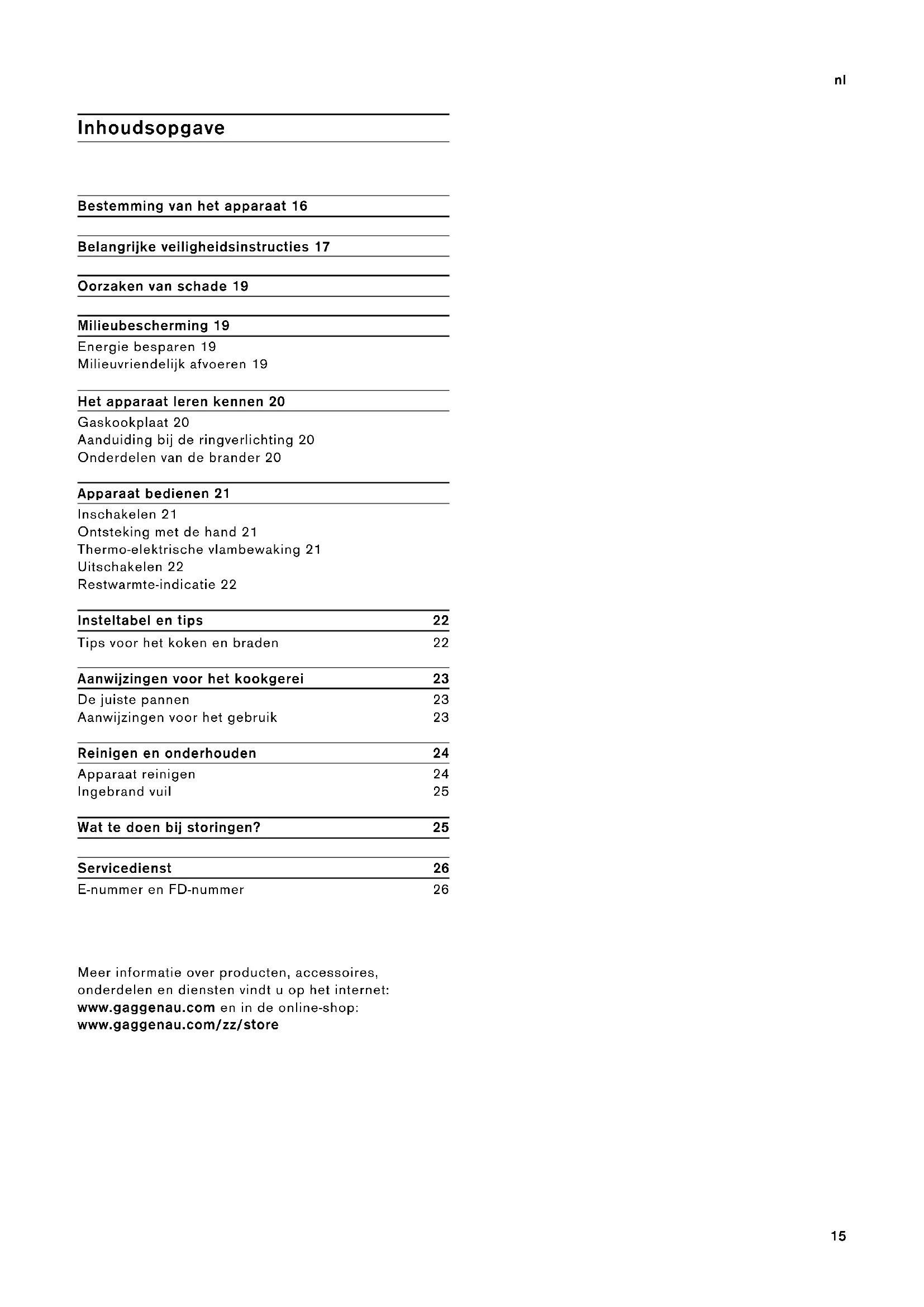 Inhoudsopgave Gebruiksaanwijzing Bestemming van het apparaat 16 Belangrijke veiligheidsinstructies 17 Oorzaken van schade 19 Milieubescherming 19 Energie besparen 19 Milieuvriendelijk afvoeren 19 Het apparaat leren kennen 20 Gaskookplaat 20 Aanduiding bij de ringverlichting 20 Onderdelen van de brander 20 Apparaat bedienen 21 Inschakelen 21 Ontsteking met de hand 21 Thermo-elektrische vlambewaking 21 Uitschakelen 22 Restwarmte-indicatie 22 Insteltabel en tips 22 Tips voor het koken en braden 22 Aanwijzingen voor het kookgerei 23 De juiste pannen 23 Aanwijzingen voor het gebruik 23 Reinigen en onderhouden 24 Apparaat reinigen 24 Ingebrand vuil 25 Wat te doen bij storingen? 25 Servicedienst 26 E-nummer en FD-nummer 26 Meer informatie over producten, accessoires, onderdelen en diensten vindt u op het internet: www.gaggenau.com en in de online-shop: www.gaggenau.com/zz/store16 nl Bestemming van het apparaat m Bestemming van het apparaat Bestemming van het apparaat Lees deze gebruiksaanwijzing zorgvuldig door. Alleen dan kunt u uw apparaat goed en veilig bedienen. Bewaar de gebruiksaanwijzing voor later gebruik of om door te geven aan een volgende eigenaar. Dit apparaat is alleen bestemd voor inbouw. Neem het speciale installatievoorschrift in acht. Dit apparaat moet worden geïnstalleerd volgens het meegeleverde installatievoorschrift. Controleer het apparaat na het uitpakken. Niet aansluiten in geval van transportschade. Alleen een daartoe bevoegd vakman mag het toestel aansluiten. Bij schade door een verkeerde aansluiting maakt u geen aanspraak op garantie. Neem voor de omschakeling naar een ander type gas contact op met de klantenservice. Dit toestel is alleen bestemd voor huishoudelijk gebruik en de huiselijke omgeving. Het toestel alleen gebruiken voor de bereiding van voedsel en drank, nooit om te verwarmen. Houd het toestel tijdens het gebruik in de gaten. Het toestel mag alleen binnen worden gebruikt. Dit toestel niet bij boten of vaartuigen inbouwen. Dit apparaat is bestemd voor gebruik tot op hoogten van maximaal 4.000 meter boven zeeniveau. Dit apparaat is niet bestemd voor gebruik met een externe tijdschakelklok of een afstandbediening. Dek de kookplaat niet af. Dit kan leiden tot ongevallen, bijv. door oververhitting, ontbranding of ontploffend materiaal. Gebruik uitsluitend beveiligingsvoorzieningen of kindertralies die door ons zijn goedgekeurd. Ongeschikte beveiligingsvoorzieningen of kindertralies kunnen tot ongevallen leiden. Dit toestel kan worden gebruikt door kinderen vanaf 8 jaar en door personen met beperkte fysieke, sensorische of geestelijke vermogens of personen die gebrek aan kennis of ervaring hebben, wanneer zij onder toezicht staan van een persoon die verantwoordelijk is voor hun veiligheid of geleerd hebben het op een veilige manier te gebruiken en zich bewust zijn van de risico's die het gebruik van het toestel met zich meebrengt. Kinderen mogen niet met het apparaat spelen. Reiniging en onderhoud van het toestel mogen niet worden uitgevoerd door kinderen, tenzij zij 15 aar of ouder zijn en onder toezicht staan. Zorg ervoor dat kinderen die jonger zijn dan 8 jaar uit de buurt blijven van het toestel of de aansluitkabel. Veiligheidsventiel aansluiten op de gastoevoerleiding wanneer het apparaat langere tijd niet in gebruik is.17 Belangrijke veiligheidsinstructies