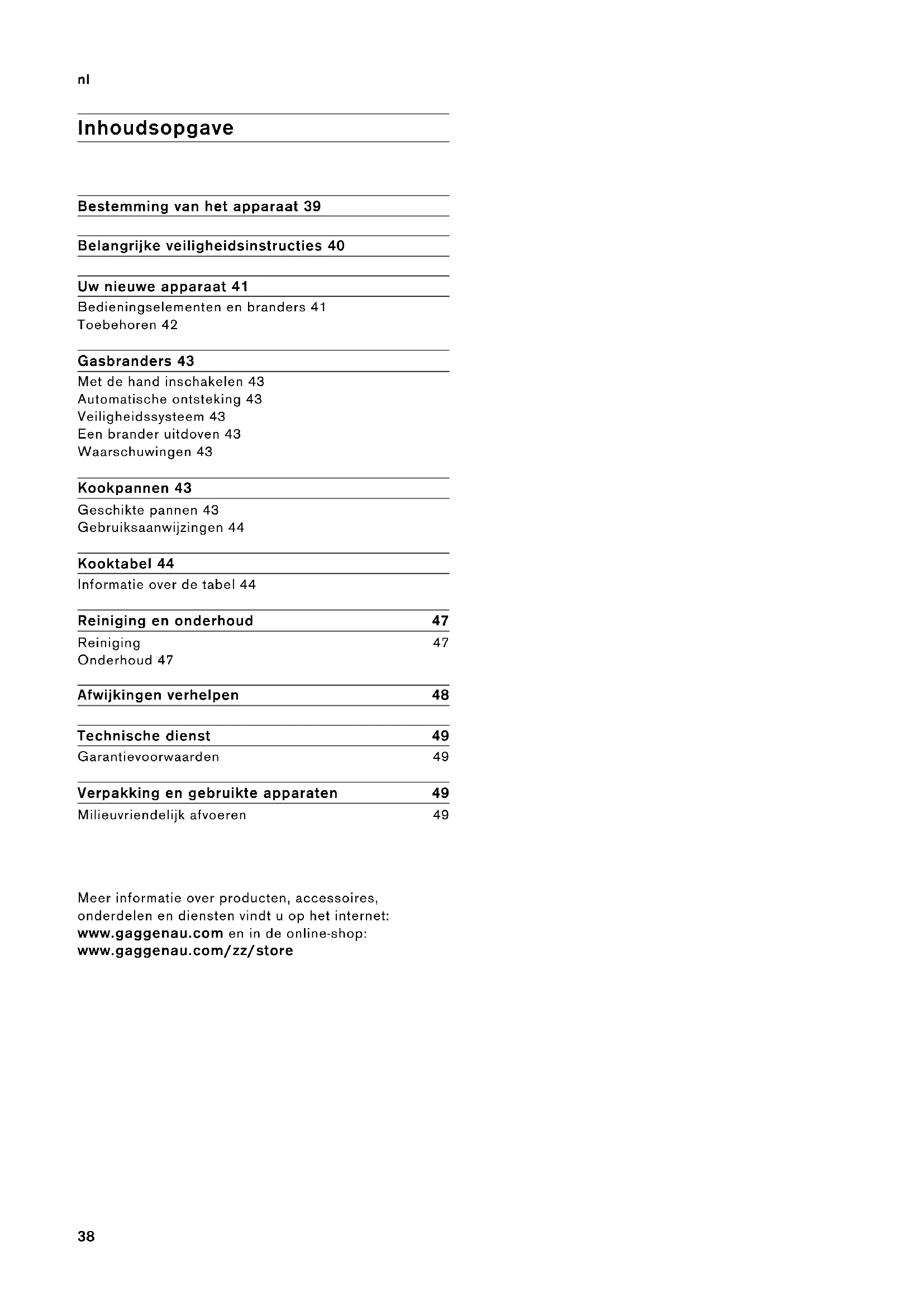 Inhoudsopgave Gebruiksaanwijzing Bestemming van het apparaat 39 Belangrijke veiligheidsinstructies 40 Uw nieuwe apparaat 41 Bedieningselementen en branders 41 Toebehoren 42 Gasbranders 43 Met de hand inschakelen 43 Automatische ontsteking 43 Veiligheidssysteem 43 Een brander uitdoven 43 Waarschuwingen 43 Kookpannen 43 Geschikte pannen 43 Gebruiksaanwijzingen 44 Kooktabel 44 Informatie over de tabel 44 Reiniging en onderhoud 47 Reiniging 47 Onderhoud 47 Afwijkingen verhelpen 48 Technische dienst 49 Garantievoorwaarden 49 Verpakking en gebruikte apparaten 49 Milieuvriendelijk afvoeren 49 Meer informatie over producten, accessoires, onderdelen en diensten vindt u op het internet: www.gaggenau.com en in de online-shop: www.gaggenau.com/zz/store39