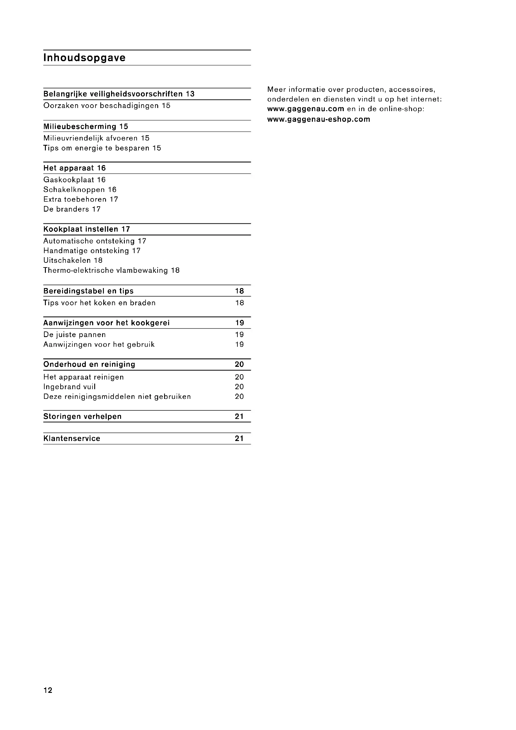 A 0810 550 555 D 089 20 355 366 CH 0848 840 04012 Inhoudsopgave Gebruiksaanwijzing Belangrijke veiligheidsvoorschriften 13 Oorzaken voor beschadigingen 15 Milieubescherming 15 Milieuvriendelijk afvoeren 15 Tips om energie te besparen 15 Het apparaat 16 Gaskookplaat 16 Schakelknoppen 16 Extra toebehoren 17 De branders 17 Kookplaat instellen 17 Automatische ontsteking 17 Handmatige ontsteking 17 Uitschakelen 18 Thermo-elektrische vlambewaking 18 Bereidingstabel en tips 18 Tips voor het koken en braden 18 Aanwijzingen voor het kookgerei 19 De juiste pannen 19 Aanwijzingen voor het gebruik 19 Onderhoud en reiniging 20 Het apparaat reinigen 20 Ingebrand vuil 20 Deze reinigingsmiddelen niet gebruiken 20 Storingen verhelpen 21 Klantenservice 21 Meer informatie over producten, accessoires, onderdelen en diensten vindt u op het internet: www.gaggenau.com en in de online-shop: www.gaggenau-eshop.com13 m Belangrijke veiligheidsvoorschriften Lees deze gebruiksaanwijzing zorgvuldig door. Alleen dan kunt u uw apparaat goed en veilig bedienen. Bewaar de gebruiksaanwijzing voor later gebruik of om door te geven aan een volgende eigenaar. Dit apparaat moet worden geïnstalleerd volgens het meegeleverde installatievoorschrift. Controleer het apparaat na het uitpakken. Niet aansluiten in geval van transportschade. Alleen een daartoe bevoegd vakman mag het toestel aansluiten. Bij schade door een verkeerde aansluiting maakt u geen aanspraak op garantie. Neem voor de omschakeling naar een ander type gas contact op met de klantenservice. Dit toestel is alleen bestemd voor huishoudelijk gebruik en de huiselijke omgeving. Het toestel alleen gebruiken voor de bereiding van voedsel en drank, nooit om te verwarmen. Houd het toestel tijdens het gebruik in de gaten. Het toestel mag alleen binnen worden gebruikt. Dit apparaat is bestemd voor gebruik tot op hoogten van maximaal 2.000 meter boven zeeniveau. Dit apparaat is niet bestemd voor gebruik met een externe tijdschakelklok of een afstandbediening. Maak voor de bescherming van kinderen geen gebruik van ongeschikte beveiligingsvoorzieningen of tralies. Dit kan leiden tot ongevallen. Dit toestel kan worden gebruikt door kinderen vanaf 8 jaar en door personen met beperkte fysieke, sensorische of geestelijke vermogens of personen die gebrek aan kennis of ervaring hebben, wanneer zij onder toezicht staan van een persoon die verantwoordelijk is voor hun veiligheid of geleerd hebben het op een veilige manier te gebruiken en zich bewust zijn van de risico's die het gebruik van het toestel met zich meebrengt. Kinderen mogen niet met het apparaat spelen. Reiniging en onderhoud van het toestel mogen niet worden uitgevoerd door kinderen, tenzij zij 8 jaar of ouder zijn en onder toezicht staan. Zorg ervoor dat kinderen die jonger zijn dan 8 jaar uit de buurt blijven van het toestel of de aansluitkabel. Veiligheidsventiel aansluiten op de gastoevoerleiding wanneer het apparaat langere tijd niet in gebruik is.