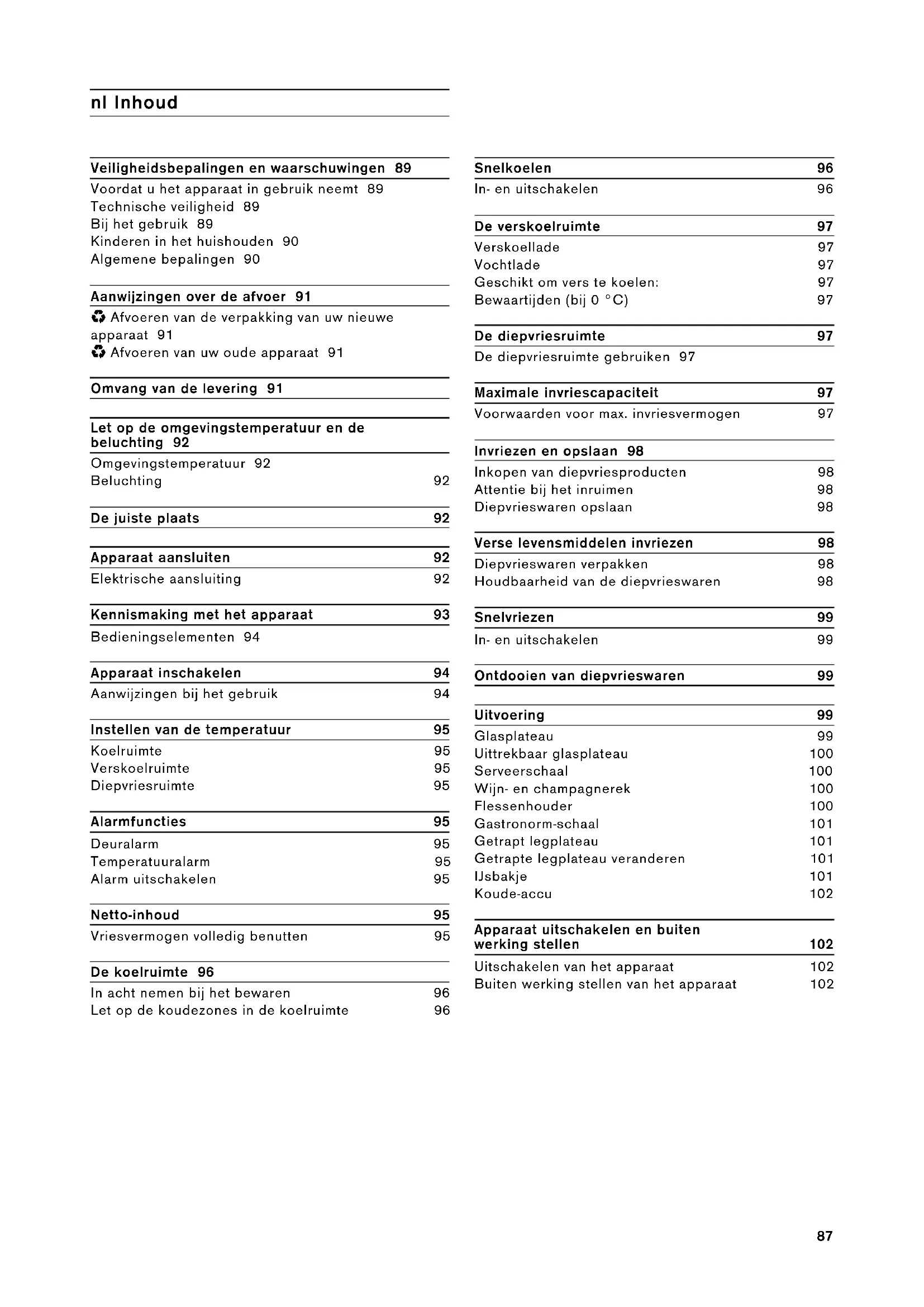 - Afvoeren van uw oude apparaat 91 Omvang van de levering 91 Let op de omgevingstemperatuur en de beluchting 92 Omgevingstemperatuur 92 Beluchting 92 De juiste plaats 92 Apparaat aansluiten 92 Elektrische aansluiting 92 Kennismaking met het apparaat 93 Bedieningselementen 94 Apparaat inschakelen 94 Aanwijzingen bij het gebruik 94 Instellen van de temperatuur 95 Koelruimte 95 Verskoelruimte 95 Diepvriesruimte 95 Alarmfuncties 95 Deuralarm 95 Temperatuuralarm 95 Alarm uitschakelen 95 Netto-inhoud 95 Vriesvermogen volledig benutten 95 De koelruimte 96 In acht nemen bij het bewaren 96 Let op de koudezones in de koelruimte 96 Snelkoelen 96 In- en uitschakelen 96 De verskoelruimte 97 Verskoellade 97 Vochtlade 97 Geschikt om vers te koelen: 97 Bewaartijden (bij 0 °C) 97 De diepvriesruimte 97 De diepvriesruimte gebruiken 97 Maximale invriescapaciteit 97 Voorwaarden voor max. invriesvermogen 97 Invriezen en opslaan 98 Inkopen van diepvriesproducten 98 Attentie bij het inruimen 98 Diepvrieswaren opslaan 98 Verse levensmiddelen invriezen 98 Diepvrieswaren verpakken 98 Houdbaarheid van de diepvrieswaren 98 Snelvriezen 99 In- en uitschakelen 99 Ontdooien van diepvrieswaren 99 Uitvoering 99 Glasplateau 99 Uittrekbaar glasplateau 100 Serveerschaal 100 Wijn- en champagnerek 100 Flessenhouder 100 Gastronorm-schaal 101 Getrapt legplateau 101 Getrapte legplateau veranderen 101 IJsbakje 101 Koude-accu 102 Apparaat uitschakelen en buiten werking stellen 102 Uitschakelen van het apparaat 102 Buiten werking stellen van het apparaat 10288 Ontdooien 102 De koel- en verskoelruimte 102 Diepvriesruimte 102 Apparaat reinigen 103 Uitvoering 103 Luchtjes 105 Verlichting (LED) 105 Energie besparen 105 Bedrijfsgeluiden 105 Heel normale geluiden 105 Voorkomen van geluiden 106 Kleine storingen zelf verhelpen 106 Servicedienst 107 Verzoek om reparatie en advies bij storingen 10789 m Veiligheidsbepalingen en waarschuwingen Voordat u het apparaat in gebruik neemt Lees de gebruiksaanwijzing en het installatievoorschrift nauwkeurig door. U vindt daarin belangrijke informatie over plaatsing, gebruik en onderhoud van het apparaat. De fabrikant aanvaardt geen aansprakelijkheid als de aanwijzingen en waarschuwingen in de gebruiksaanwijzing niet in acht worden genomen. Bewaar de gebruiksaanwijzing en het montagevoorschrift voor later gebruik of voor een eventuele latere bezitter. Technische veiligheid Het apparaat bevat een geringe hoeveelheid van het milieuvriendelijke maar brandbare koelmiddel R600a. Let erop dat de leidingen van het koelcircuit bij het transport of de installatie niet beschadigd worden. Koelmiddel dat naar buiten spuit kan vlam vatten of zich ontsteken. Bij beschadiging ▯ Open vuur of andere ontstekingsbronnen uit de buurt van het apparaat houden; ▯ Ruimte gedurende een paar minuten goed luchten; ▯ Apparaat uitschakelen en de stekker uit het stopcontact trekken; ▯ Contact opnemen met de Servicedienst. Hoe meer koelmiddel het apparaat bevat, des te groter moet de ruimte zijn waarin het apparaat wordt opgesteld. In een te kleine ruimte kan bij een lek een ontvlambaar mengsel van gas en lucht ontstaan. Per 8 g koelmiddel moet het vertrek minstens 1 m³ groot zijn. De hoeveelheid koelmiddel in uw apparaat vindt u op het typeplaatje aan de binnenkant van het apparaat. Als de aansluitkabel van het apparaat beschadigd raakt, moet deze worden vervangen door de fabrikant, de klantenservice of een andere gekwalificeerde persoon. Onvakkundige installatie en reparaties kunnen groot gevaar opleveren voor de bezitter. Reparaties mogen uitsluitend worden uitgevoerd door de fabrikant, de klantenservice of een andere gekwalificeerde persoon. Er mogen alleen originele onderdelen van de fabrikant gebruikt worden. Alleen bij deze onderdelen garandeert de fabrikant dat ze aan de veiligheidseisen voldoen. Een verlengsnoer voor de aansluitkabel mag uitsluitend via de klantenservice worden aangeschaft. Bij het gebruik ▯ Nooit elektrische apparaten in het apparaat gebruiken (bijv. verwarmingsapparaten, elektrische ijsmaker etc.). Explosiegevaar! ▯ Het apparaat nooit met een stoomreiniger ontdooien of schoonmaken! De hete stoom kan in de elektrische onderdelen terechtkomen en kortsluiting veroorzaken. Gevaar van elektrische schok! ▯ Gebruik geen puntige of scherpe voorwerpen om een laag ijs of rijp te verwijderen. U kunt hierdoor de koelleidingen beschadigen. Koelmiddel dat naar buiten spuit kan vlam vatten oftot oogletsel leiden. ▯ Geen producten met brandbare drijfgassen (bijv. spuitbussen) en geen explosieve stoffen in het apparaat opslaan. Explosiegevaar! ▯ Plint, uittrekbare manden of laden, deuren etc. niet als opstapje gebruiken of om op te leunen.90 ▯ Om te ontdooien of schoon te maken: stekker uit het stopcontact trekken resp. de zekering uitschakelen of losdraaien. Altijd aan de stekker trekken, nooit aan de aansluitkabel. ▯ Dranken met een hoog alcoholpercentage altijd goed afgesloten en staand bewaren. ▯ Geen olie of vet gebruiken op kunststof onderdelen en deurdichtingen. Ze kunnen poreus worden. ▯ De be- en ontluchtingsopeningen van het apparaat nooit afdekken. ▯ Vermijden van risico's voor kinderen en kwetsbare personen: Kwetsbaar zijn kinderen/personen met lichamelijke, geestelijke of zintuigelijk beperkingen, evenals personen die onvoldoende kennis hebben over de veilige bediening van het apparaat. Zorg ervoor dat kinderen en kwetsbare personen begrijpen wat de gevaren zijn. Een voor de veiligheid verantwoordelijke persoon moet toezicht houden op kinderen en kwetsbare personen bij het apparaat of hen instrueren. Alleen kinderen vanaf 8 jaar het apparaat laten gebruiken. Bij reiniging en onderhoud toezicht houden op kinderen. Laat kinderen nooit met het apparaat spelen. ▯ Flessen en blikjes met vloeistoffen – vooral koolzuurhoudende dranken – niet in de diepvriesruimte opslaan. Flessen en potten kunnen barsten! ▯ Diepvrieswaren nadat u ze uit de diepvriesruimte hebt gehaald, nooit onmi