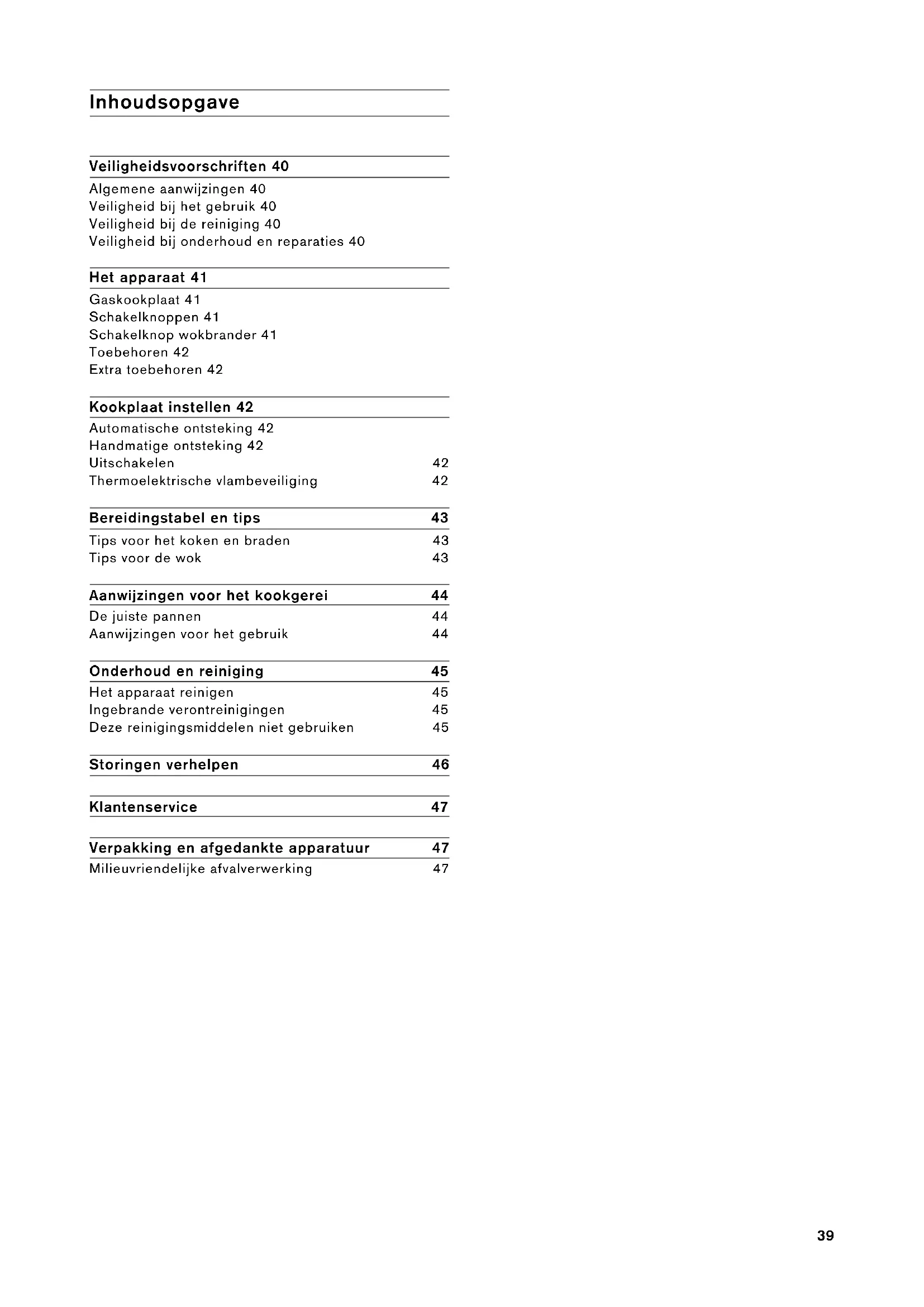 Voorste normaalbrander 180 mm pannen 160 mm pannen 120 mm Sterkbrander 220 - 240 mm 140 mm Wokbrander 220 - 240 mm Wok alleen met de wokring gebruiken. 180 mm Bij een diameter < 220 mm: Gebruik alleen de binnenste brander. Gebruik pannen van het juiste formaat voor de desbetreffende brander. Gebruik geen kleine pannen op de grote branders. De vlammen mogen niet tegen de zijkanten van de pannen aankomen. Gebruik geen vervormde pannen. Deze staan niet stevig op de kookplaat. De pannen kunnen kantelen. Gebruik alleen pannen met een vlakke en dikke bodem. Kook niet zonder deksel of als het deksel is verschoven. Een groot deel van de energie wordt op die manier verspild. Zet de pan midden op de brander, anders kan de pan kantelen. Zet grote pannen niet op de branders vlak bij het bedieningspaneel. Het paneel zou oververhit en hierdoor beschadigd kunnen raken. Zet de pannen op de pandragers, nooit direct op de branders. Controleer voor het gebruik of de pandragers en de branderkopdeksels op de juiste manier zijn geplaatst. Ga voorzichtig om met de pannen die op de kookplaat staan. Sla niet op de kookplaat en zet er geen zware voorwerpen op.45 Onderhoud en reiniging In dit hoofdstuk vindt u tips en aanwijzingen voor een optimale reiniging en onderhoud van uw kookplaat. ã=Waarschuwing Verbrandingsgevaar! Het apparaat wordt heet tijdens de bereiding. Laat het voor de reiniging afkoelen. ã=Waarschuwing Kans op een elektrische schok! Gebruik geen hogedruk- of stoomreiniger om het apparaat schoon te maken. Het apparaat reinigen Maak het apparaat na ieder gebruik schoon wanneer het is afgekoeld. Verwijder overgelopen vloeistoffen direct, laat geen resten inbranden. Plaats na het schoonmaken en drogen de onderdelen van de branders en de pandragers weer op het apparaat. Zorg ervoor dat de onderdelen van de branders op de juiste manier zijn geplaatst. De branderring en branderkopdeksel moeten bij het plaatsen ineensluiten en recht op de brander liggen. Ingebrande verontreinigingen Voor hardnekkige, ingebrande verontreinigingen kunt u bij uw vakhandelaar of bij onze klantenservice een grill-reinigings gel bestellen (bestelnummer 463582). Deze is geschikt voor de onderdelen van de branders en de roestvrijstalen vangschaal. Indien nodig, de verontreiniging een nacht laten inweken. Volg de aanwijzingen op het reinigingsmiddel. Deze reinigingsmiddelen niet gebruiken ▯ Schurende of agessieve reinigingsmiddelen ▯ Zuurhoudende reinigingsmiddelen (bijv. azijn, citroenzuur, enz.)) ▯ Chloorhoudende reinigingsmiddelen of middelen met een hoog alcoholgehalte. ▯ Ovensprays ▯ Harde, krassende sponzen, borstels of schuursponsjes. ▯ Nieuwe sponsdoekjes voor gebruik grondig uitspoelen Plaats na het schoonmaken en drogen de onderdelen van de branders en de pandragers weer op het apparaat. Zorg ervoor dat de onderdelen van de branders op de juiste manier zijn geplaatst. De branderring en branderkopdeksel moeten bij het plaatsen ineensluiten en recht op de brander liggen. Onderdeel/ oppervlak Reinigingsadvies Roestvrijstalen oppervlakken Afwasmiddel met een zachte, vochtige doek aanbrengen; met een zachte doek droogwrijven. Gebruik slechts weinig water voor het schoonmaken, er mag geen water in het apparaat komen. Attentie! Beschadiging van de afdichting: De spleet in het roestvrijstalen oppervlak rond de kookplaat alleen met een zachte borstel reinigen. Geen spitse voorwerpen gebruiken. Voor sterke verontreinigingen of door hitte veroorzaakte verkleuringen is bij uw vakhandelaar of bij onze klantenservice een reinigingsmiddel voor roestvrijstaal verkrijgbaar (bestelnummer 464524). Pandragers Voor het reinigen voorzichtig verwijderen. In de spoelbak inweken. Met een borstel en afwasmiddel reinigen. Wees voorzichtig bij het schoonmaken in de buurt van de rubberen voetjes, zodat deze niet losgaan. Afspoelen met schoon water en vóór het terugplaatsen zorgvuldig afdrogen. Niet in de vaatwasser reinigen! Schakelknoppen Met een zachte, vochtige doek en een beetje afwasmiddel reinigen; de doek mag niet te nat zijn. Attentie! Beschadiging van het apparaat: Schakelknoppen voor het reinigen niet van het apparaat trekken. Onderdelen van de branders Met schoon water afspoelen en voor het plaatsen zorgvuldig afdrogen. Niet in de vaatwasser reinigen! Vonkontsteking Indien nodig, met een kleine borstel voorzichtig reinigen. Onderdeel/ oppervlak Reinigingsadvies46 Storingen verhelpen Vaak kunt u storingen gemakkelijk zelf verhelpen. Let op de volgende aanwijzingen voordat u de klantenservice belt. Storing Mogelijke oorzaak Oplossing Algehele stroomstoring. De huiszekering heeft de elektriciteit uitgeschakeld. Controleer in de meterkast of de zekering is uitgeschakeld. De elektrische ontsteking functioneert niet. Tussen de bougies en de branders kunnen resten van levens- of reinigingsmiddelen achtergebleven zijn. De ruimte tussen de bougie en de brander moet schoon zijn. De branders zijn vochtig. De branderkopdeksels zorgvuldig afdrogen. De branderkopdeksels zijn niet correct geplaatst. Controleer of de branderkopdeksels correct zijn geplaatst. stroomstoring Brander handmatig ontsteken. Ongelijkmatige vlam De onderdelen van de brander zijn niet correct geplaatst. Onderdelen op de juiste wijze plaatsen. De openingen van de brander zijn vervuild. De openingen van de brander schoonmaken. De gastoevoer verloopt niet normaal of er wordt geen gas toegevoerd. Tussengeschakelde gaskranen zijn gesloten. De tussengeschakelde gaskranen opendraaien. Bij gebruik van een gasfles controleren of deze leeg is. Gasfles vervangen. In de keuken ruikt het naar gas. Mogelijke lekkage bij de aansluiting van de gasfles. Controleer de aansluiting van de gasfles op lekkage. De brander dooft onmiddellijk na het ontsteken. U heeft de schakelknop niet lang genoeg ingedrukt. Nadat de brander is ontstoken de schakelknop nog enkele seconden ingedrukt houden. Stevig indrukken. De openingen van de brander zijn vervuild. De openingen van de brander schoonmake