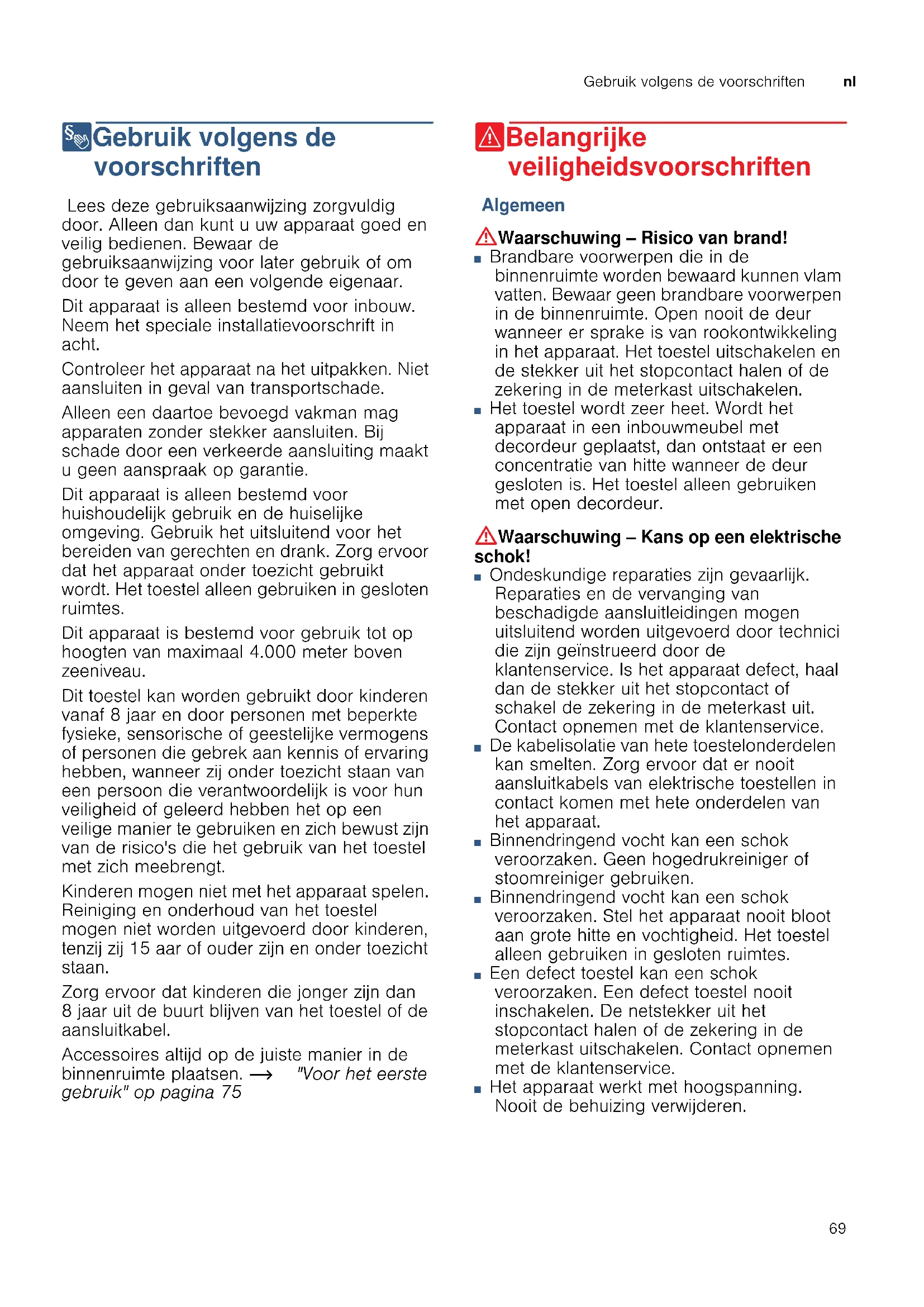 8Gebruik volgens de voorschriften Gebr ui k vol gens de voor schr i f t en Lees deze gebruiksaanwijzing zorgvuldig door. Alleen dan kunt u uw apparaat goed en veilig bedienen. Bewaar de gebruiksaanwijzing voor later gebruik of om door te geven aan een volgende eigenaar. Dit apparaat is alleen bestemd voor inbouw. Neem het speciale installatievoorschrift in acht. Controleer het apparaat na het uitpakken. Niet aansluiten in geval van transportschade. Alleen een daartoe bevoegd vakman mag apparaten zonder stekker aansluiten. Bij schade door een verkeerde aansluiting maakt u geen aanspraak op garantie. Dit apparaat is alleen bestemd voor huishoudelijk gebruik en de huiselijke omgeving. Gebruik het uitsluitend voor het bereiden van gerechten en drank. Zorg ervoor dat het apparaat onder toezicht gebruikt wordt. Het toestel alleen gebruiken in gesloten ruimtes. Dit apparaat is bestemd voor gebruik tot op hoogten van maximaal 4.000 meter boven zeeniveau. Dit toestel kan worden gebruikt door kinderen vanaf 8 jaar en door personen met beperkte fysieke, sensorische of geestelijke vermogens of personen die gebrek aan kennis of ervaring hebben, wanneer zij onder toezicht staan van een persoon die verantwoordelijk is voor hun veiligheid of geleerd hebben het op een veilige manier te gebruiken en zich bewust zijn van de risico's die het gebruik van het toestel met zich meebrengt. Kinderen mogen niet met het apparaat spelen. Reiniging en onderhoud van het toestel mogen niet worden uitgevoerd door kinderen, tenzij zij 15 aar of ouder zijn en onder toezicht staan. Zorg ervoor dat kinderen die jonger zijn dan 8 jaar uit de buurt blijven van het toestel of de aansluitkabel. Accessoires altijd op de juiste manier in de binnenruimte plaatsen. ~ "Voor het eerste gebruik" op pagina 75 (Belangrijke veiligheidsvoorschriften Be l an g r i j k e vei l i ghei dsvoor s chr i f t en Algemeen :Waarschuwing – Risico van brand! ■ Brandbare voorwerpen die in de binnenruimte worden bewaard kunnen vlam vatten. Bewaar geen brandbare voorwerpen in de binnenruimte. Open nooit de deur wanneer er sprake is van rookontwikkeling in het apparaat. Het toestel uitschakelen en de stekker uit het stopcontact halen of de zekering in de meterkast uitschakelen. Risico van brand! ■ Het toestel wordt zeer heet. Wordt het apparaat in een inbouwmeubel met decordeur geplaatst, dan ontstaat er een concentratie van hitte wanneer de deur gesloten is. Het toestel alleen gebruiken met open decordeur. :Waarschuwing – Kans op een elektrische schok! ■ Ondeskundige reparaties zijn gevaarlijk. Reparaties en de vervanging van beschadigde aansluitleidingen mogen uitsluitend worden uitgevoerd door technici die zijn geïnstrueerd door de klantenservice. Is het apparaat defect, haal dan de stekker uit het stopcontact of schakel de zekering in de meterkast uit. Contact opnemen met de klantenservice. Kans op een elektrische schok! ■ De kabelisolatie van hete toestelonderdelen kan smelten. Zorg ervoor dat er nooit aansluitkabels van elektrische toestellen in contact komen met hete onderdelen van het apparaat. Kans op een elektrische schok! ■ Binnendringend vocht kan een schok veroorzaken. Geen hogedrukreiniger of stoomreiniger gebruiken. Kans op een elektrische schok! ■ Binnendringend vocht kan een schok veroorzaken. Stel het apparaat nooit bloot aan grote hitte en vochtigheid. Het toestel alleen gebruiken in gesloten ruimtes. Kans op een elektrische schok! ■ Een defect toestel kan een schok veroorzaken. Een defect toestel nooit inschakelen. De netstekker uit het stopcontact halen of de zekering in de meterkast uitschakelen. Contact opnemen met de klantenservice. Kans op een elektrische schok! ■ Het apparaat werkt met hoogspanning. Nooit de behuizing verwijderen.nl Belangrijke veiligheidsvoorschriften