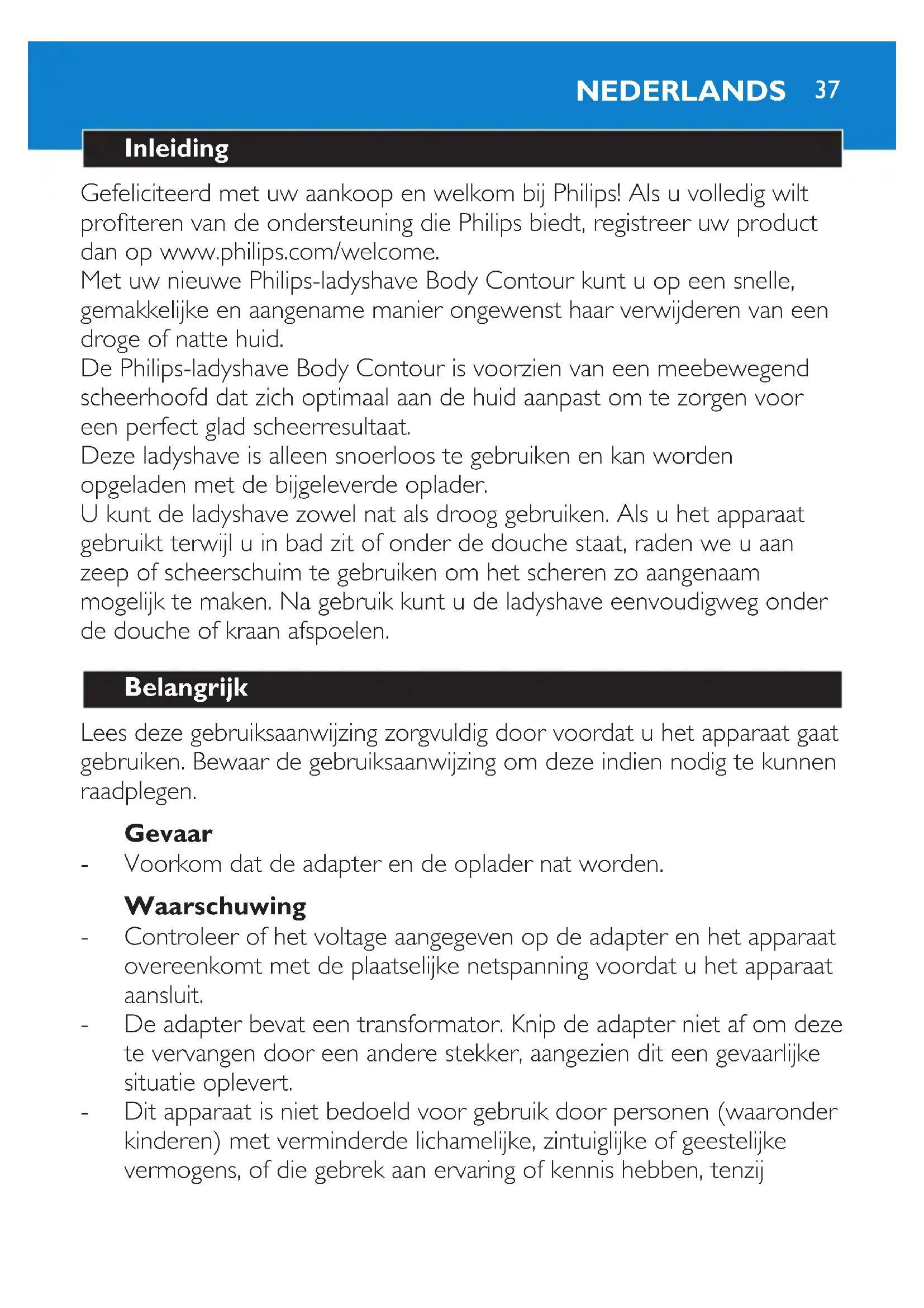 FRANÇAIS3637 Inleiding Gefeliciteerd met uw aankoop en welkom bij Philips! Als u volledig wilt proteren van de ondersteuning die Philips biedt, registreer uw product dan op www.philips.com/welcome. Met uw nieuwe Philips-ladyshave Body Contour kunt u op een snelle, gemakkelijke en aangename manier ongewenst haar verwijderen van een droge of natte huid. De Philips-ladyshave Body Contour is voorzien van een meebewegend scheerhoofd dat zich optimaal aan de huid aanpast om te zorgen voor een perfect glad scheerresultaat. Deze ladyshave is alleen snoerloos te gebruiken en kan worden opgeladen met de bijgeleverde oplader. U kunt de ladyshave zowel nat als droog gebruiken. Als u het apparaat gebruikt terwijl u in bad zit of onder de douche staat, raden we u aan zeep of scheerschuim te gebruiken om het scheren zo aangenaam mogelijk te maken. Na gebruik kunt u de ladyshave eenvoudigweg onder de douche of kraan afspoelen. Belangrijk Lees deze gebruiksaanwijzing zorgvuldig door voordat u het apparaat gaat gebruiken. Bewaar de gebruiksaanwijzing om deze indien nodig te kunnen raadplegen. Gevaar Voorkom dat de adapter en de oplader nat worden. Waarschuwing Controleer of het voltage aangegeven op de adapter en het apparaat overeenkomt met de plaatselijke netspanning voordat u het apparaat aansluit. De adapter bevat een transformator. Knip de adapter niet af om deze te vervangen door een andere stekker, aangezien dit een gevaarlijke situatie oplevert. Dit apparaat is niet bedoeld voor gebruik door personen (waaronder kinderen) met verminderde lichamelijke, zintuiglijke of geestelijke vermogens, of die gebrek aan ervaring of kennis hebben, tenzij