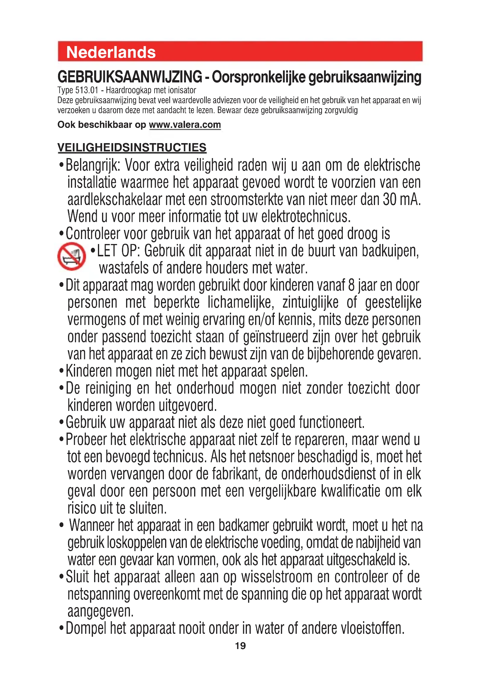 En caso de avería, se debe entregar el aparato bien embalado y con el certificado de garantía regularmente fechado y sellado por el vendedor, a uno de nuestros Centros de Asistencia autorizados o al vendedor, quien se encargará de remitirlo al importador oficial para efectuar la reparación de la garantía. 00060790 int 2020_08 26/08/2020 16:55 Pagina 1819 Nederlands GEBRUIKSAANWIJZING - Oorspronkelijke gebruiksaanwijzing Type 513.01 - Haardroogkap met ionisator Deze gebruiksaanwijzing bevat veel waardevolle adviezen voor de veiligheid en het gebruik van het apparaat en wij verzoeken u daarom deze met aandacht te lezen. Bewaar deze gebruiksaanwijzing zorgvuldig Ook beschikbaar op www.valera.com VEILIGHEIDSINSTRUCTIES