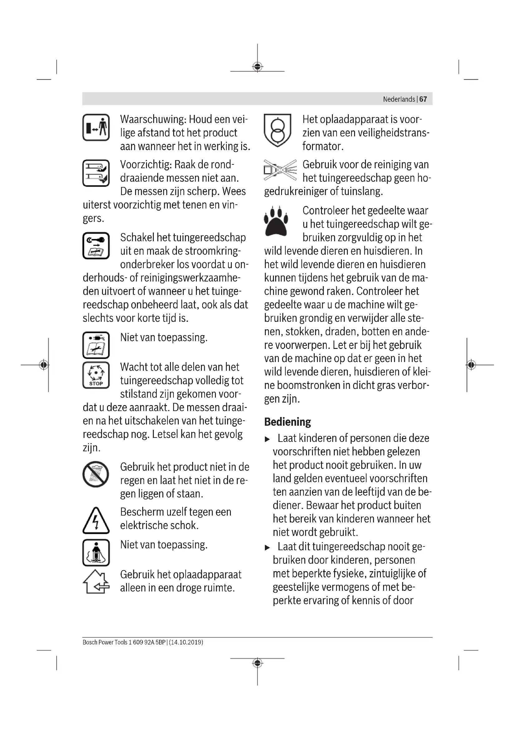 A 325 Greepbeugel monteren Werkhoogte instellen B 326 Grasbak aanbrengen of verwijderen C 327 Maaihoogte instellen D 327 Accu plaatsen E 328 Handelingsdoel Afbeel- ding Pagina Gebruik - Stroomkringonderbreker invoegen - Inschakelen - Maaien - Uitschakelen - Stroomkringonderbreker verwijderen F 329 Accu verwijderen G 330 Werkvoorschrift „maaien“ H 330 1 609 92A 5BP | (14.10.2019) Bosch Power ToolsNederlands | 73 Handelingsdoel Afbeel- ding Pagina Niveau-indicatie grasbak leeg/vol I 331 Messen onderhouden en vervangen J 331 Toebehoren kiezen K 332
