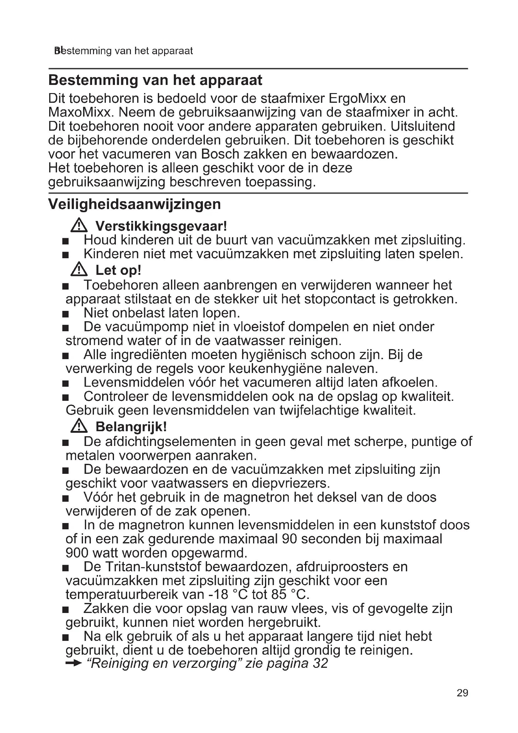 Bestemming van het apparaat Bestemming van het apparaat Dit toebehoren is bedoeld voor de staafmixer ErgoMixx en MaxoMixx. Neem de gebruiksaanwijzing van de staafmixer in acht. Dit toebehoren nooit voor andere apparaten gebruiken. Uitsluitend de bijbehorende onderdelen gebruiken. Dit toebehoren is geschikt voor het vacumeren van Bosch zakken en bewaardozen. Het toebehoren is alleen geschikt voor de in deze gebruiksaanwijzing beschreven toepassing. Veiligheidsaanwijzingen W Verstikkingsgevaar! ■ Houd kinderen uit de buurt van vacuümzakken met zipsluiting. ■ Kinderen niet met vacuümzakken met zipsluiting laten spelen. W Let op! ■ Toebehoren alleen aanbrengen en verwijderen wanneer het apparaat stilstaat en de stekker uit het stopcontact is getrokken. ■ Niet onbelast laten lopen. ■ De vacuümpomp niet in vloeistof dompelen en niet onder stromend water of in de vaatwasser reinigen. ■ Alle ingrediënten moeten hygiënisch schoon zijn. Bij de verwerking de regels voor keukenhygiëne naleven. ■ Levensmiddelen vóór het vacumeren altijd laten afkoelen. ■ Controleer de levensmiddelen ook na de opslag op kwaliteit. Gebruik geen levensmiddelen van twijfelachtige kwaliteit. W Belangrijk! ■ De afdichtingselementen in geen geval met scherpe, puntige of metalen voorwerpen aanraken. ■ De bewaardozen en de vacuümzakken met zipsluiting zijn geschikt voor vaatwassers en diepvriezers. ■ Vóór het gebruik in de magnetron het deksel van de doos verwijderen of de zak openen. ■ In de magnetron kunnen levensmiddelen in een kunststof doos of in een zak gedurende maximaal 90 seconden bij maximaal 900 watt worden opgewarmd. ■ De Tritan-kunststof bewaardozen, afdruiproosters en vacuümzakken met zipsluiting zijn geschikt voor een temperatuurbereik van -18 °C tot 85 °C. ■ Zakken die voor opslag van rauw vlees, vis of gevogelte zijn gebruikt, kunnen niet worden hergebruikt. ■ Na elk gebruik of als u het apparaat langere tijd niet hebt gebruikt, dient u de toebehoren altijd grondig te reinigen. X“Reinigingenverzorging”ziepagina3230 nl In één oogopslag De glazen doos is ook geschikt voor gebruik in de oven. Verwijder het deksel voordat u de doos in de magnetron of in de oven gebruikt. Belangrijk! – Vul de doos nooit verder dan tot 1 cm onder de bovenrand. – De glazen doos kan direct uit de vrieskast in de verwarmde oven worden gezet. – Plaats een hete doos nooit in het water. Laat de doos langzaam afkoelen. Deksel met vacuümsluiting Voor het luchtdicht afsluiten van de bewaardoos. De deksels van de bewaardozen zijn van een vacuümindicatie voorzien. Als de indicatie zich zichtbaar naar binnen welft, is het vacuüm bereikt. Om een deksel te verwijderen als er een vacuüm aanwezig is, eerst de vacuümsluiting aan een uiteinde vastnemen en omhoog trekken. Er moet voldoende lucht binnenkomen om het deksel te kunnen verwijderen. De deksels van de bewaardozen zijn van een datumindicatie voorzien. Door het verdraaien van de beide ringen kan worden ingesteld op welke dag en maand de levensmiddelen zijn gevuld. Afdruiprooster Het afdruiprooster dient ervoor om levensmiddelen tijdens de opslag van uittredende vloeistoffen te scheiden. De vloeistoffen verzamelen zich onder het afdruiprooster. Vacuümzakken met zipsluiting Voor het onder vacuüm bewaren van levensmiddelen om de versheid en houdbaarheid ervan te verlengen, de levensmiddelen te marineren of opnieuw op te warmen in de magnetron dan wel om de levensmiddelen voor het sous-vide koken voor te bereiden. In één oogopslag X Afb. A 1 Vacuümpomp a Vacuümventiel b Aansluiting voor basisapparaat 2 Bewaardozen * a Doos van: – Tritan-kunstof * – glas * b Afdruiprooster * c Deksel d Sluitclips e Vacuümsluiting f Vacuümindicatie g Instelringen voor datum (dag/maand) h Dekselafdichting 3 Vacuümzakken met zipsluiting * a Zipsluiting b Markeringslijn max c Vacuümsluiting