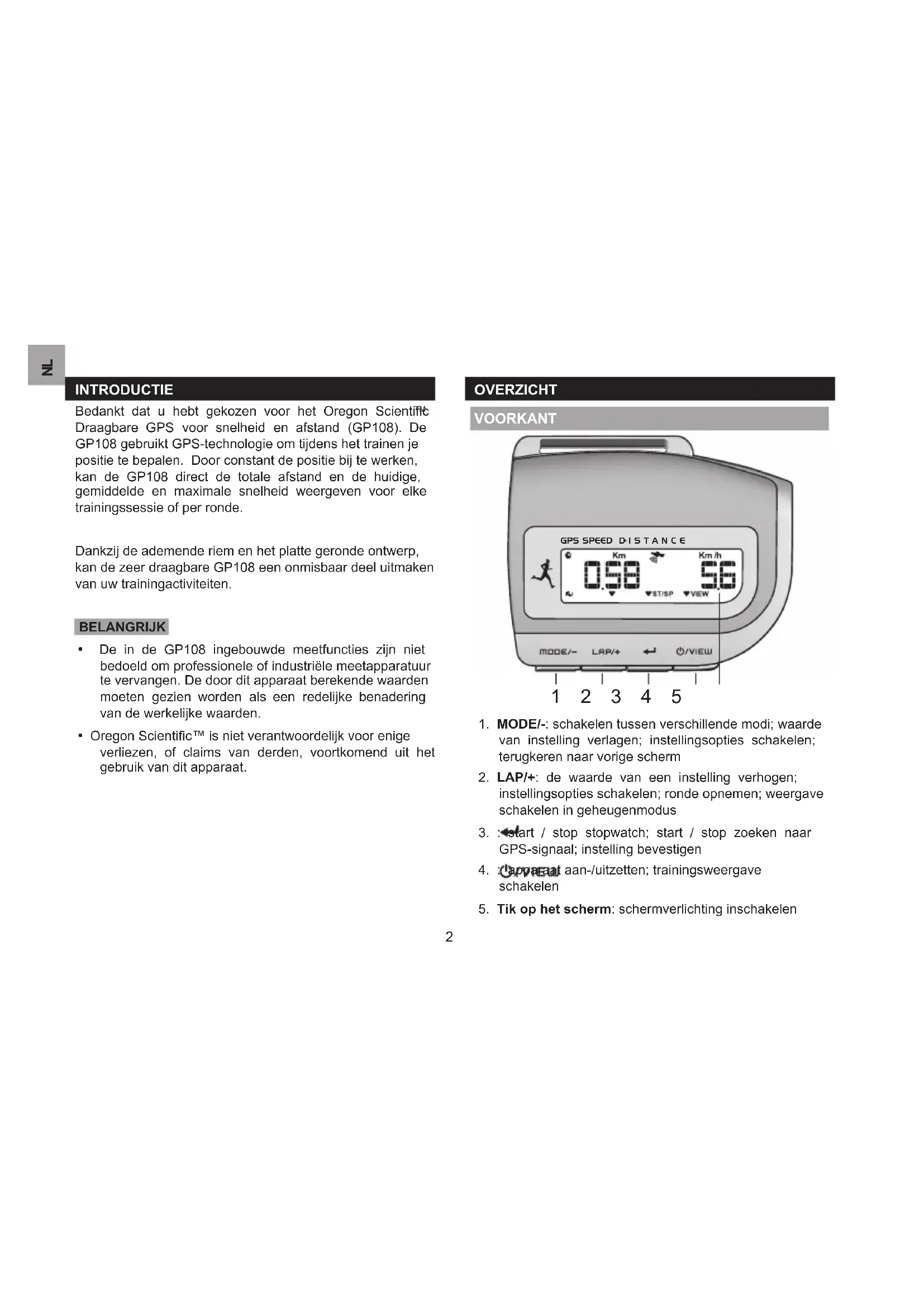 - Oregon Scientific™ is niet verantwoordelijk voor enige verliezen, of claims van derden, voortkomend uit het gebruik van dit apparaat. OVERZICHT VOORKANT GPS SPEED D I S T A N C E
