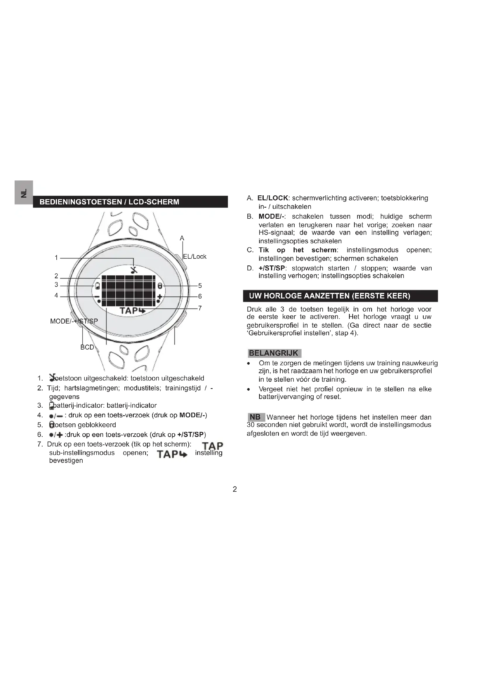 sub-instellingsmodus openen; instellinginstelling bevestigen A. EL/LOCK: schermverlichting activeren; toetsblokkering in- / uitschakelen B. MODE/-: schakelen tussen modi; huidige scherm verlaten en terugkeren naar het vorige; zoeken naar HS-signaal; de waarde van een instelling verlagen; instellingsopties schakelen C. Tik op het scherm: instellingsmodus openen; instellingen bevestigen; schermen schakelen D. +/ST/SP: stopwatch starten / stoppen; waarde van instelling verhogen; instellingsopties schakelen UW HORLOGE AANZETTEN (EERSTE KEER) Druk alle 3 de toetsen tegelijk in om het horloge voor de eerste keer te activeren. Het horloge vraagt u uw gebruikersproel in te stellen. (Ga direct naar de sectie ‘Gebruikersproel instellen’, stap 4). BELANGRIJK