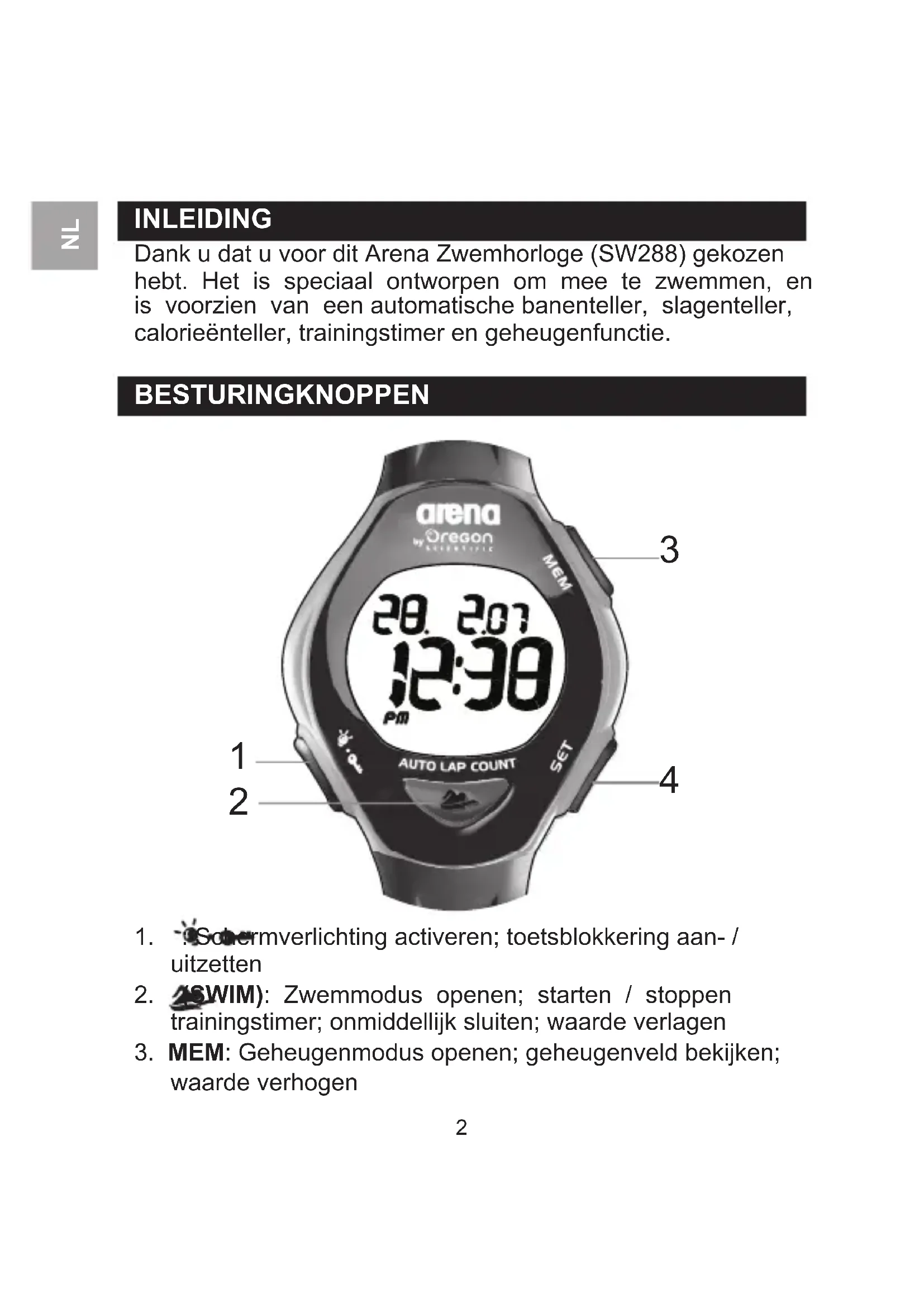 INLEIDING Dank u dat u voor dit Arena Zwemhorloge (SW288) gekozen hebt. Het is speciaal ontworpen om mee te zwemmen, en is voorzien van een automatische banenteller, slagenteller, calorieënteller, trainingstimer en geheugenfunctie. BESTURINGKNOPPEN