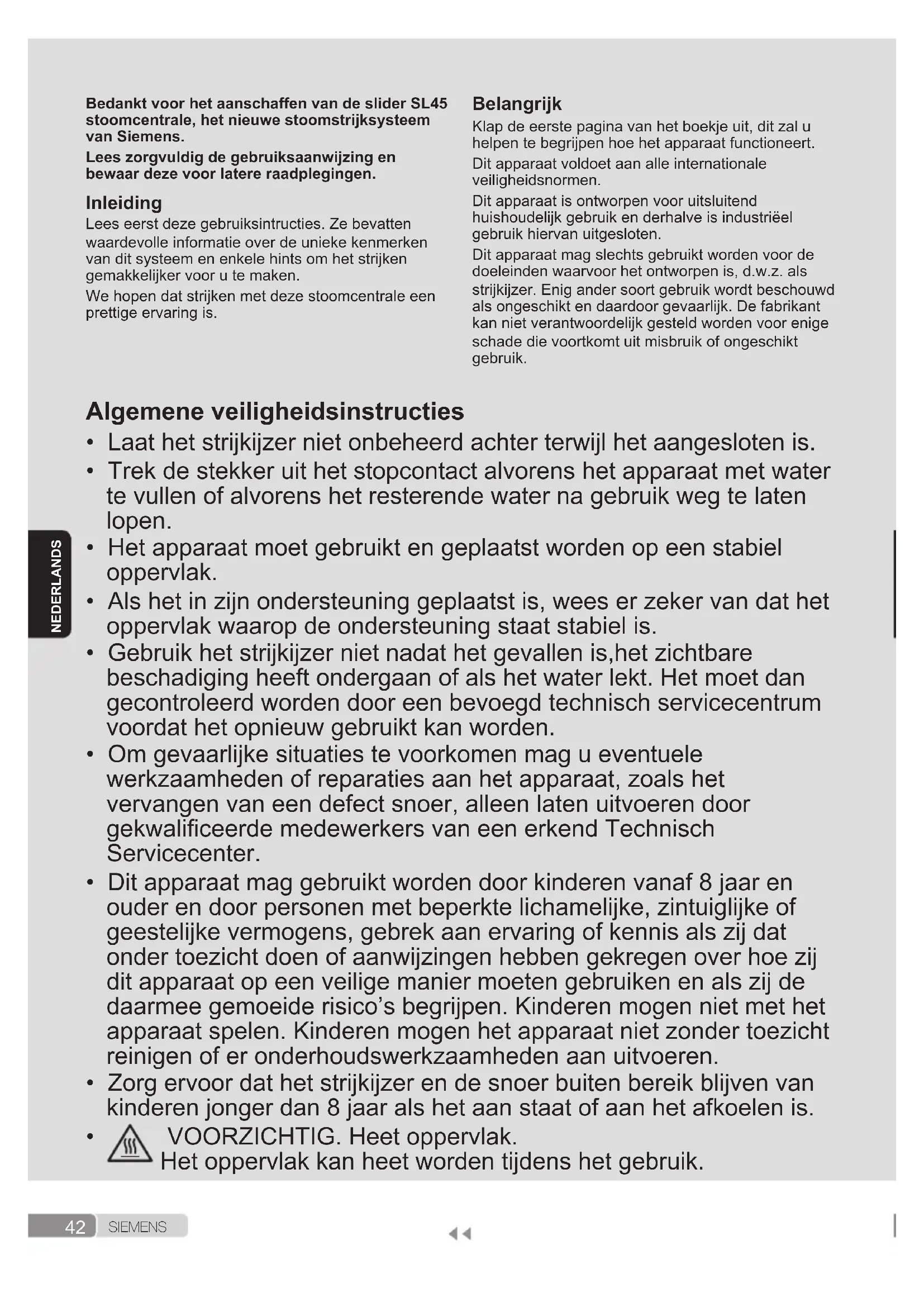 Dit apparaat bereikt hoge temperaturen en produceert stoom gedurende het gebruik. Dit kan brandwonden veroorzaken bij oneigenlijk gebruik. De stoomslang, het basisstation, de metalen plaat aan de onderzijde van de afneembare onderzetter (2) en vooral het strijkijzer zelf kunnen erg heet worden tijdens het gebruik. Dit is normaal. Richt de stoom nooit op mensen of dieren. Voorkom dat het snoer in aanraking komt met de hete zoolplaat. Let erop dat het systeem nog korte tijd kan stoom kan afgeven nadat de stoomhendel wordt losgelaten. Dit is een normale functie.44 S I E M E N S