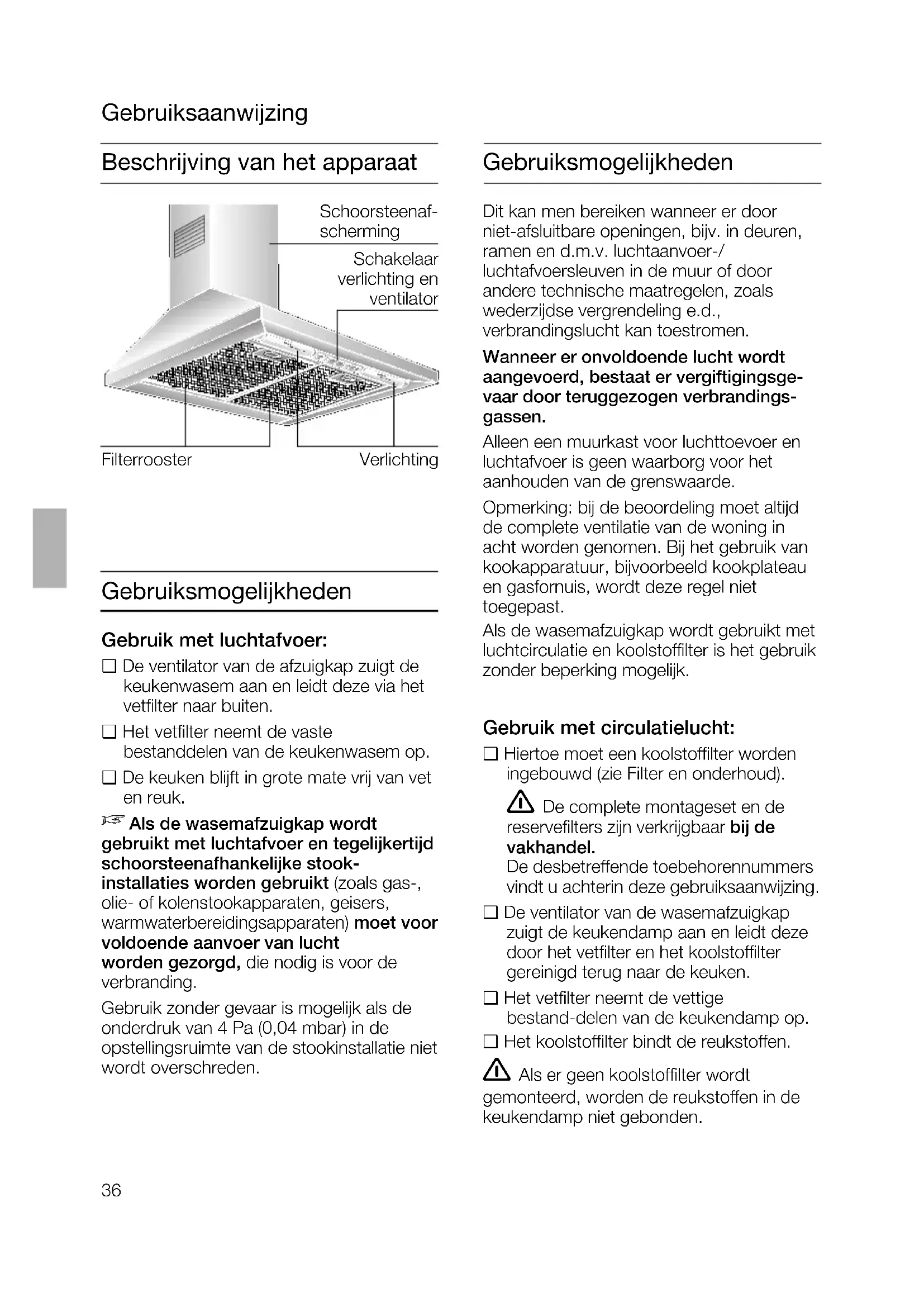 Als de wasemafzuigkap wordt gebruikt met luchtafvoer en tegelijkertijd schoorsteenafhankelijke stook- installaties worden gebruikt (zoals gas-, olie- of kolenstookapparaten, geisers, warmwaterbereidingsapparaten) moet voor voldoende aanvoer van lucht worden gezorgd, die nodig is voor de verbranding. Gebruik zonder gevaar is mogelijk als de onderdruk van 4 Pa (0,04 mbar) in de opstellingsruimte van de stookinstallatie niet wordt overschreden. Dit kan men bereiken wanneer er door niet-afsluitbare openingen, bijv. in deuren, ramen en d.m.v. luchtaanvoer-/ luchtafvoersleuven in de muur of door andere technische maatregelen, zoals wederzijdse vergrendeling e.d., verbrandingslucht kan toestromen. Wanneer er onvoldoende lucht wordt aangevoerd, bestaat er vergiftigingsge- vaar door teruggezogen verbrandings- gassen. Alleen een muurkast voor luchttoevoer en luchtafvoer is geen waarborg voor het aanhouden van de grenswaarde. Opmerking: bij de beoordeling moet altijd de complete ventilatie van de woning in acht worden genomen. Bij het gebruik van kookapparatuur, bijvoorbeeld kookplateau en gasfornuis, wordt deze regel niet toegepast. Als de wasemafzuigkap wordt gebruikt met luchtcirculatie en actieve-koolfilter is het gebruik zonder beperking mogelijk. Als de afvoerlucht door de buitenmuur wordt geleid, moet een telescoop-muur- kast worden gebruikt.