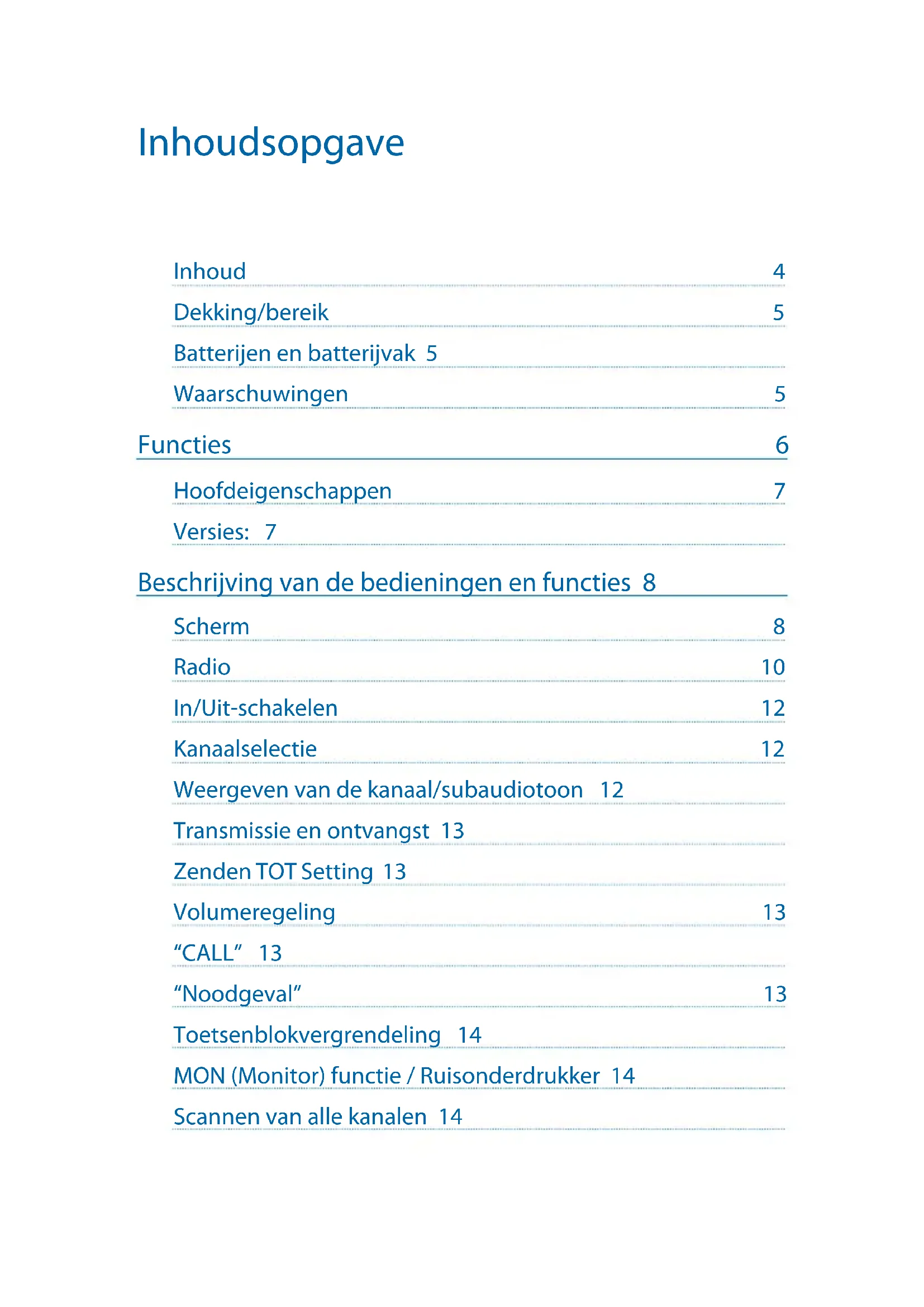 - Gebruik geen detergenten, alcohol, oplosmiddelen of schuurmidde- len om de apparatuur te reinigen. Gebruik enkel een zachte, propere doek. Indien de radio zeer vuil is, bevochtig de doek lichtjes met een mengsel van water en een neutrale zeep.6 | Gebruikers handleiding Midland G9/G9E Plus Functies