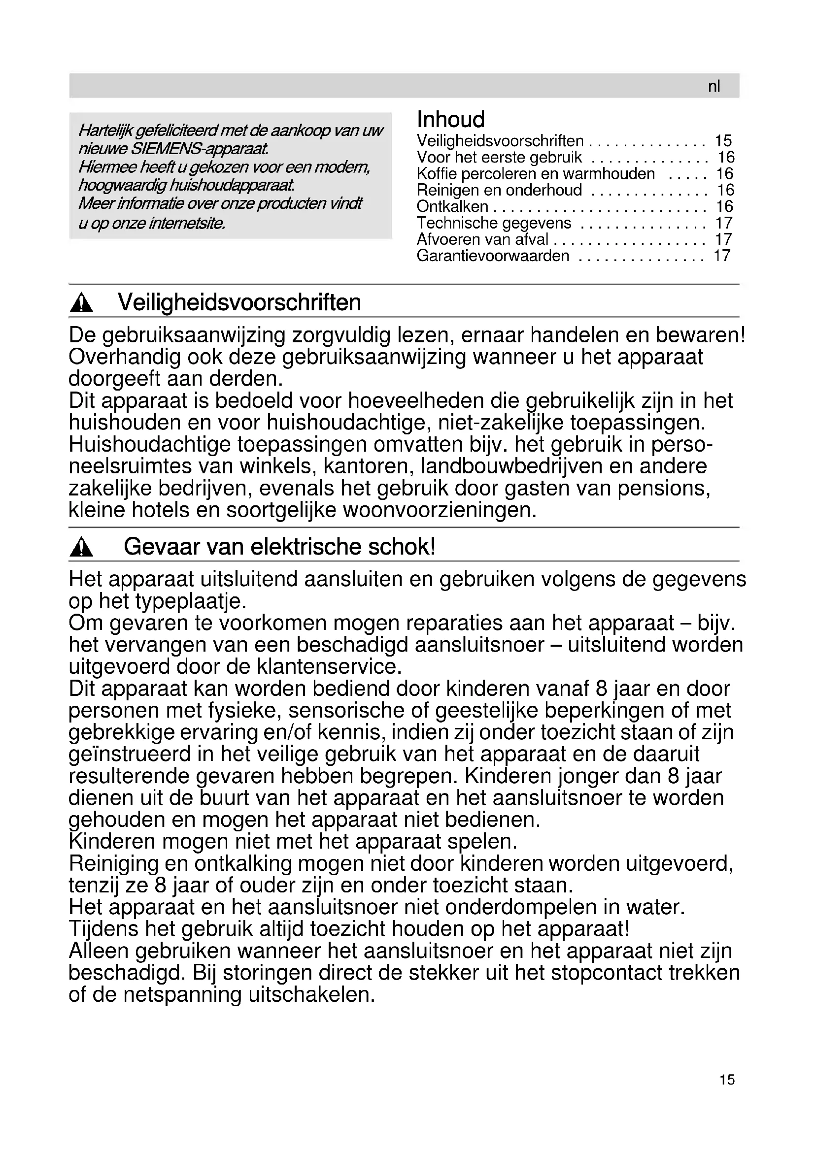 Hartelijk gefeliciteerd met de aankoop van uw nieuwe SIEMENS-apparaat. Hiermee heeft u gekozen voor een modern, hoogwaardig huishoudapparaat. Meer informatie over onze producten vindt u op onze internetsite.16 , Verbrandings- en brandgevaar! Delen van het apparaat en glazen kan tijdens het gebruik alleen aan de daarvoor voorziene grepen vastpakken. Het apparaat niet neer- zetten op of in de buurt van hete oppervlakken, bijv. fornuisplaten. Neerzetoppervlak voor kan nooit afdekken. , Verstikkingsgevaar! Laat kinderen niet met het verpakkingsmateriaal spelen. Deze gebruiksaanwijzing beschrijft verschillende modellen: – Basismodel (afb. 6a) met alleen een aan-/uitschakelaar,– model (afb. 6b) heeft een extra schake-laar voor kopjesselectie,Alle modellen zijn geprogrammeerd met een automatische uitschakeling „auto off” (energiebesparing), die het apparaat na ca. 40 minuten uitschakelt. Voor het eerste gebruik Tweemaal 9 kopjes water laten doorlopen om het apparaat te reinigen. Mogelijk verspreidt het apparaat ongewenste geuren, die echter geen kwaad kunnen.Laat in dit geval een verdunde azijnoplossing doorlopen (2 kopjes azijn op 6 kopjes water) en daarna tweemaal 9 kopjes water. Koffie percoleren en warmhouden Afb. 1 t/m 5Uitsluitend schoon water in het water-reservoir doen en nooit melk, thee of koffie (verandering van de smaak bij de volgende maal koffiezetten)!Filterzakje 1x4 in de filterhouder doen.Middelfijn gemalen koffie gebruiken (ons advies is ca. 7 g per kopje), bij weinig kopjes iets meer koffie per kopje nemen dan bij een groter aantal kopjes.Minstens 3 grote kopjes zetten, anders heeft de koffie nog niet de gewenste temperatuur en sterkte.= ca. 125 ml = ca. 85 mlNa uitschakeling van het apparaat blijft het warmhoudplaatje nog enige tijd warm.Het koffiezetapparaat moet 5 minuten afkoelen voordat u er opnieuw water in mag doen.U kunt zo ook thee zetten. Schakelaar voor het aantal kopjes Door op 3–6 (3–6 kopjes) of op 7–10 (7–10 kopjes) te drukken, kunt u de sterkte en daarmee het aroma kiezen. Reinigen en onderhoud Gevaar van een elektrische schok Voor het reinigen de stekker uit het stop- contact trekken. Het apparaat niet in water dompelen en niet in de afwasautomaat doen. Geen stoomreiniger gebruiken. Alle onderdelen die met koffie in contact komen, dienen na elk gebruik gereinigd te worden. Achtergebleven resten hebben een negatieve invloed op de smaak.Alle losse onderdelen zijn geschikt voor reiniging in de afwasautomaat; niet boven de verwarming plaatsen of vastklemmen (ze kunnen vervormd raken).De buitenzijde van de behuizing uitsluitend reinigen met een vochtige doek. Geen schurende middelen gebruiken. Ontkalken Het apparaat regelmatig ontkalken; uiterlijk wanneer– de percolatietijd langer wordt,– er bovenmatig veel stoom ontstaat,– het apparaat meer lawaai maakt.Ontkalkingsmiddel doseren volgens de aan-wijzingen van de fabrikant en in het water-reservoir gieten.De oplossing 5 minuten laten staan, vervol-gens het apparaat inschakelen, na 1 minuut weer uitschakelen en 10 minuten laten staan. Dit minstens driemaal herhalen (bij sterke verkalking vaker). De resterende hoeveelheid laten doorlopen. nl17 Tweemaal 9 kopjes schoon water laten doorlopen. Bij de varianten met keuze van het aantal kopjes dient u de schakelaar tijdens het ontkalken op 3–6 kopjes te zetten. Alle losse onderdelen grondig afspoelen. Ontkalkingsadvies Bij normale waterhardheid en dagelijks gebruik het apparaat om de 6 weken ontkalken. Bij gebruik van ontkalkingsmiddel op azijn- of citroenzuurbasis om de 3 weken ontkalken. Technische gegevens Afvoeren van afval Dit apparaat is geclassificeerd volgens de Europese richtlijn 2012/19/EG over oude elektrische en elektronische apparatuur (waste electrical and electronic equipment – WEEE). Deze richtlijn vormt voor de gehele EU een kader voor de terugname en recycling van oude apparaten. Voor actuele informatie over de afvoer van het oude apparaat kunt u terecht bij de vakhandel of bij uw gemeente. Garantievoorwaarden Voor dit apparaat gelden de garantievoor- waarden die worden uitgegeven door de vertegenwoordiging van ons bedrijf in het land van aankoop. De leverancier bij wie u het apparaat hebt gekocht geeft u hierover graag meer informatie. Om aanspraak te maken op de garantie hebt u altijd uw aankoopbewijs nodig.