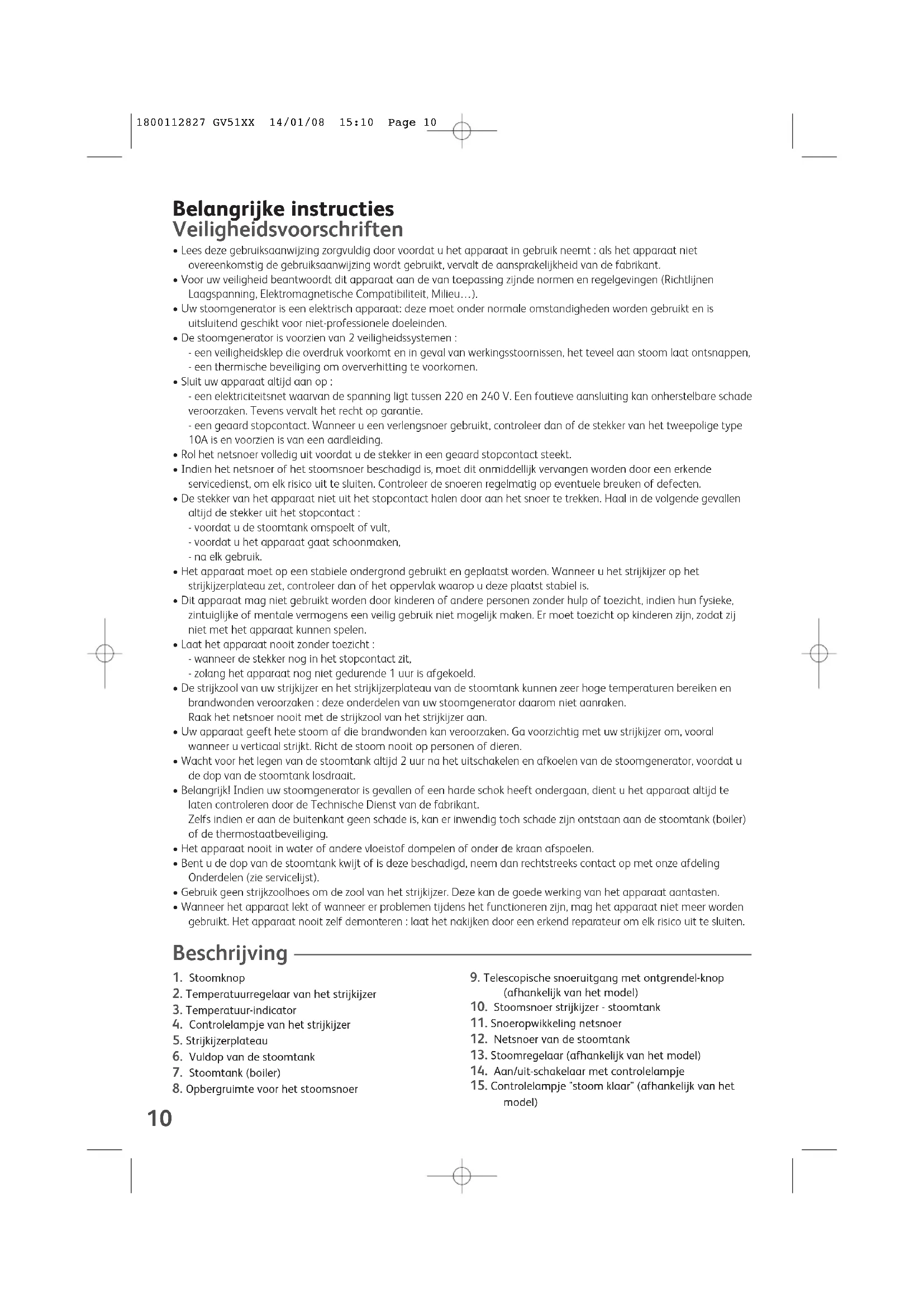 - Uw stoomgenerator is een elektrisch apparaat: deze moet onder normale omstandigheden worden gebruikt en is uitsluitend geschikt voor niet-professionele doeleinden.