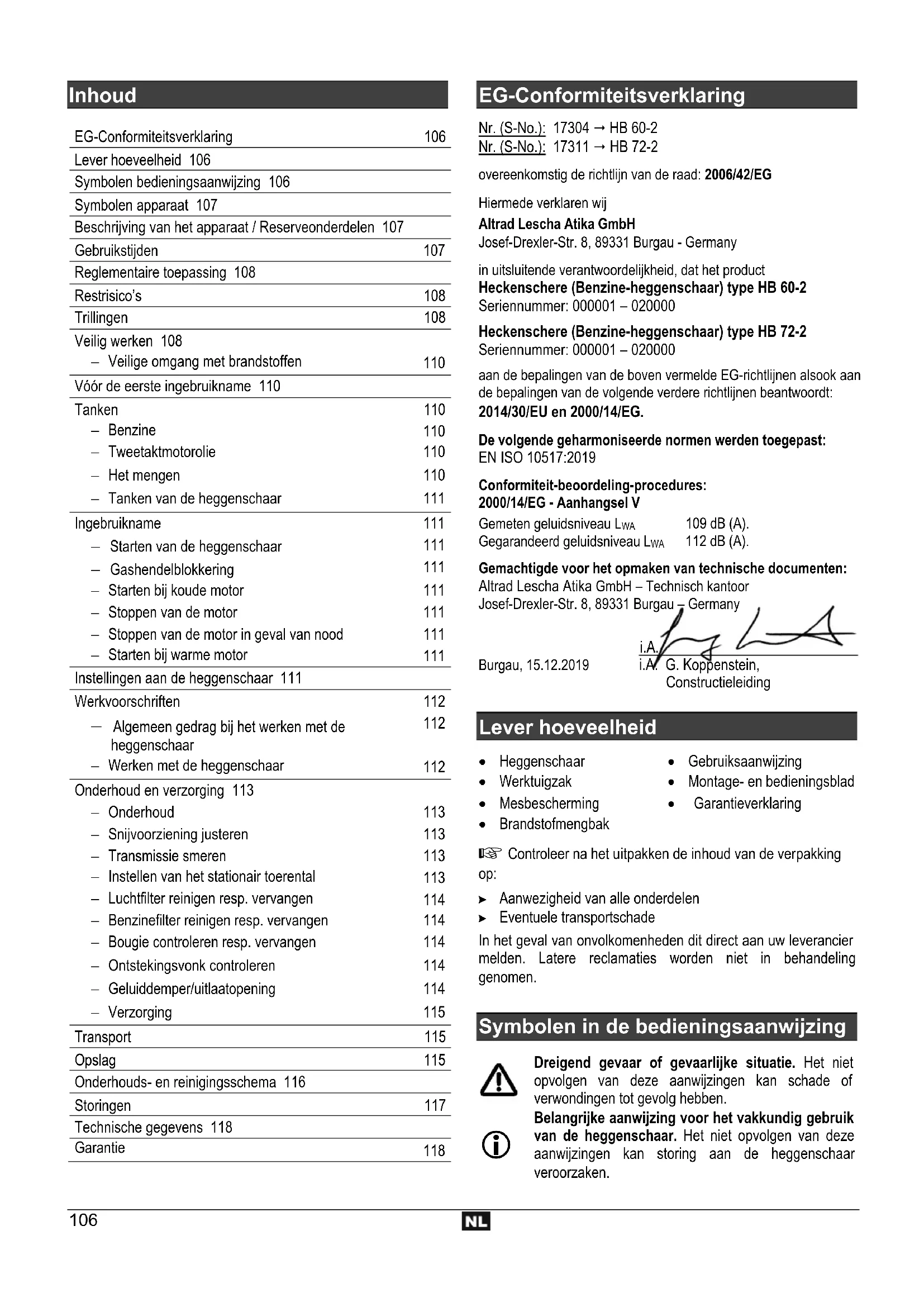 Con riserva di apportare modifiche tecniche.106 Inhoud EG-Conformiteitsverklaring 106 Lever hoeveelheid 106 Symbolen bedieningsaanwijzing 106 Symbolen apparaat 107 Beschrijving van het apparaat / Reserveonderdelen 107 Gebruikstijden 107 Reglementaire toepassing 108 Restrisico’s 108 Trillingen 108 Veilig werken 108 Veilige omgang met brandstoffen
