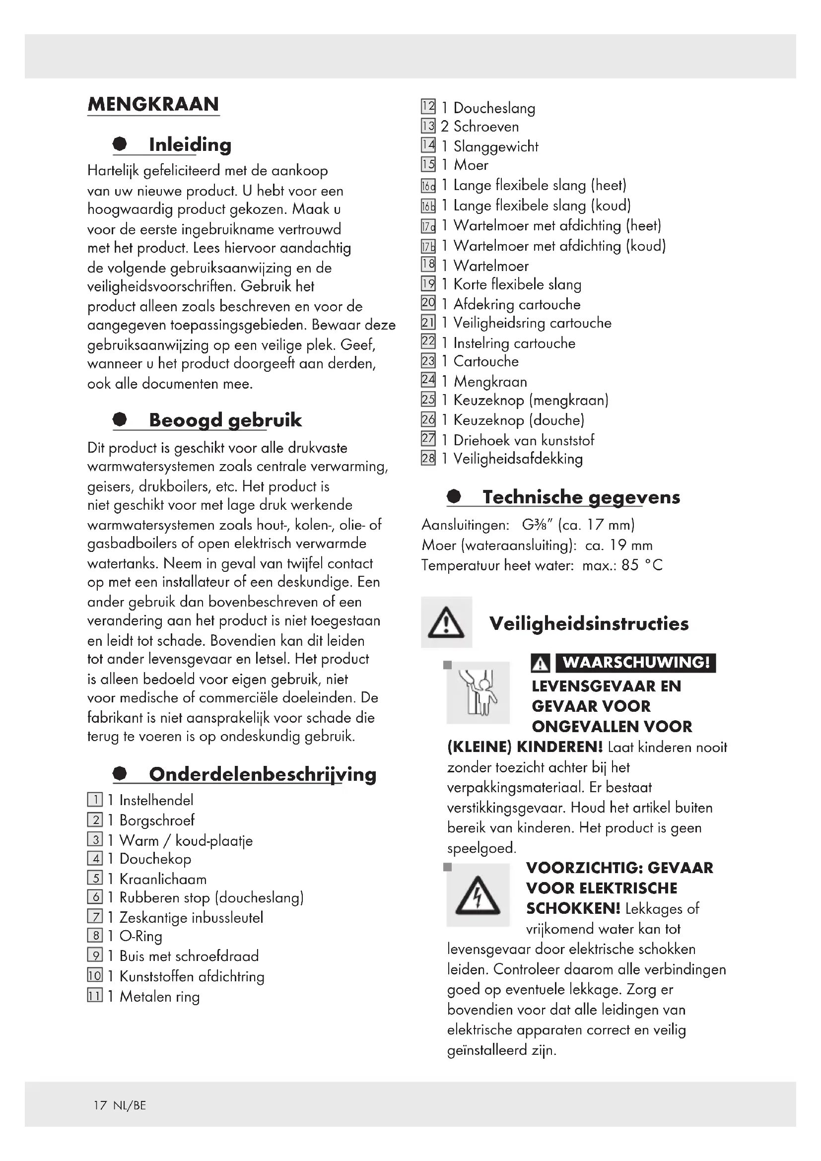 1 Veiligheidsafdekking § Technische gegevens Aansluitingen: G3⁄8” (ca. 17 mm) Moer (wateraansluiting): ca. 19 mm Temperatuur heet water: max.: 85 °C Veiligheidsinstructies