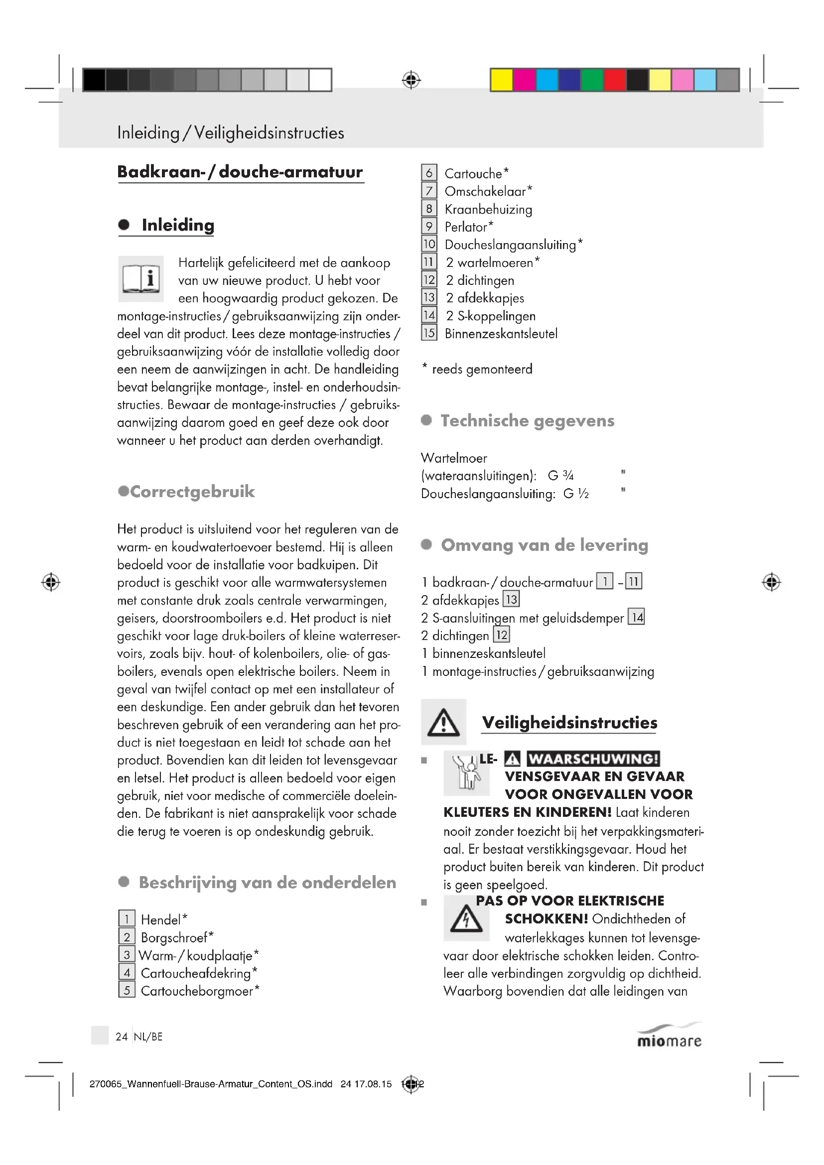 SCHOKKEN! Ondichtheden of waterlekkages kunnen tot levensge- vaar door elektrische schokken leiden. Contro- leer alle verbindingen zorgvuldig op dichtheid. Waarborg bovendien dat alle leidingen van 270065_Wannenfuell-Brause-Armatur_Content_OS.indd 24 17.08.15 16:1225 NL/BE Veiligheidsinstructies / Montage Inleiding / Veiligheidsinstructies elektrische apparaten correct en veilig geïnstal- leerd zijn. VOORZICHTIG! GEVAAR VOOR LETSEL! Zorg ervoor dat alle onderdelen intact en des- kundig gemonteerd zijn. Bij ondeskundige mon- tage bestaat gevaar voor letsel. Let er alstublieft op dat alle dichtingen aan slijtage onderhevig zijn en regelmatig moeten worden vervangen. Beschadigde onderdelen kunnen de veiligheid en de functionaliteit beïnvloeden. Let op dat alle afdichtingen correct gemon- teerd zijn. GEVAAR VOOR BRANDWONDEN! Let er bij de warmwaterinstelling op dat u de water- temperatuur niet te heet instelt. VOORZICHTIG! Zorg ervoor, dat het warm- / koudplaatje