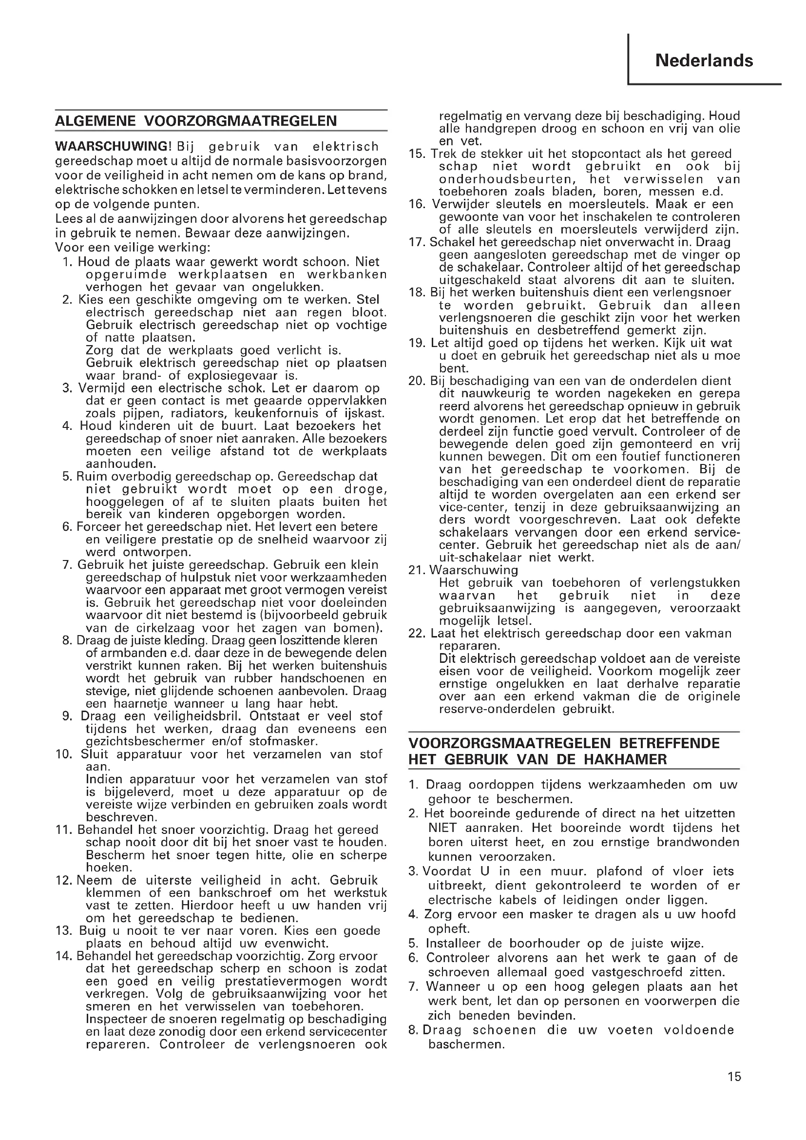 Nederlands ALGEMENE VOORZORGMAATREGELEN WAARSCHUWING! Bij gebruik van elektrisch gereedschap moet u altijd de normale basisvoorzorgen voor de veiligheid in acht nemen om de kans op brand, elektrische schokken en letsel te verminderen. Let tevens op de volgende punten. Lees al de aanwijzingen door alvorens het gereedschap in gebruik te nemen. Bewaar deze aanwijzingen. Voor een veilige werking:
