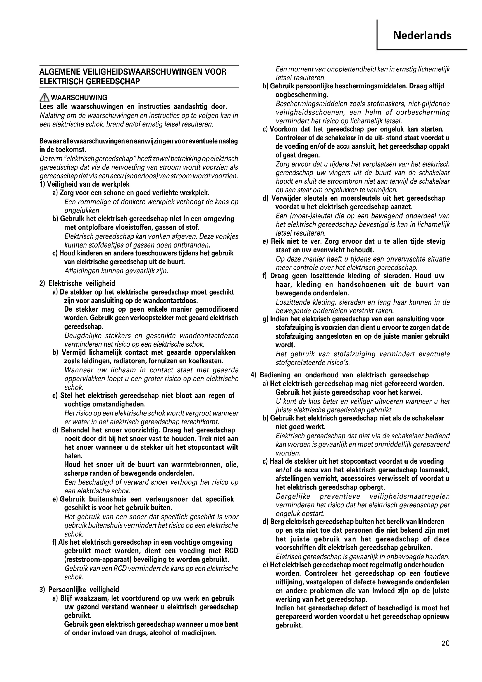 a) Blijf waakzaam, let voortdurend op uw werk en gebruik uw gezond verstand wanneer u elektrisch gereedschap gebruikt. Gebruik geen elektrisch gereedschap wanneer u moe bent of onder invloed van drugs, alcohol of medicijnen. Eén moment van onoplettendheid kan in ernstig lichamelijk letsel resulteren. b) Gebruik persoonlijke beschermingsmiddelen. Draag altijd oogbescherming. Beschermingsmiddelen zoals stofmaskers, niet-glijdende veiligheidsschoenen, een helm of oorbescherming vermindert het risico op lichamelijk letsel. c) Voorkom dat het gereedschap per ongeluk kan starten. Controleer of de schakelaar in de uit- stand staat voordat u de voeding en/of de accu aansluit, het gereedschap oppakt of gaat dragen. Zorg ervoor dat u tijdens het verplaatsen van het elektrisch gereedschap uw vingers uit de buurt van de schakelaar houdt en sluit de stroombron niet aan terwijl de schakelaar op aan staat om ongelukken te vermijden. d) Verwijder sleutels en moersleutels uit het gereedschap voordat u het elektrisch gereedschap aanzet. Een (moer-)sleutel die op een bewegend onderdeel van het elektrisch gereedschap bevestigd is kan in lichamelijk letsel resulteren. e) Reik niet te ver. Zorg ervoor dat u te allen tijde stevig staat en uw evenwicht behoudt. Op deze manier heeft u tijdens een onverwachte situatie meer controle over het elektrisch gereedschap. f) Draag geen loszittende kleding of sieraden. Houd uw haar, kleding en handschoenen uit de buurt van bewegende onderdelen. Loszittende kleding, sieraden en lang haar kunnen in de bewegende onderdelen verstrikt raken. g) Indien het elektrisch gereedschap van een aansluiting voor stofafzuiging is voorzien dan dient u ervoor te zorgen dat de stofafzuiging aangesloten en op de juiste manier gebruikt wordt. Het gebruik van stofafzuiging vermindert eventuele stofgerelateerde risico’s.