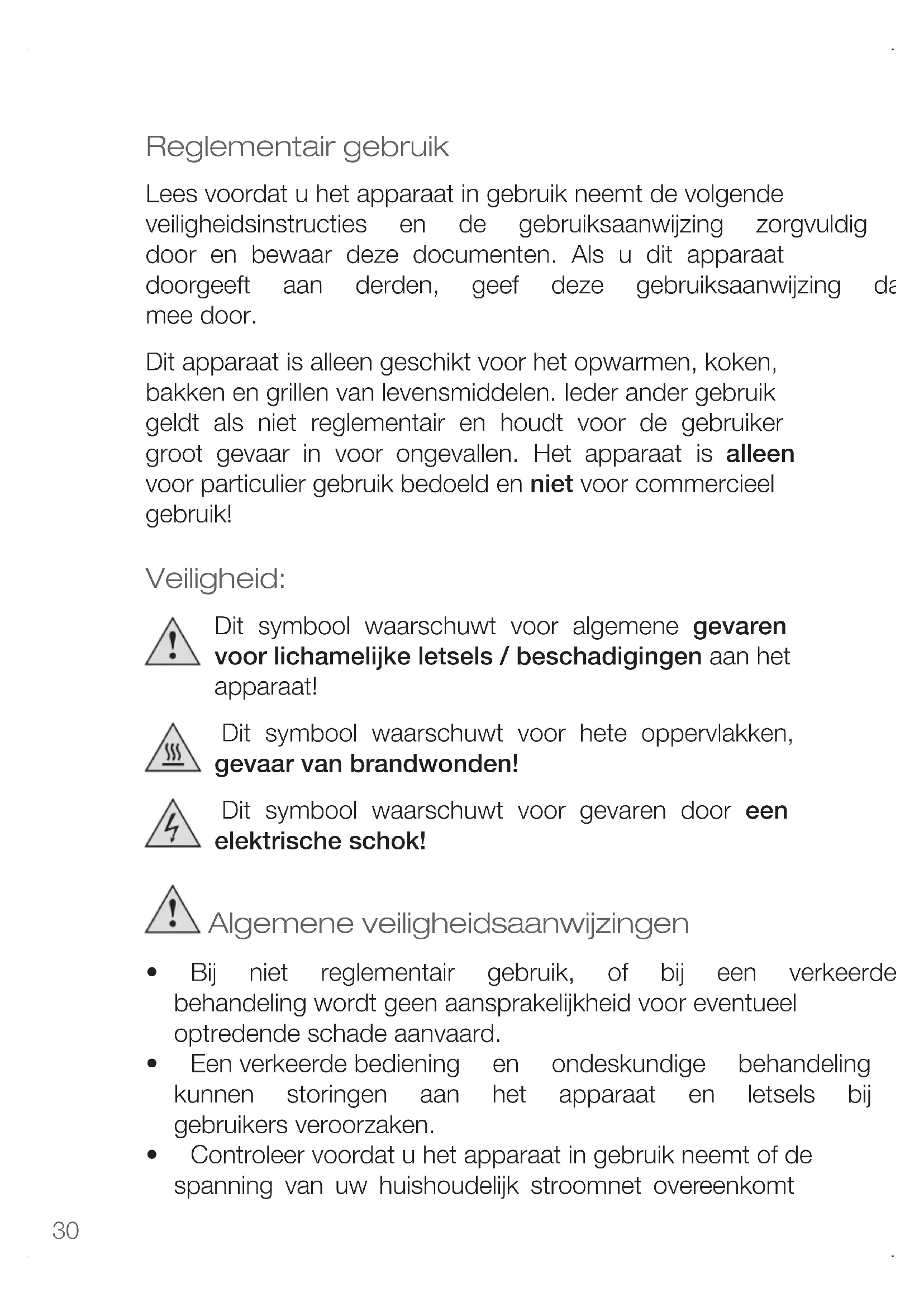 - fordamagescausedbyowner This guarantee does not affect your statutory right, nor any legal right you may have as a costumer under applicable national legislation governing the purchase of goods. Inordertoasserthis/herrightinaguaranteecaseduringthe guaranteed period, the customer must provide evidence of thedateofpurchase(receipt). The guarantee is to be asserted against KORONA electric GmbH, Sundern/Germany. Service Address: KORONA Service, Am Steinbach 9, 59872 Meschede, Germany Telephone Hotline: 02933 90284-80 Mail: service@korona-electric.de web: www.korona-electric.de within 2 years after the date of purchase. In case of guarantee the customer is given the right to get the appliance repaired at our own or at an authorized shop. Further rights (due to guaranteecase)arenotgiventothecustomer.30 Reglementair gebruik Lees voordat u het apparaat in gebruik neemt de volgende veiligheidsinstructies en de gebruiksaanwijzing zorgvuldig door en bewaar deze documenten. Als u dit apparaat doorgeeft aan derden, geef deze gebruiksaanwijzing dan mee door. Dit apparaat is alleen geschikt voor het opwarmen, koken, bakken en grillen van levensmiddelen. Ieder ander gebruik geldt als niet reglementair en houdt voor de gebruiker groot gevaar in voor ongevallen. Het apparaat is alleen voor particulier gebruik bedoeld en niet voor commercieel gebruik! Veiligheid: Dit symbool waarschuwt voor algemene gevaren voor lichamelijke letsels / beschadigingen aan het apparaat! Dit symbool waarschuwt voor hete oppervlakken, gevaar van brandwonden! Dit symbool waarschuwt voor gevaren door een elektrische schok! Algemene veiligheidsaanwijzingen